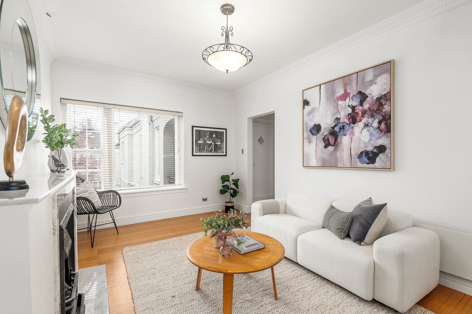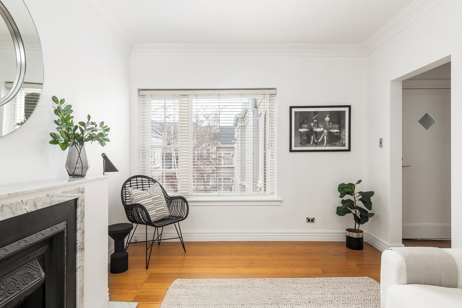 Tucked away behind the leafy elegance of one of Toorak’s most iconic boulevards, this single-bedroom, circa-1940s Art Deco apartment is a peaceful and private hideaway in a coveted Village-edge setting. One of only eight in its building, the residence captures boutique charm from its elevated top-floor position, gazing out to beautifully landscaped communal gardens.