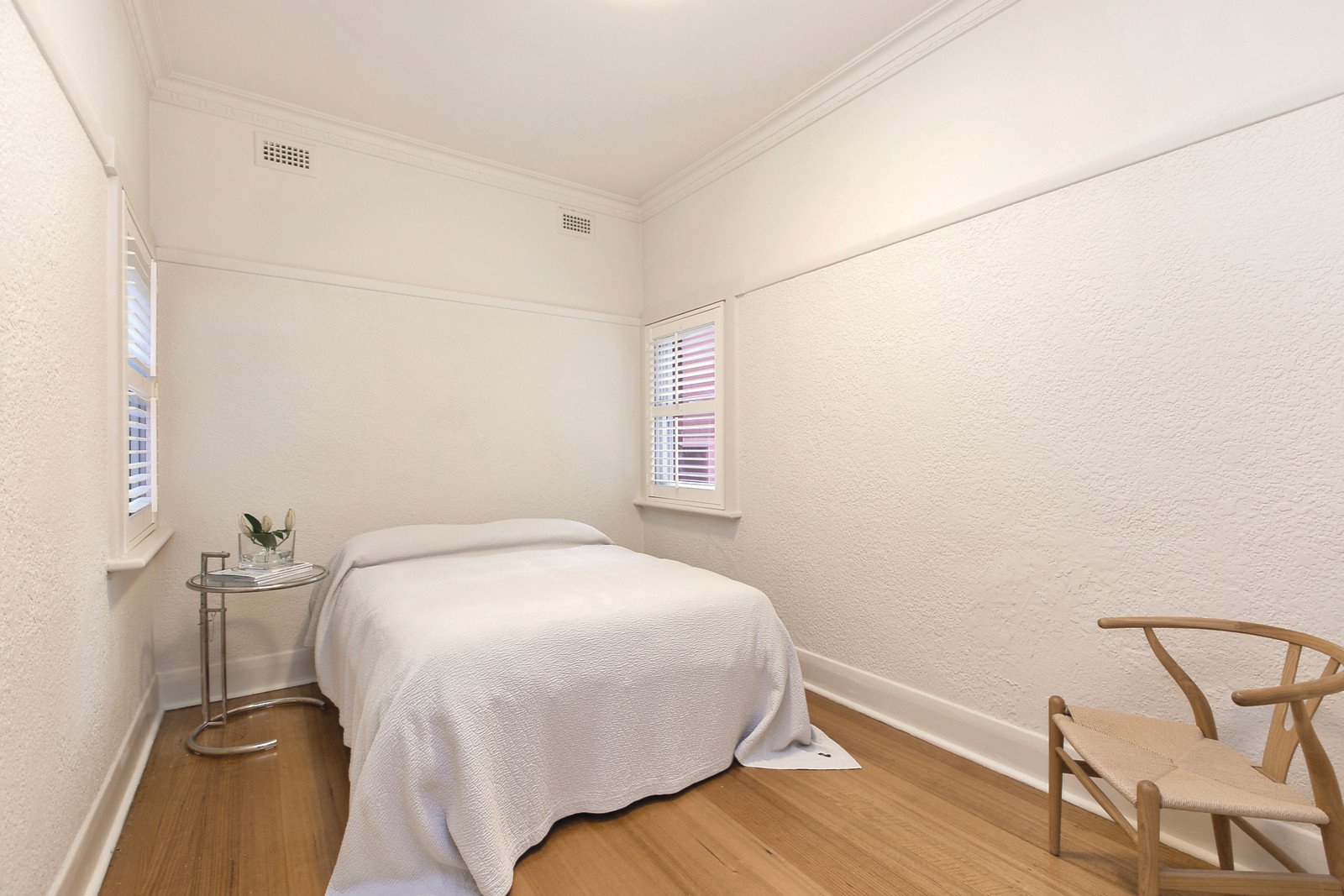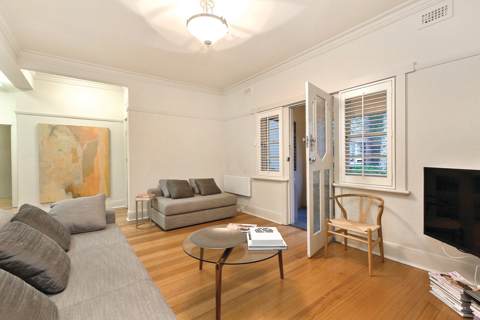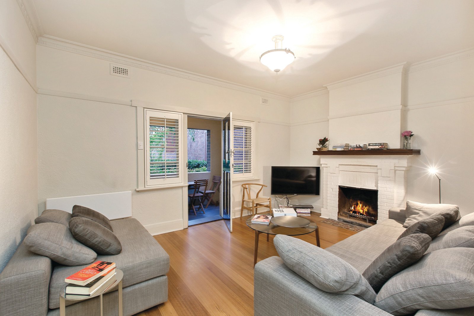 Set to the rear, distinctive Deco windows and ceilings along with timber floors characterize the inviting living room with open fireplace and covered balcony overlooking the garden. The bright modern kitchen features stone benches, a Miele oven and dining area. The two double bedrooms with built in robes share a smart bathroom with original terrazzo floors.