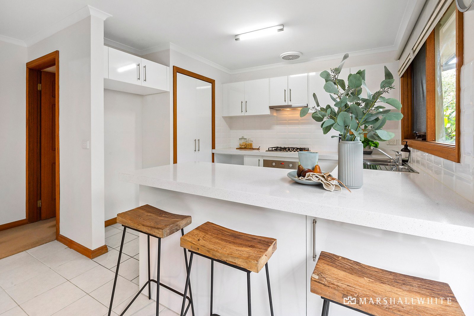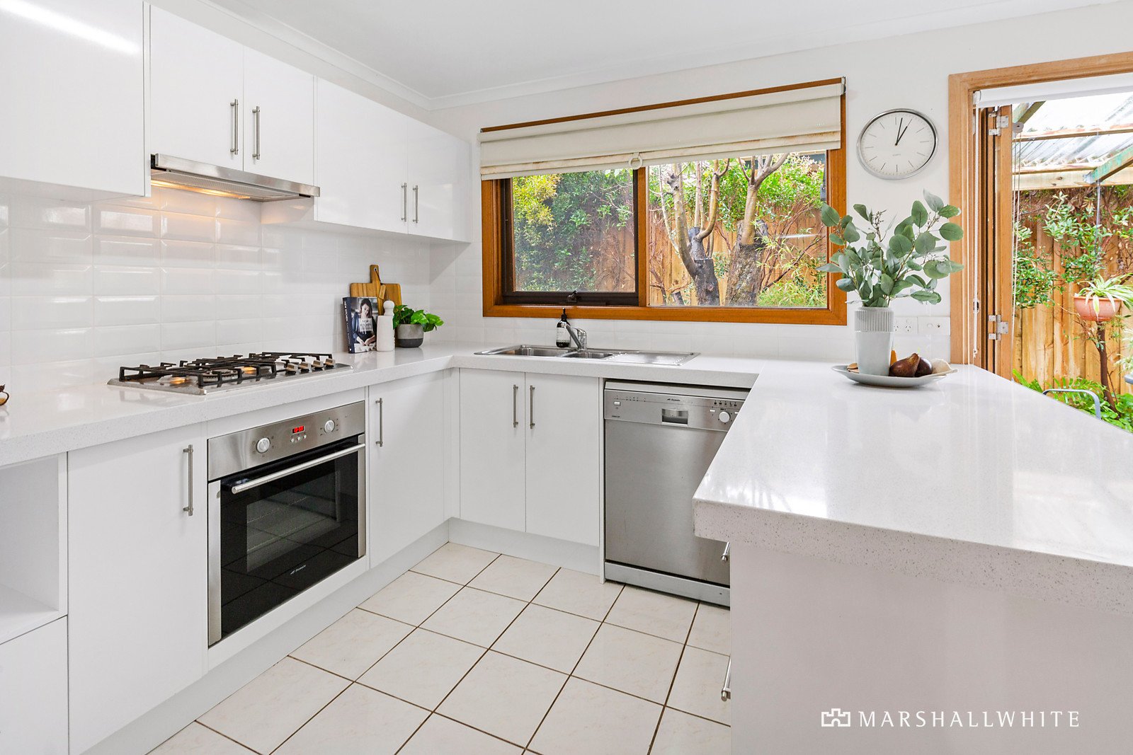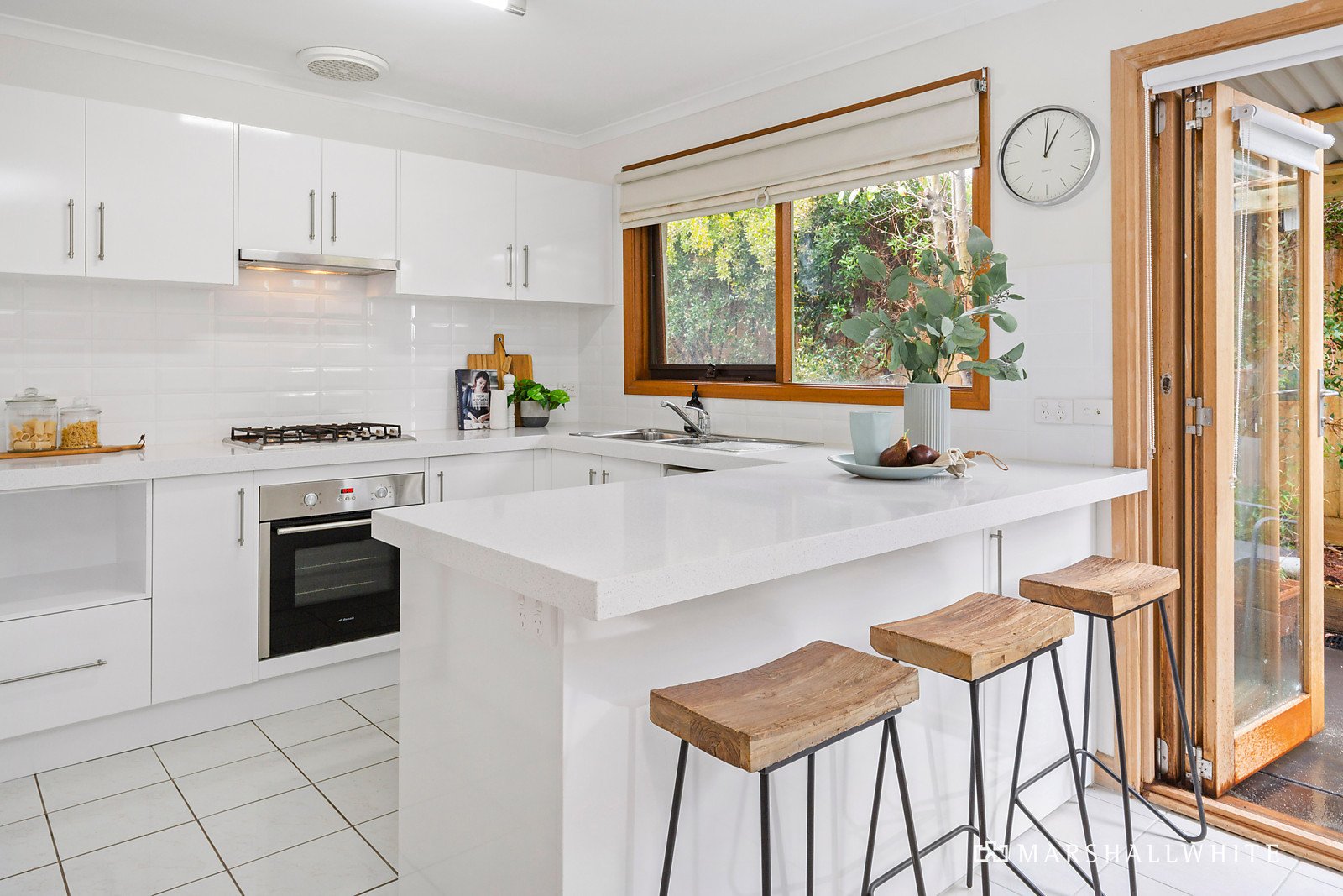 Light-filled and decorative, a bright interior welcomes leafy outlooks across an open lounge and dining zone before a casual meals and renovated kitchen sit atop tiled flooring. Backdropped by greenery, stone benchtops and stainless-steel appliances equip the kitchen for effortless hosting capability, whilst dual outdoor entertaining zones cradle the internal dimensions. Bi-fold doors open to embrace an indoor/outdoor lifestyle, where a sheltered alfresco balance expanding tranquil gardens.