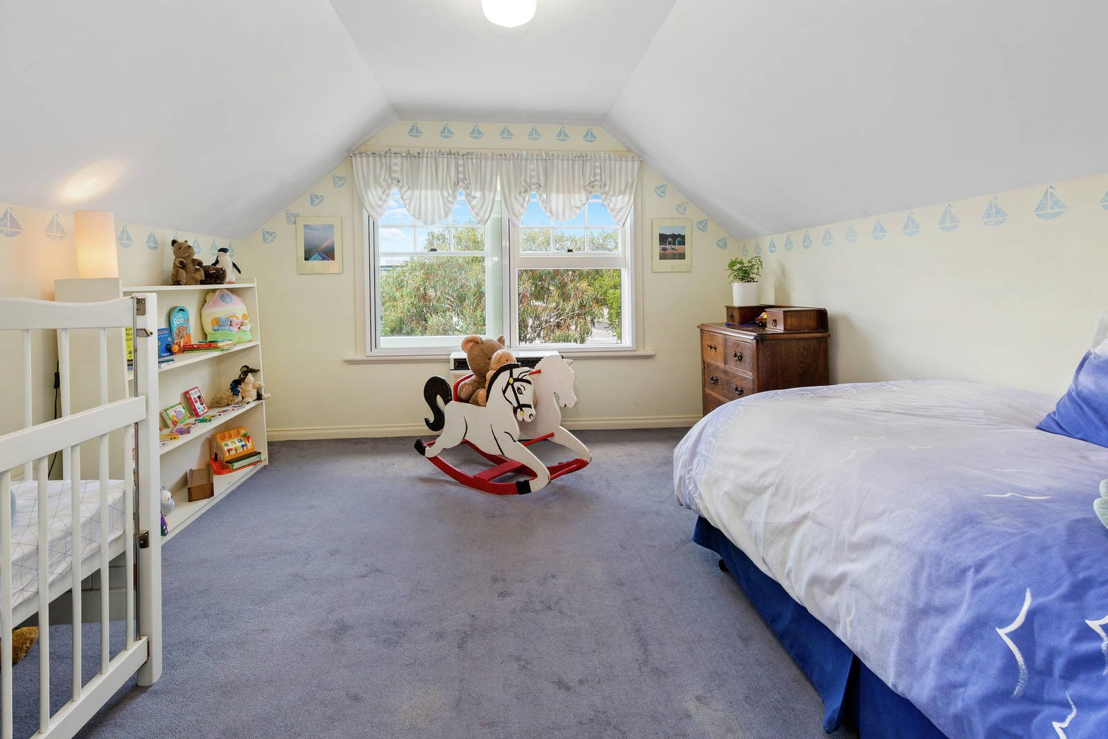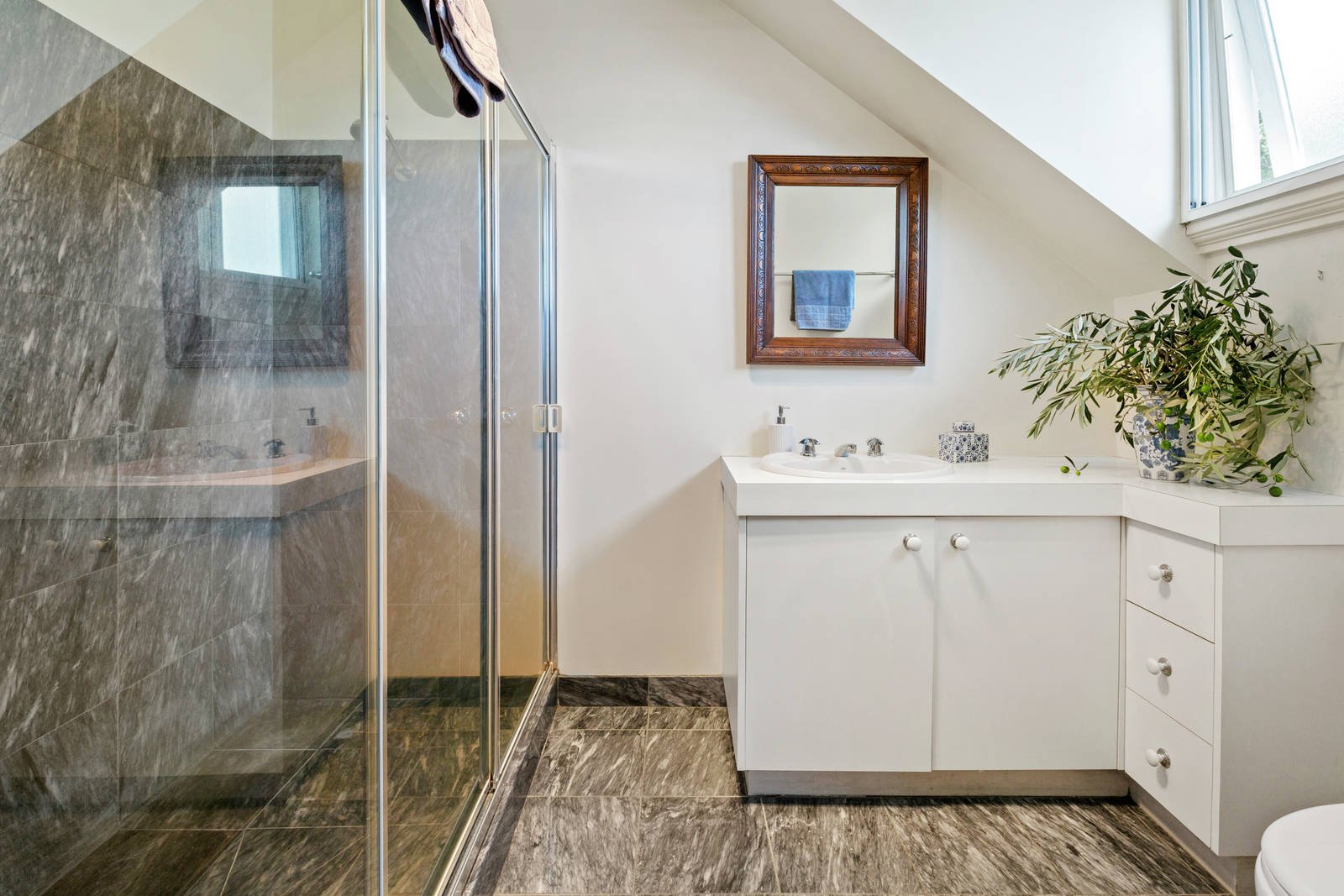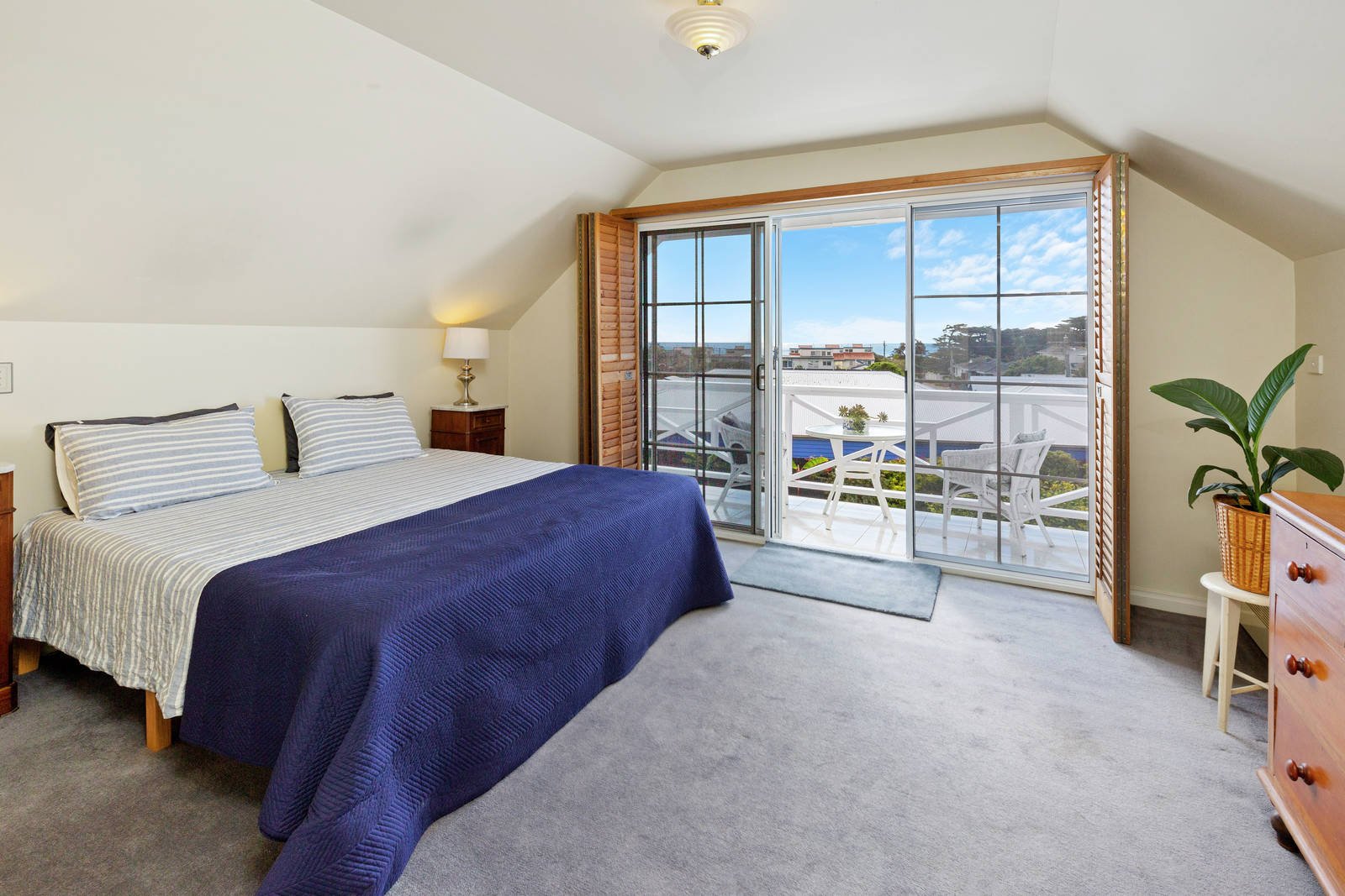 Upstairs three generously proportioned bedrooms and a family bathroom branch off a spacious landing with study nook, the master with walk-in robe, ensuite and private balcony with breathtaking bay views. A large 4th bedroom lies downstairs with walk-in robe and adjacent bathroom with claw foot bath.