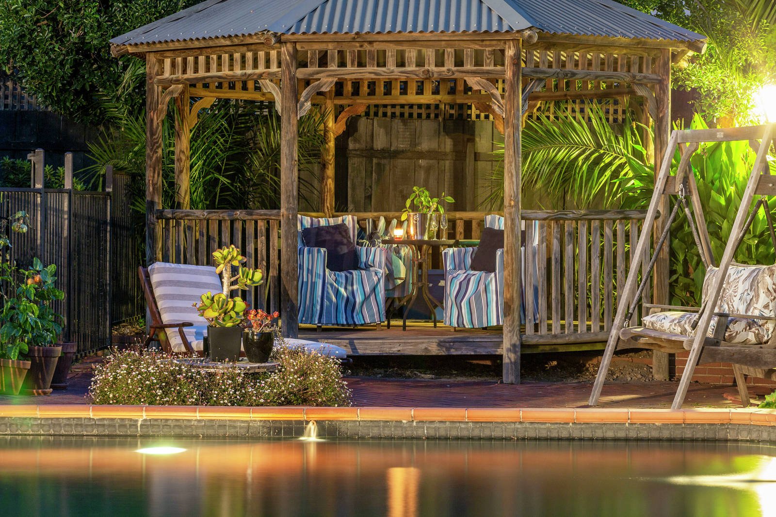 Shaded by mature flowering cherry & gum trees the established front gardens are enchanting, while to the rear a large gas heated inground pool with spa enjoys a picturesque setting amongst the roses, fig and citrus trees with a relaxing poolside rotunda.