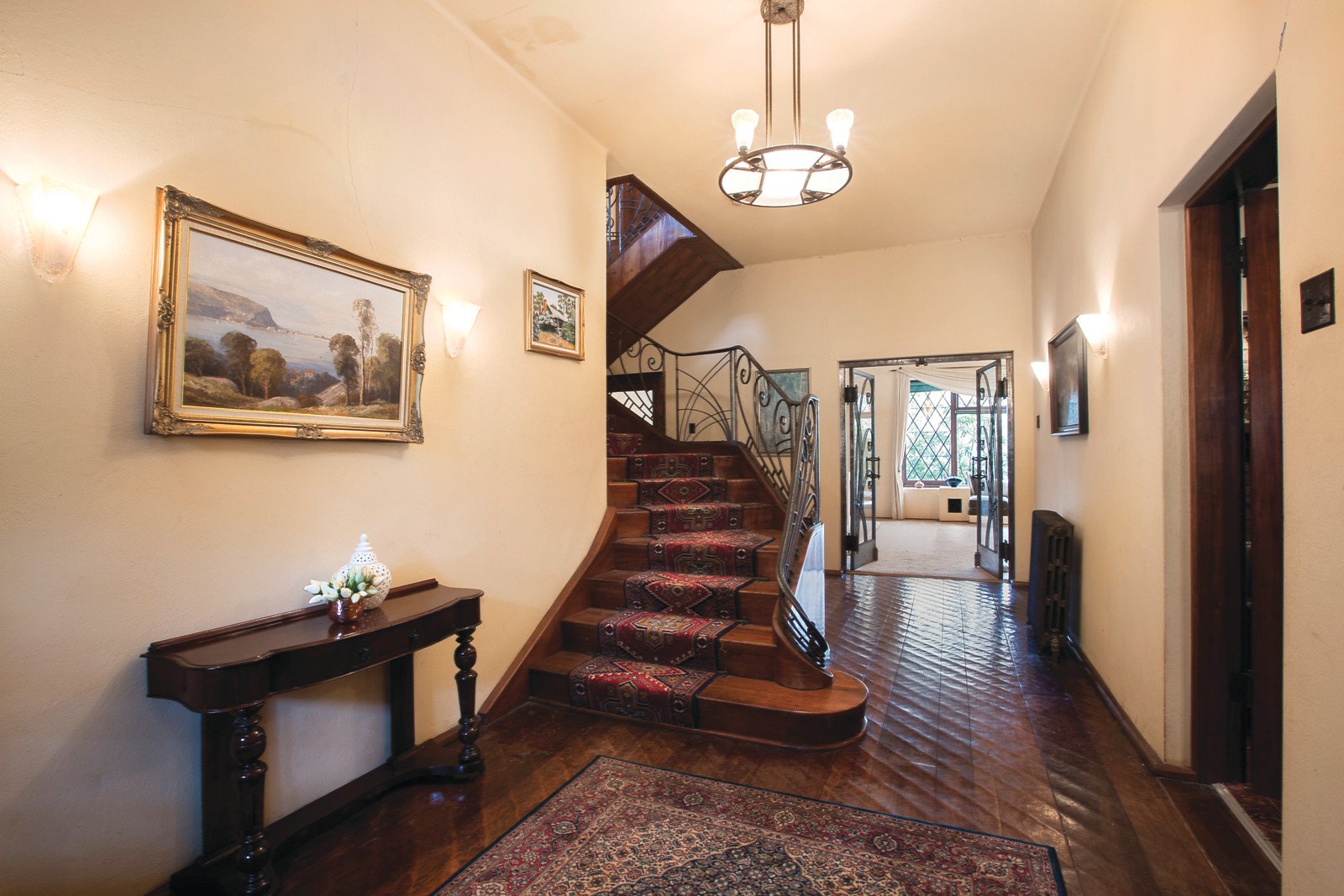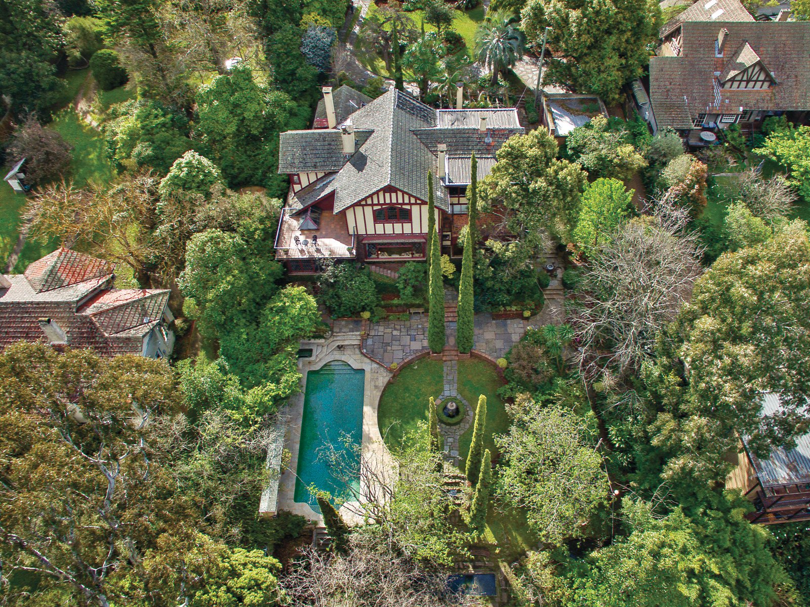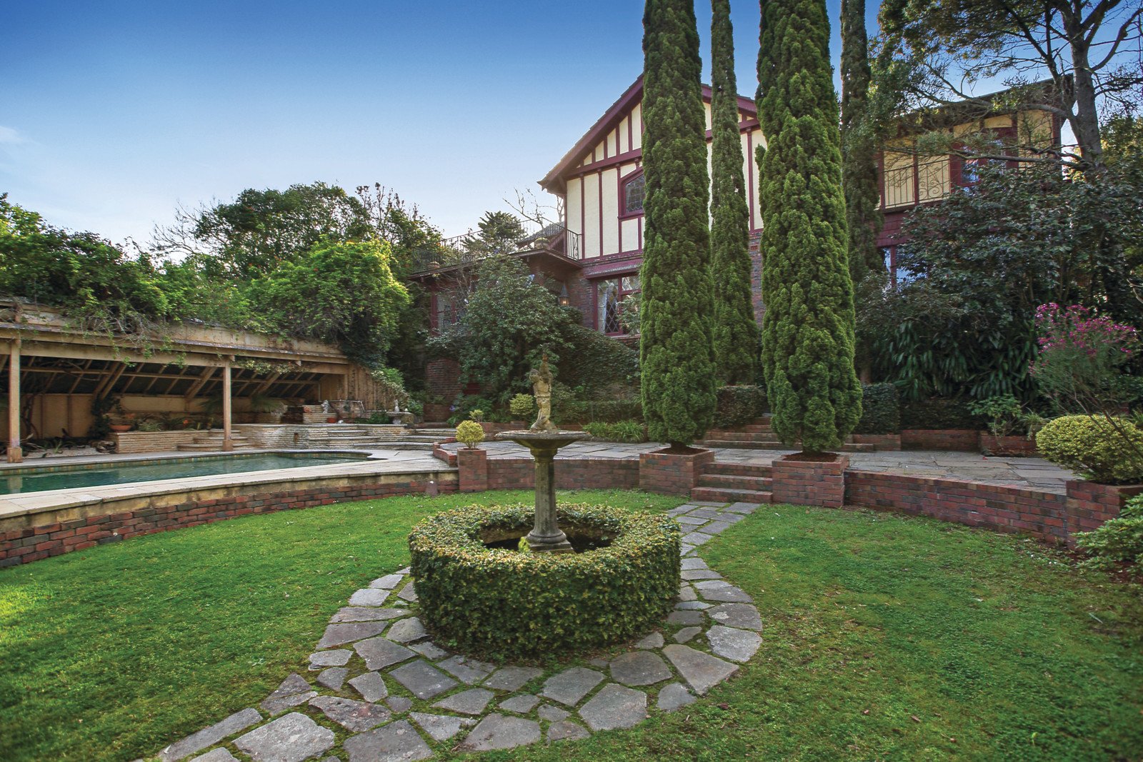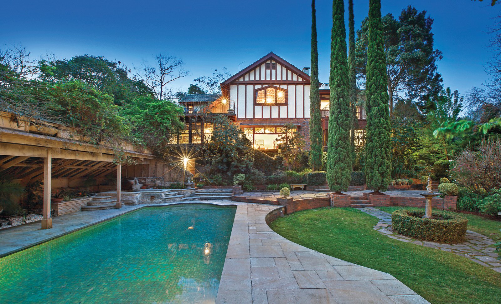 Set well back behind a return drive, the reception hall featuring adzed timber floors and leadlight windows introduces an atmospheric library, gracious sitting room and formal dining room all with open fireplaces. The large well-appointed kitchen is adjacent to a family living and dining room with open fireplace. A beautifully crafted timber staircase leads up to a ballroom or billiards room of palatial scale boasting soaring cathedral timber ceilings, open fireplace and large terrace offering wonderful bushy views. An abundance of accommodation comprises a downstairs main bedroom with open fireplace, walk in robe and en-suite, a second bedroom with en-suite, open fireplace and walk in robe, three additional bedrooms, 6th bedroom or study, study/retreat and two bathrooms. A sunny conservatory opens to the picturesque botanic gardens with pool, spa, water features and winding paths leading down to private picnic areas on the banks of the Yarra.