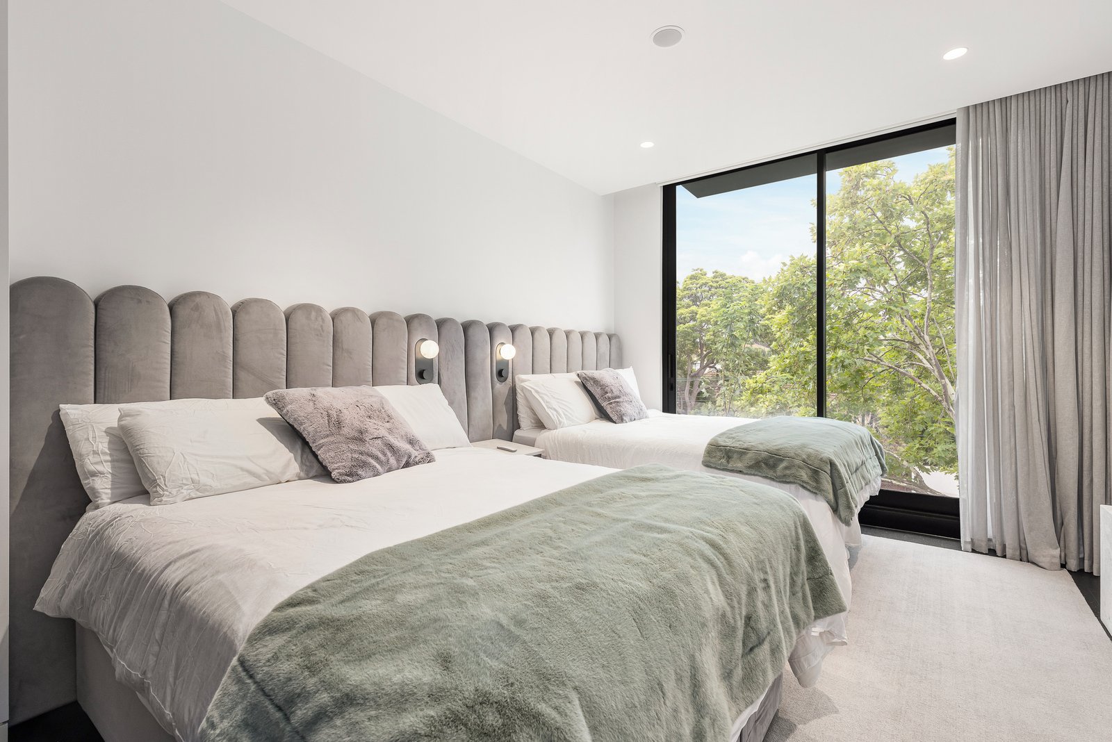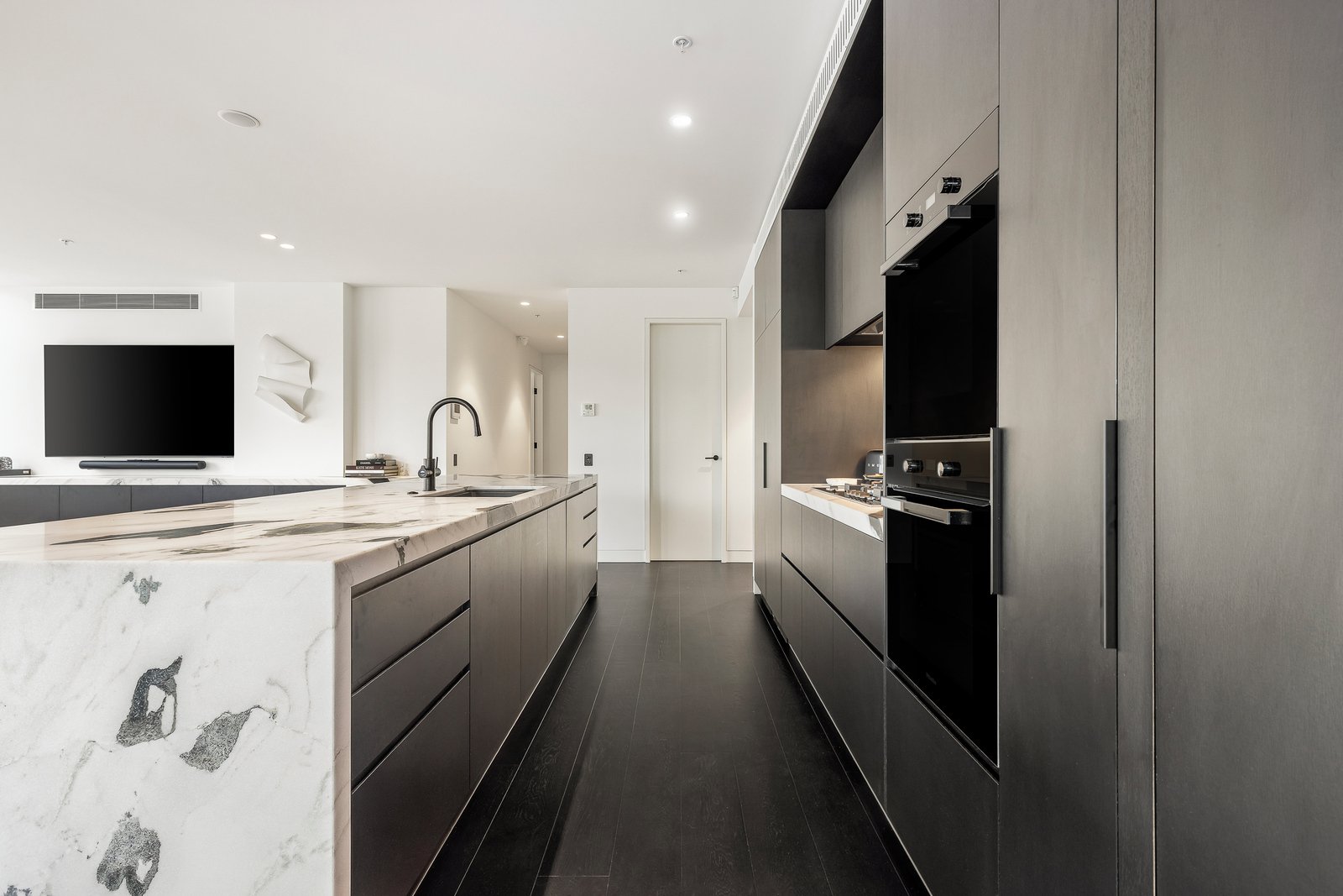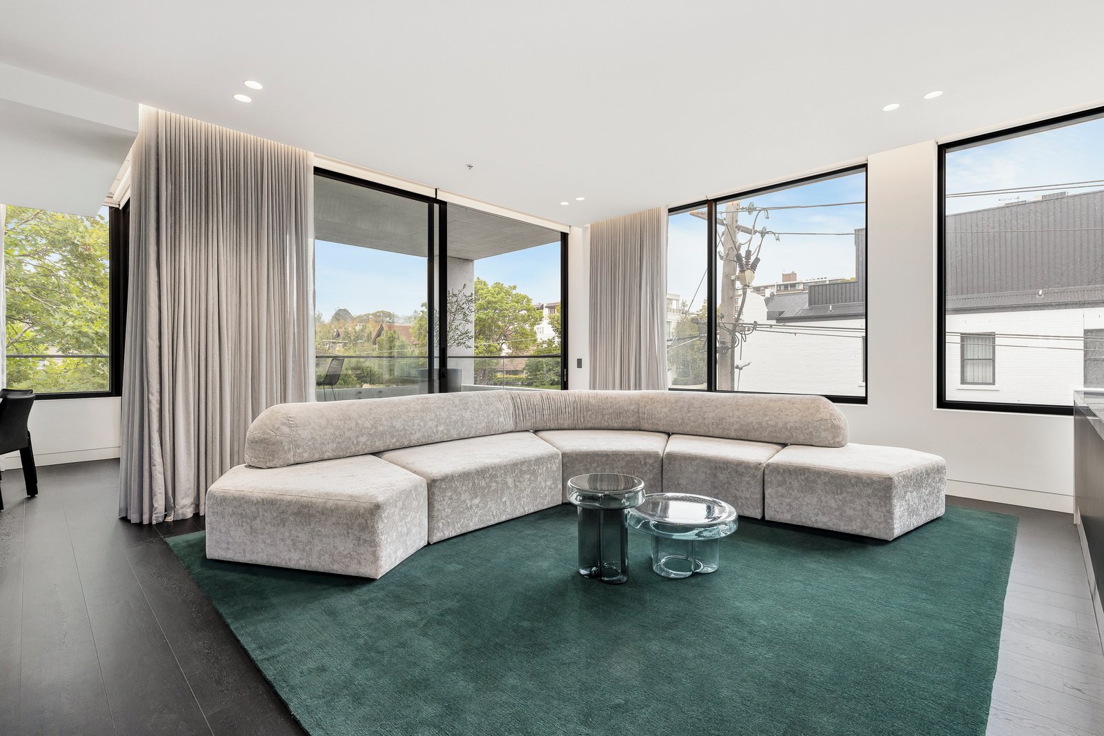 A refined off form concrete façade introduces interiors of striking sophistication, where dark oak flooring flows through a generous entrance hall into an expansive open plan living and dining domain. Framed by full height glazing and leafy outlooks, the space connects seamlessly to a large undercover balcony, creating an idyllic setting for year round indoor outdoor entertaining.