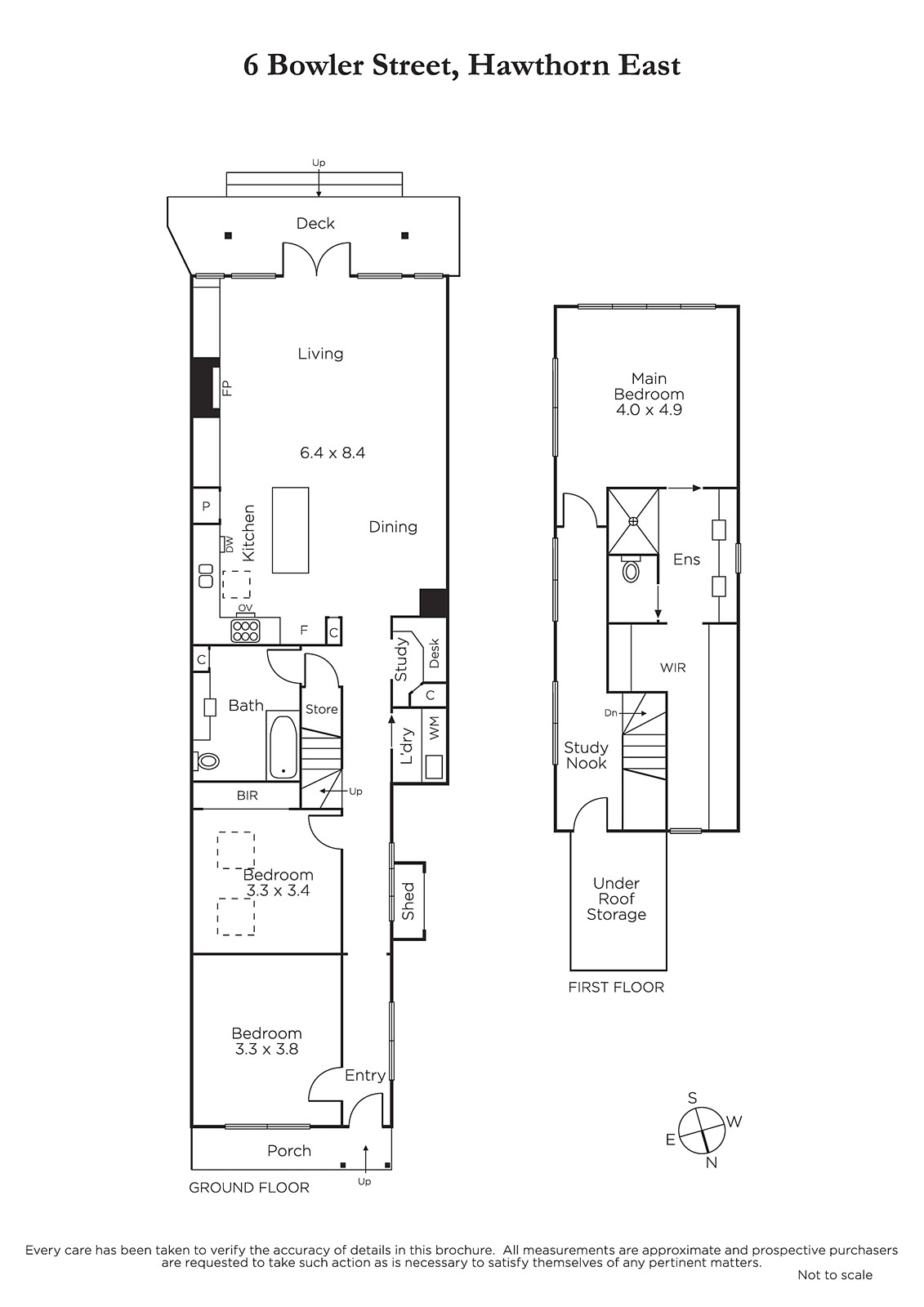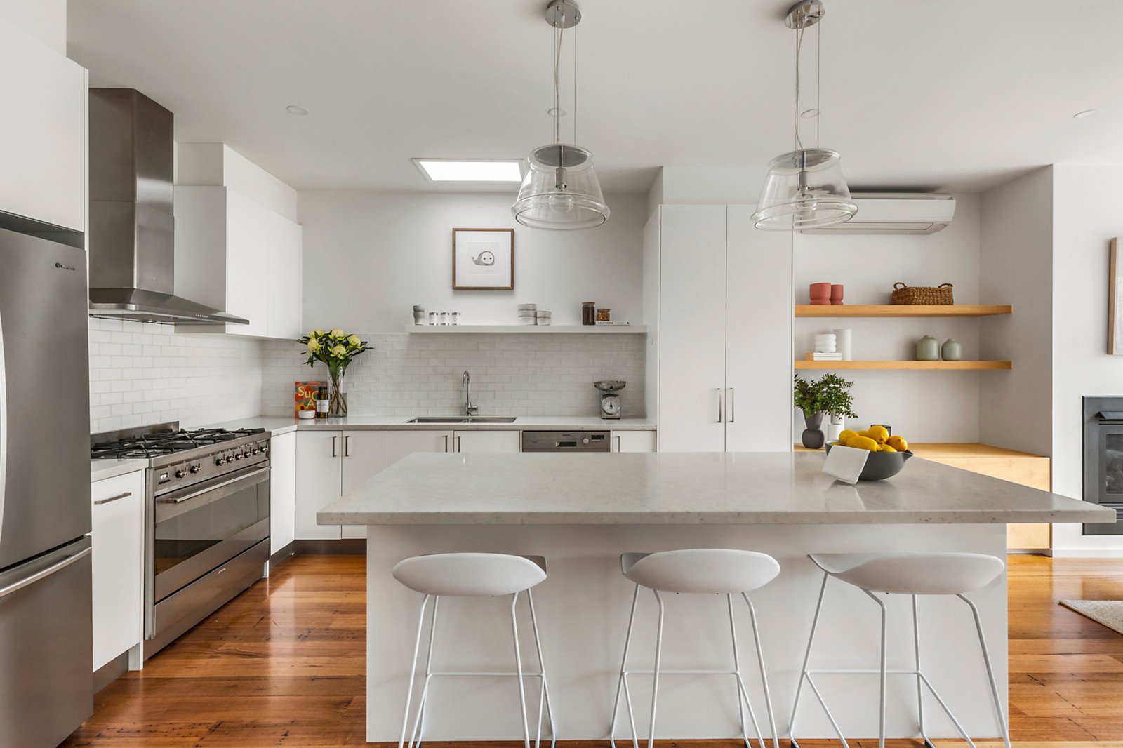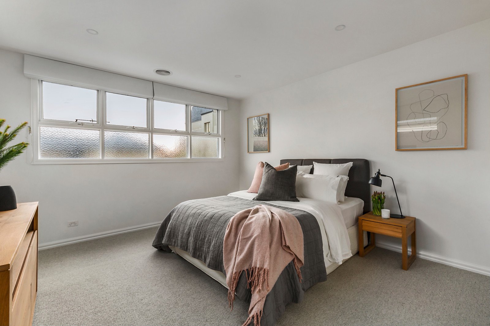 Hardwood floors flow through the arched hall to two beautiful bedrooms with built in robes, a stylish bathroom and fitted study area. The stunning main bedroom with chic en suite, generous walk in robe and a study nook enjoys its own space upstairs. Bathed in natural light, the expansive open plan living and dining room with a gas log fire and gourmet kitchen appointed with stone benches and European appliances opens through French doors to a private easily maintained garden with leafy surrounds and a BBQ deck.