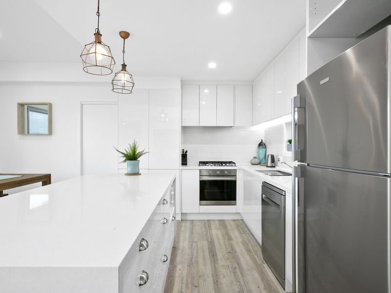 A deluxe white-on-white kitchen gleaming with stone benchtops & soft-close drawers boasts a full suite of S/S European appliances & dishwasher & breakfast bar.