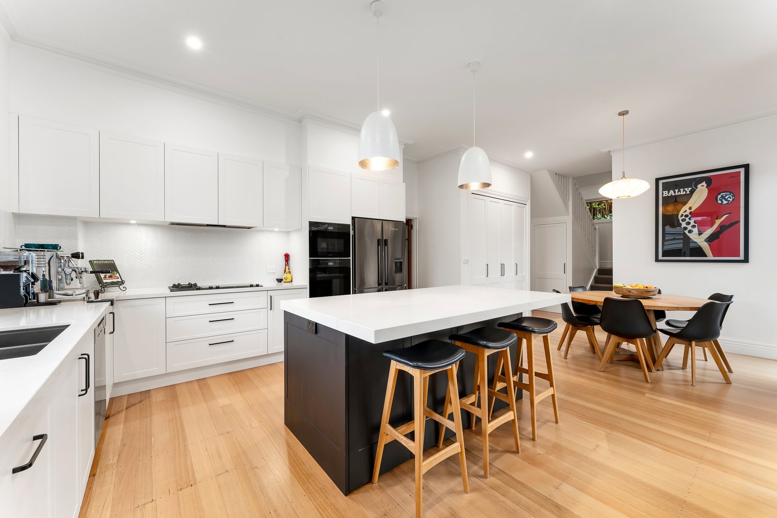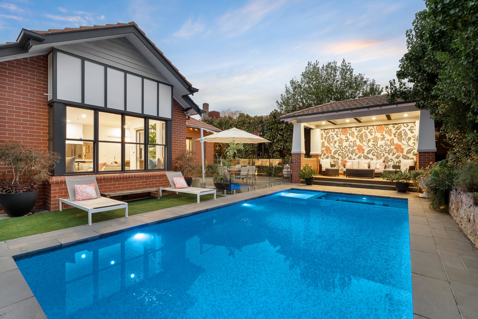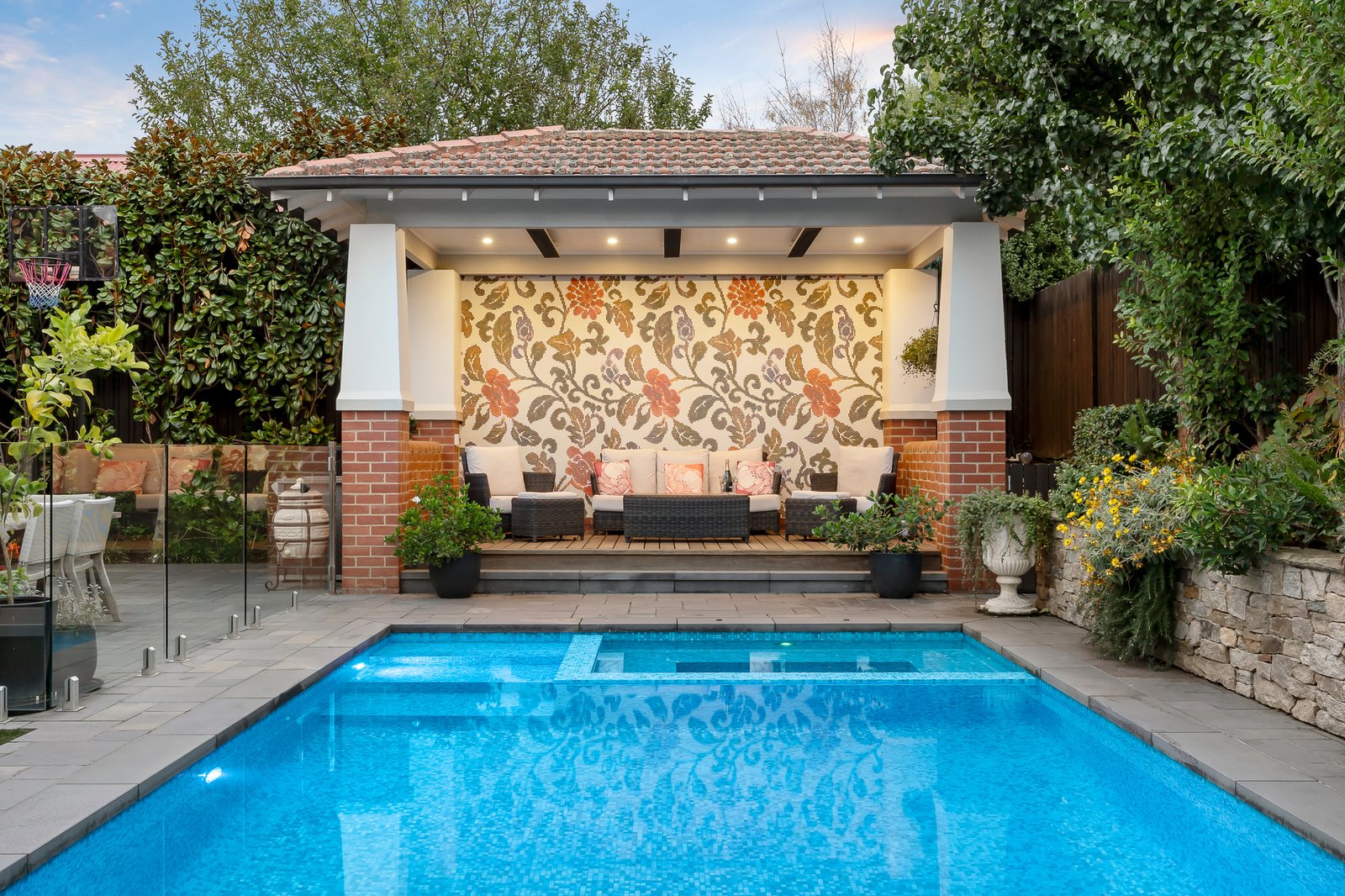 The picturesque street profile is matched inside with ornate ceilings, Baltic pine floors and leadlight windows in the wide central hall and formal sitting room with a bay window and open fire. Streaming with northern light, the expansive living and dining room with an open fire and window seat is superbly catered to by a premium kitchen appointed with stone benches, Miele and Gaggenau appliances including induction cooktop and steam oven and a fitted bar with wine fridge. Glass sliders open to the glorious north-facing landscaped garden with extensive bluestone paving, picturesque solar/gas heated, self-cleaning pool and spa and a spectacular al fresco dining and entertaining pavilion set against a striking Italian mosaic feature wall.