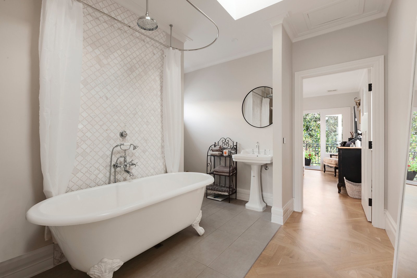Further at ground level is a stylish bathroom and a brilliant lounge with French doors revealing a secluded landscaped courtyard including Jarrah entertainment deck, gas BBQ point and heat lamps with a leafy parkland backdrop. Upstairs is a light-filled parents' retreat featuring bedroom and a park-side terrace, built-in robes, sublime ensuite with Victoria & Albert freestanding bath plus a sunny New York-style rooftop balcony.