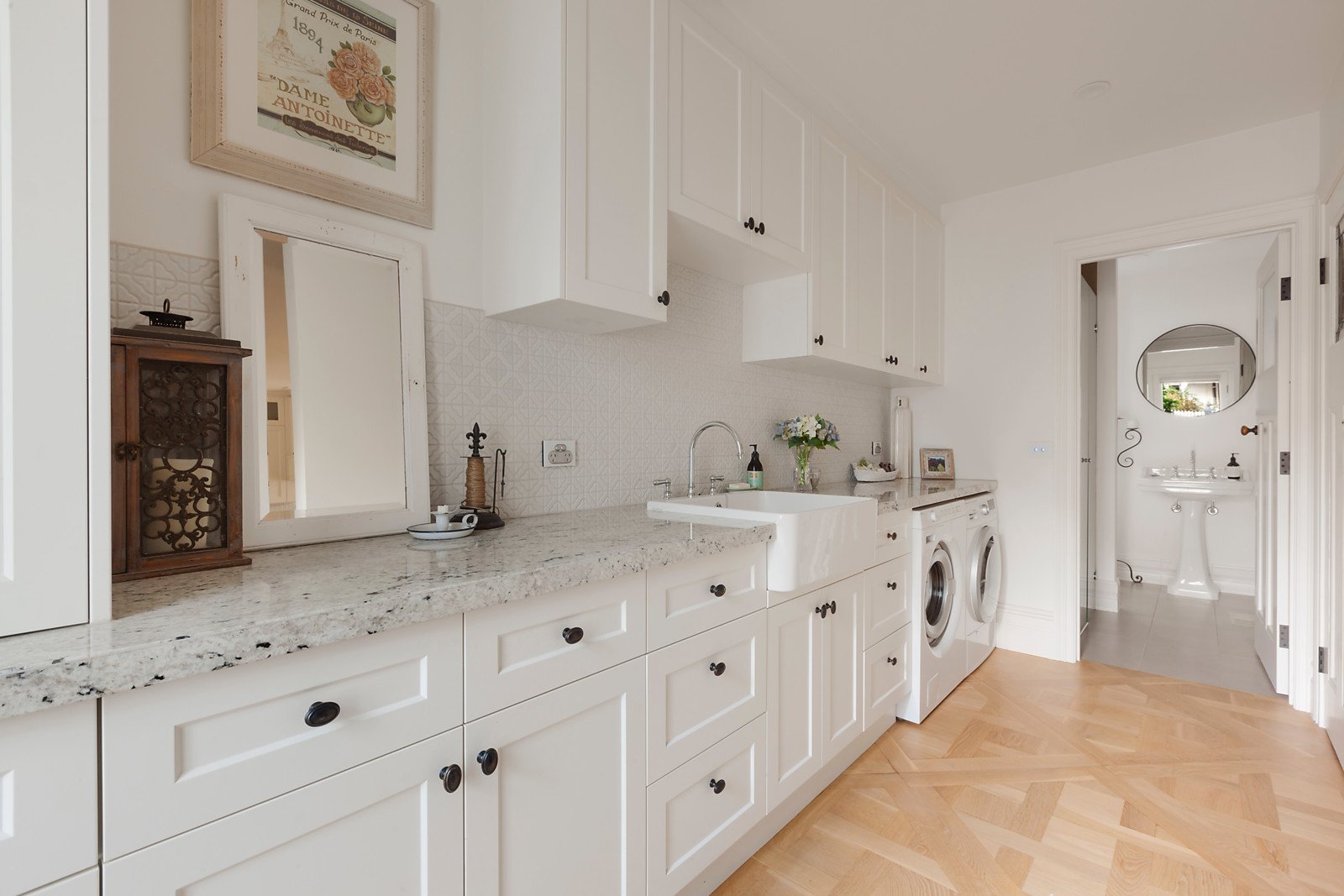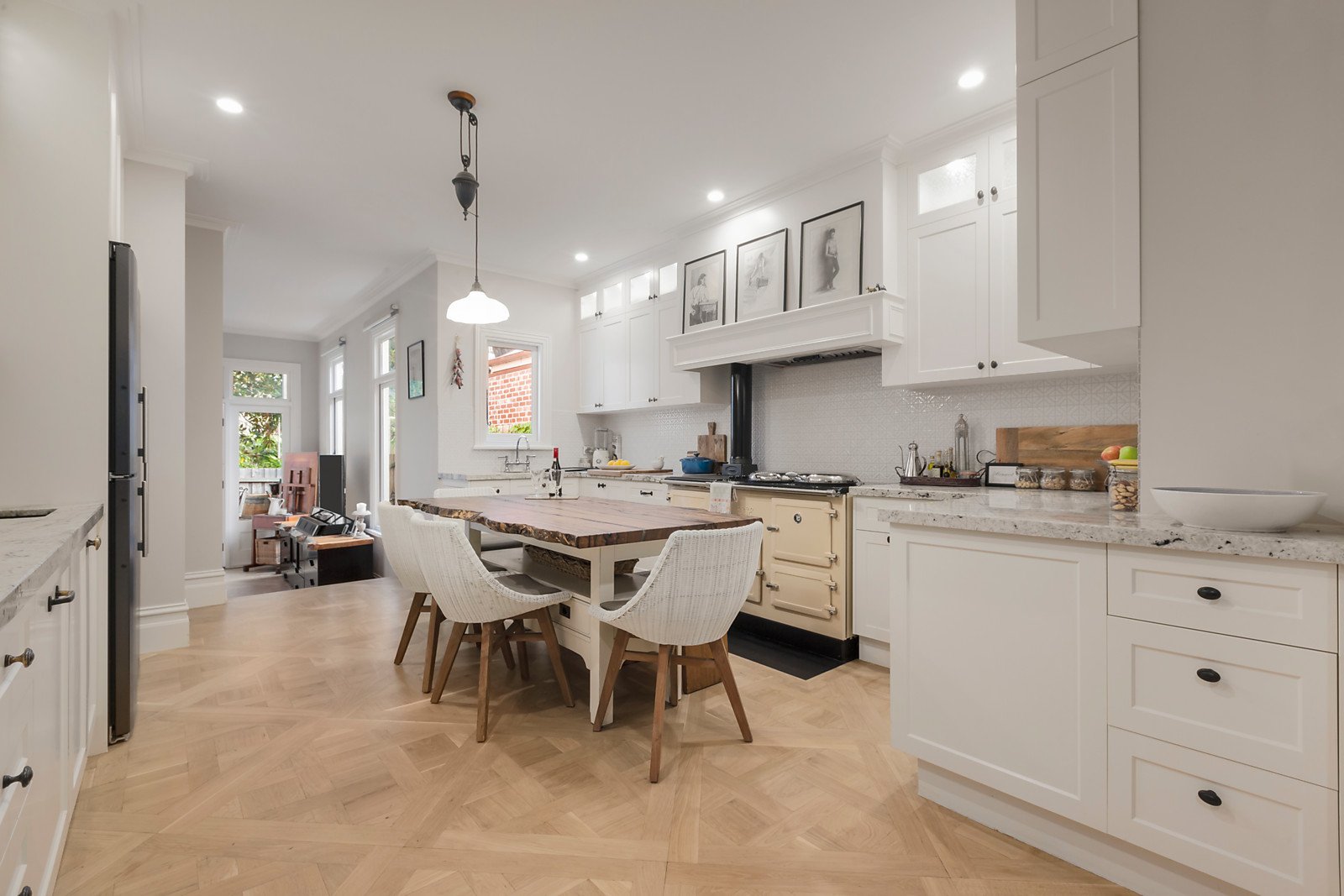 Beyond its attractively traditional façade, stunning American Oak parquetry lines an inviting arched hallway and high ceilings that extends to two sizable bedrooms with open fireplaces and a 3rd bedroom (possible dining room or home office) before the outstanding centrepiece of the home, a luxury granite-topped kitchen boasting an Esse wood fire stove and an Esse electric range cooker, Miele dishwasher, Zip tap (boil/chill/sparkle) and butler's pantry with Villeroy & Boch ceramic country sink.
