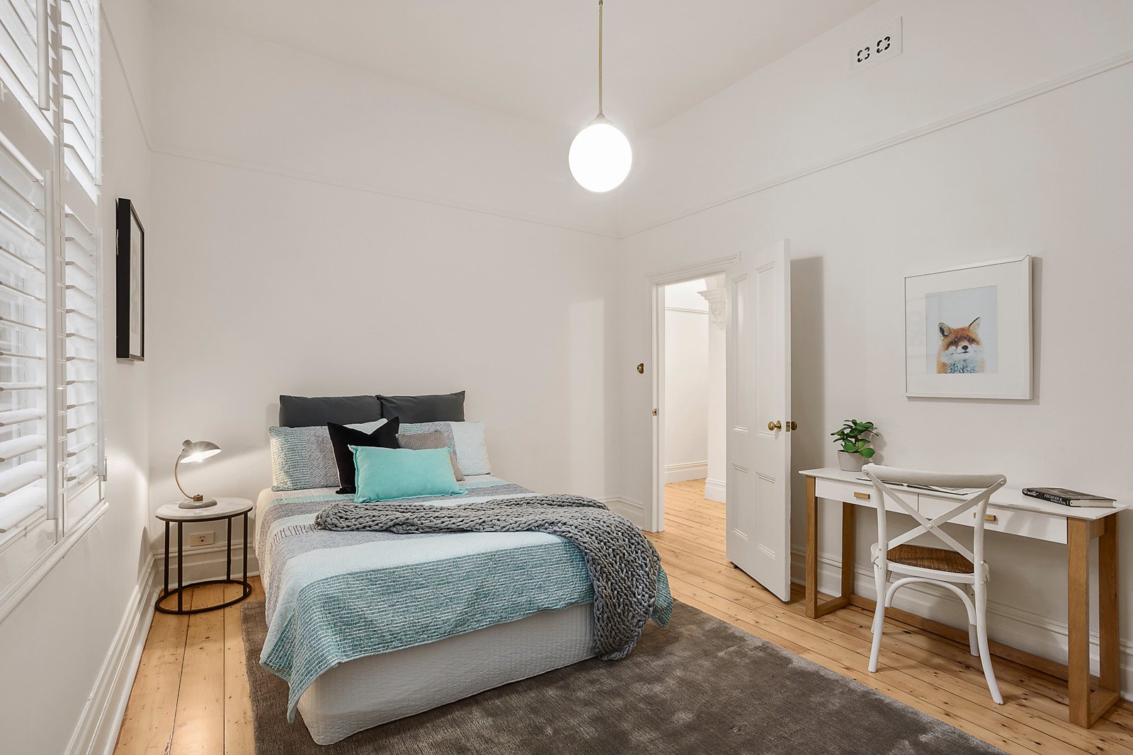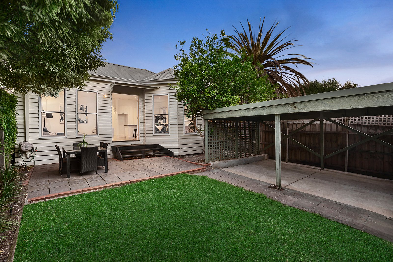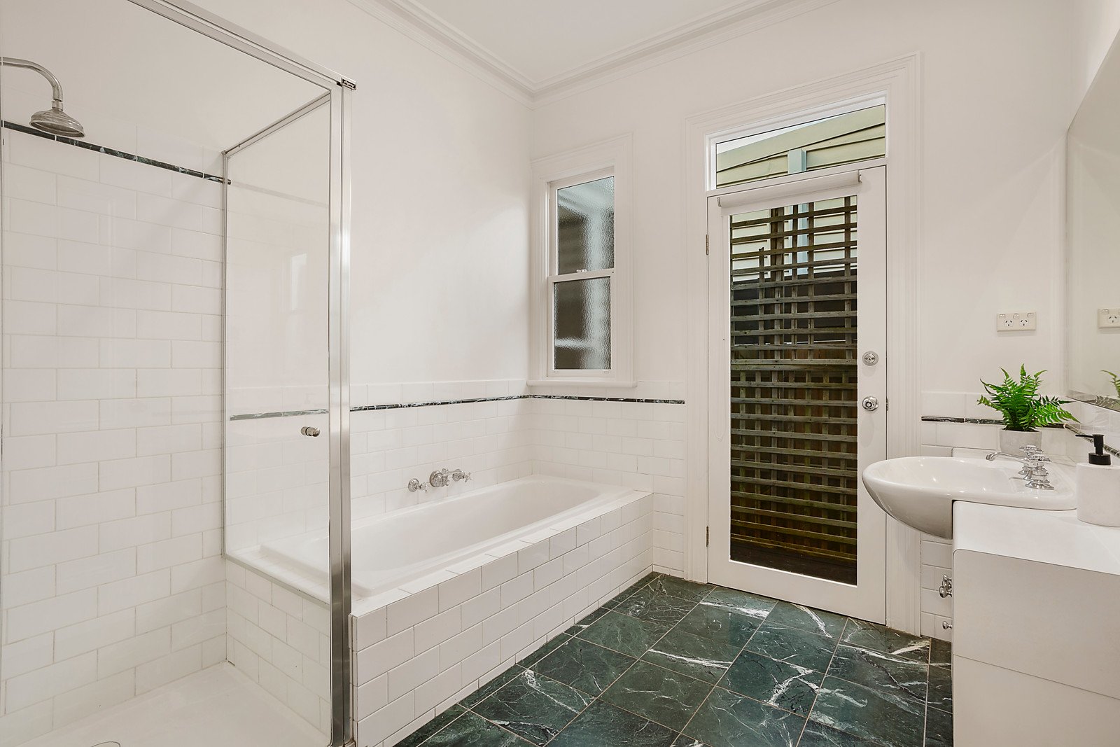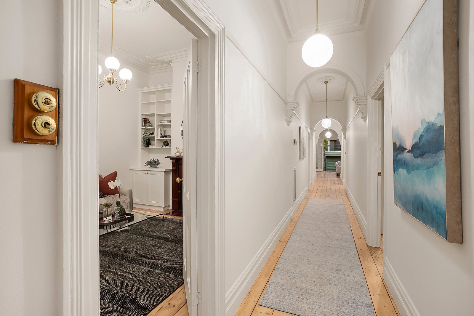 Baltic pine floors flow through the central arched hall to an elegant sitting room/4th bedroom with open fire, the main bedroom with open fire, walk in robe and en suite, two additional bedrooms and a second bathroom. The sun-drenched open plan living and dining room with a well-equipped granite kitchen and open fire opens through French doors to a leafy northwest garden with paved terrace and carport accessed via rear lane.