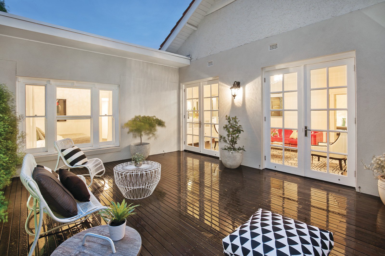 Dark timber floors and ornate ceilings are superbly combined in the gorgeous sitting room warmed by a gas fireplace and opening through two sets of French doors to a secluded, sun-lit courtyard. A raked ceiling adds to the scale of the expansive open-plan living and dining room with a gas fireplace and stunning gourmet kitchen appointed with marble and stone benches, Ilve oven with 6 burner cooktop and scullery/laundry. Full width glass sliders open to the entirely private landscaped garden and bluestone outdoor entertaining area with water feature, surrounded by rows of Manchurian Pear trees. The lavish master bedroom with built in robes and stylish en-suite is in its own space away from two additional double bedrooms with built in robes, a designer bathroom and a fabulous freestanding retreat or 4th bedroom with adjoining studio.