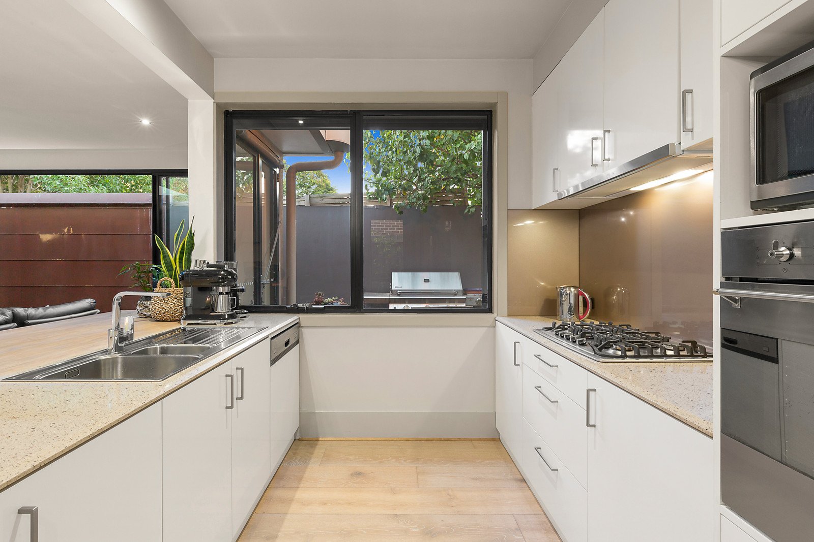 Underscored by soaring ceilings and engineered oak floors, a wide hallway introduces effortless open plan living and dining with gas fireplace, comprising two zoned living spaces and meals area adjacent to a sleek, stone bench entertainers kitchen containing stainless steel appliances and integrated dishwasher. Sky lights and bi fold doors provide seamless indoor/outdoor entertaining flowing into a covered alfresco area, leading to spacious manicured garden surrounds within a private courtyard. Thoughtful family accommodation comprises three generous bedrooms with built in robes, main conveniently situated on the ground floor featuring walk in robe and en suite with rainfall shower and heated towel racks, while first floor environs are complimented by an expansive retreat space for a home office or optional third living area and a cleverly appointed central bathroom. Additional conveniences include reverse cycle heating/cooling, solar panels, water tank, fans in each living space and all bedrooms, intercom, security system, powder room, laundry with ample storage and secure double garage plus off street car space.
