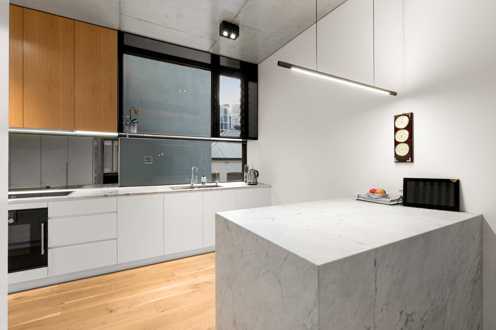Bespoke features including oak and polished concrete floors, slatted timber, natural stone and custom joinery are highlighted throughout while floor to ceiling double glazing ensures every inch is bathed in natural light. Beneath an elevate concrete ceiling, the generous living room with a Juliet balcony is adjacent to the inviting dining space with built in seating and the sleek premium kitchen appointed with Carrara marble benches, Gaggenau appliances and an integrated fridge/freezer. The luxurious main bedroom with lavish stone ensuite and an abundance of robes is matched by two additional double bedrooms with built in robes and stylish ensuites. A versatile and spacious second living space with home office, powder-room and wet bar opens through bi-fold doors to a fabulous al fresco dining deck with built in BBQ.