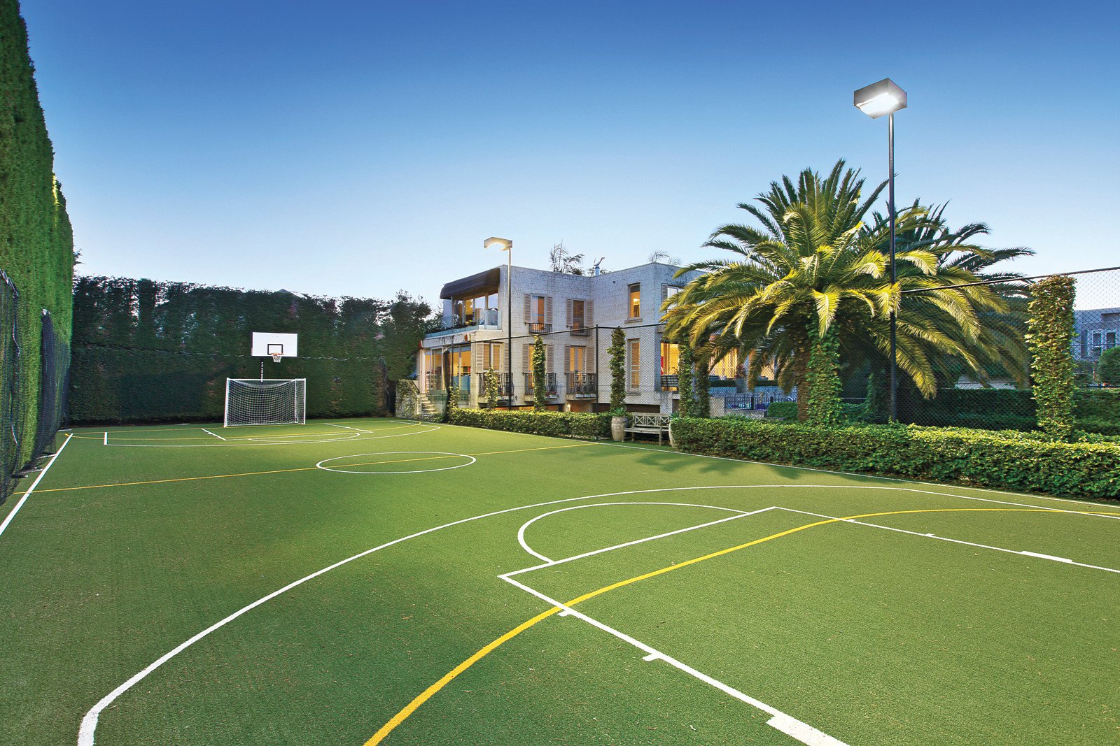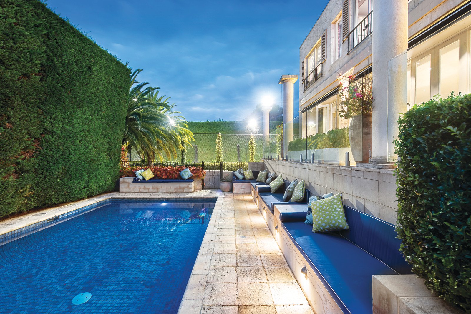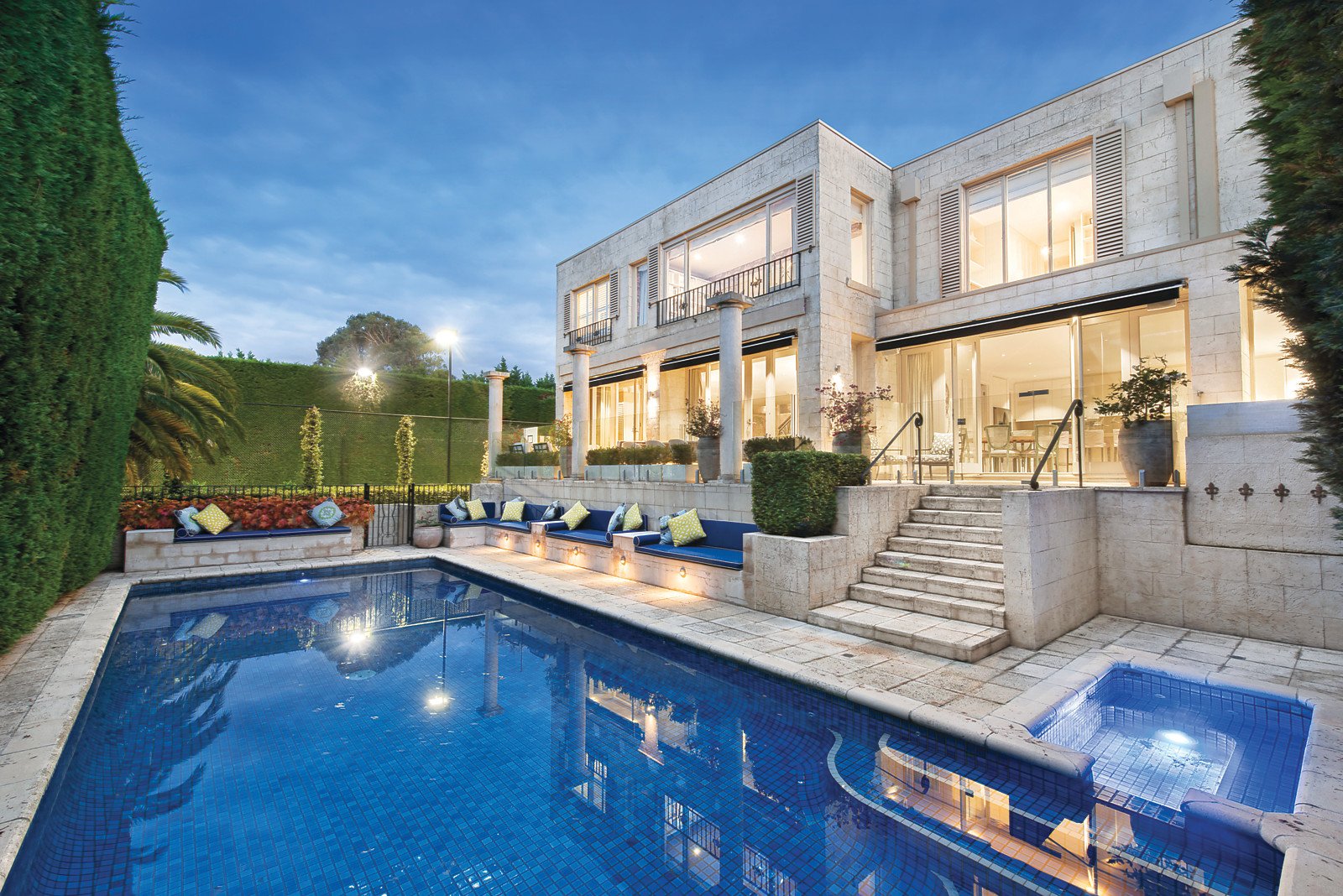 Distinguished by three breathtaking living zones, this abode encompasses spectacular formal and family living zones, with dual fireplaces and beautiful custom fitted storage. Full height glass sliding doors offer unfettered views of the unmatched shaded alfresco terrace and pristine lap pool with spa. The spacious limestone terrace encapsulates an ideal ambience for relaxation, alfresco dining and lavish entertaining. A third living space acts as a sizeable rumpus room or study with direct external access to an impressive outdoor sports field that can be used for soccer, basketball or tennis. Luxurious living is complemented by an epicurean Miele kitchen featuring sleek stone benchtops, floor-to-ceiling cabinetry and a caterer's pantry. Immaculately appointed interiors are elegantly enhanced by honey coloured limestone and recycled oak parquetry flooring as well as granite, marble and limestone benchtops.