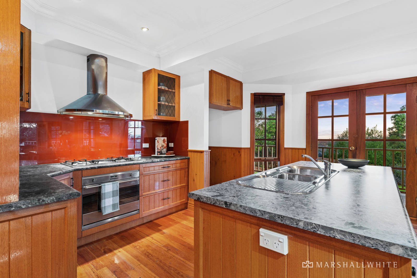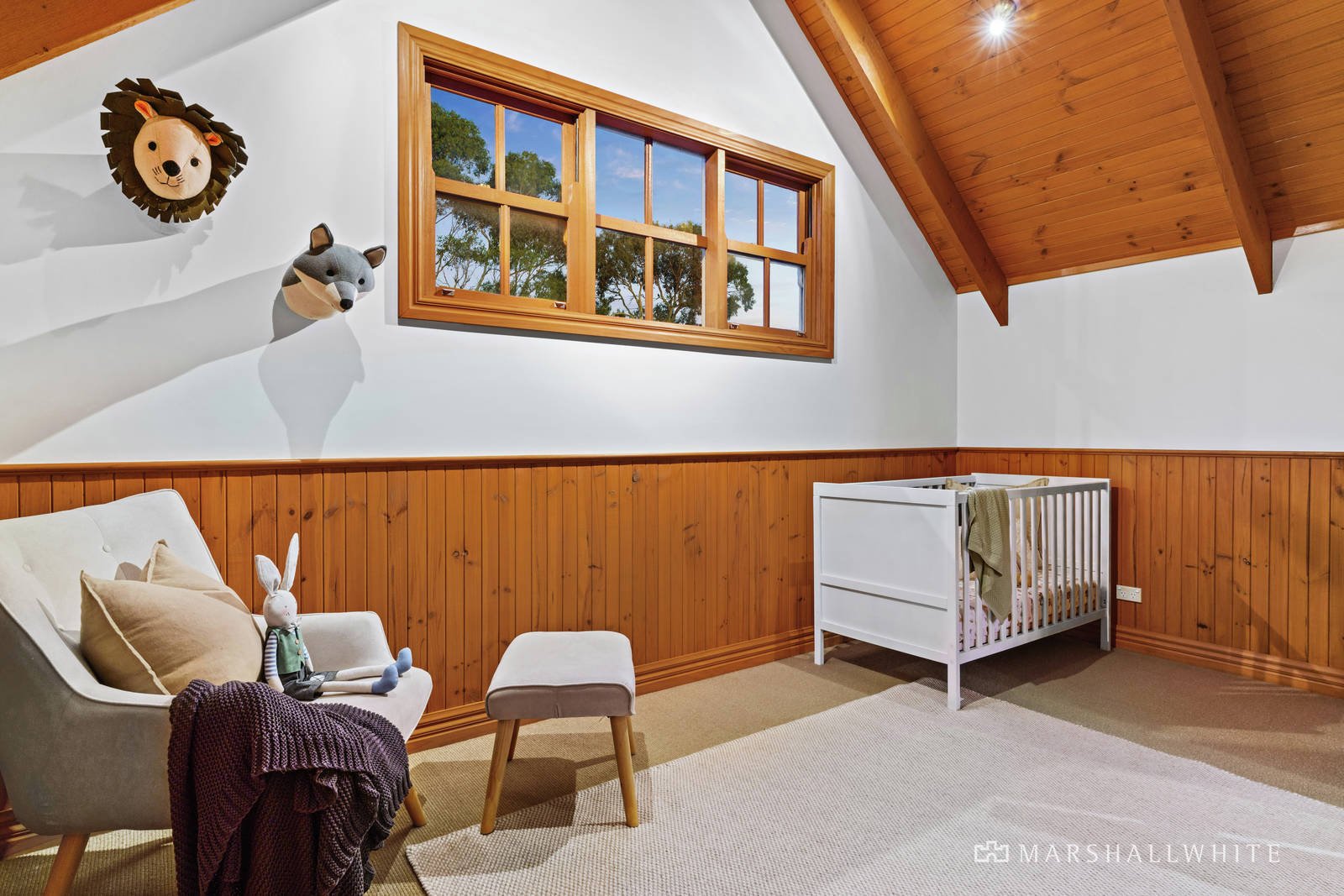 Gleaming with polished hardwood timber flooring, the two-storey layout begins with a ground-floor entry hall that opens to a light-filled front lounge and extends along a central hallway to the expansive open-plan living/dining area and gourmet kitchen. A wood fireplace provides a cozy ambience to the front lounge, and multi-pane timber windows throughout add to the country-house charm while soaring, timber-lined cathedral ceilings in the upper level enhance the home's generously proportioned dimensions.