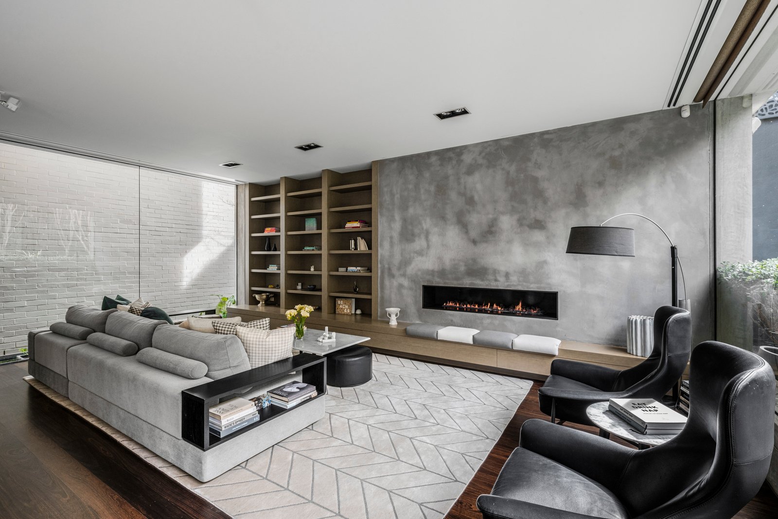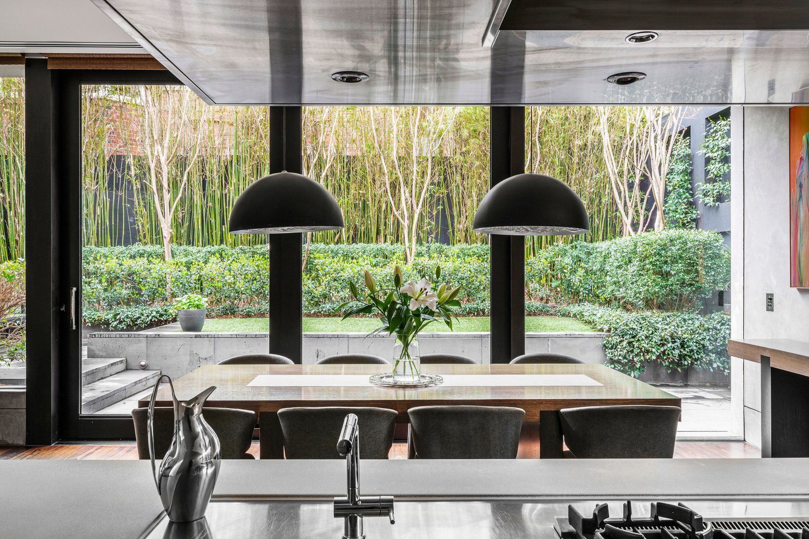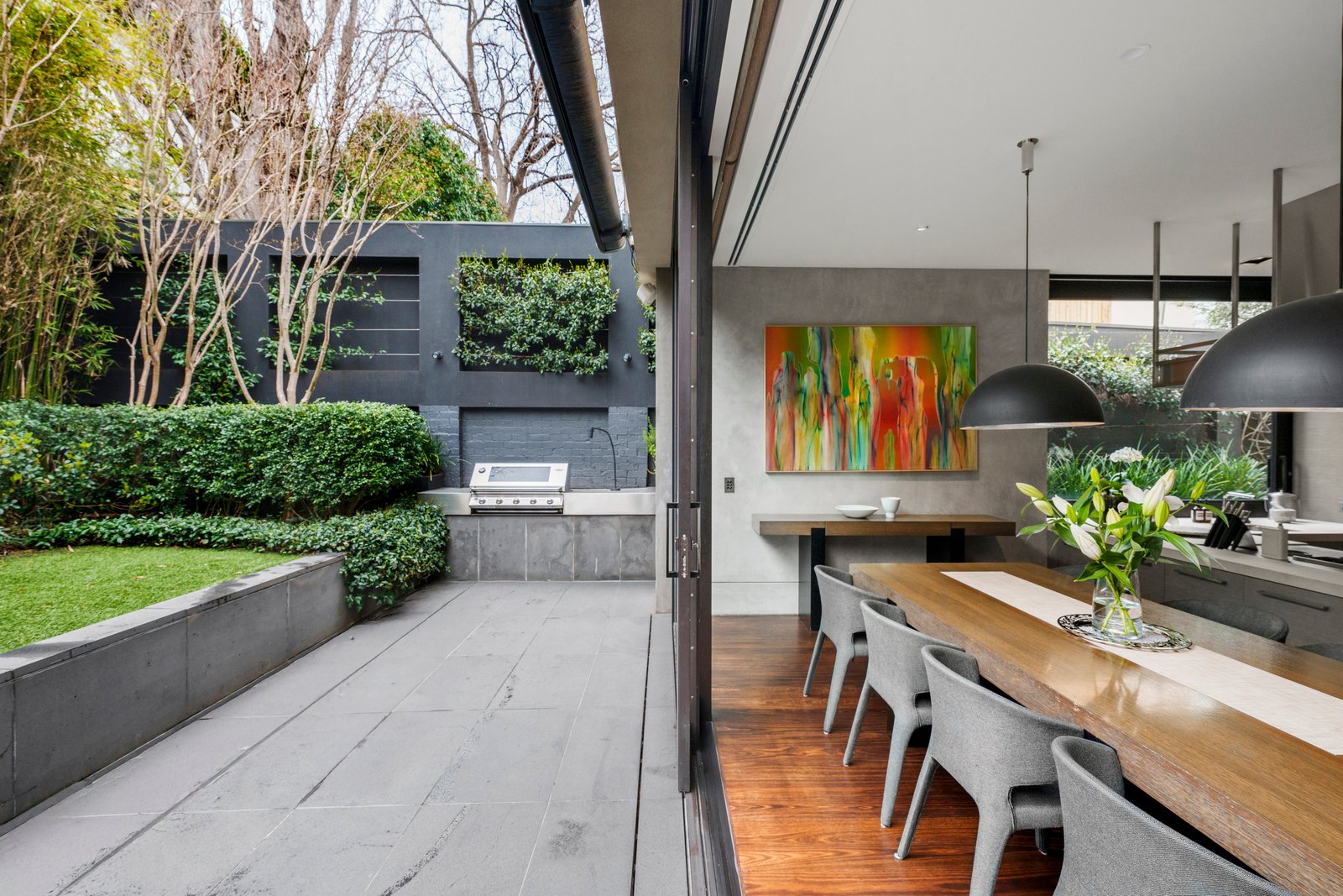 Framed by a striking, solid-brick façade and landscaped gardens, the home unfolds with exceptional versatility and brilliant northern light, offering four bedrooms and three bathrooms, including a ground-floor main suite with a walk-in robe and en-suite bathroom, as well as a flexible executive study. Refined formal sitting rooms celebrate the period’s grace through a dramatic, moody palette, leading past a glass-encased, water garden that signals the transition to the striking contemporary extension. A gas fire and the tranquillity of the gardens offer an undeniable ambience, accompanied by a superbly appointed chef-inspired kitchen, finished with textured stone benches, a commercial-grade Viking stove, an integrated Bosch dishwasher and extensive concealed storage, including a walk-in pantry. Walls of full-height glass draw the eye to the private rear gardens, where towering bamboo and exquisite crepe myrtle enclose a bluestone entertaining terrace and lawn, complete with a built-in plumbed barbecue.