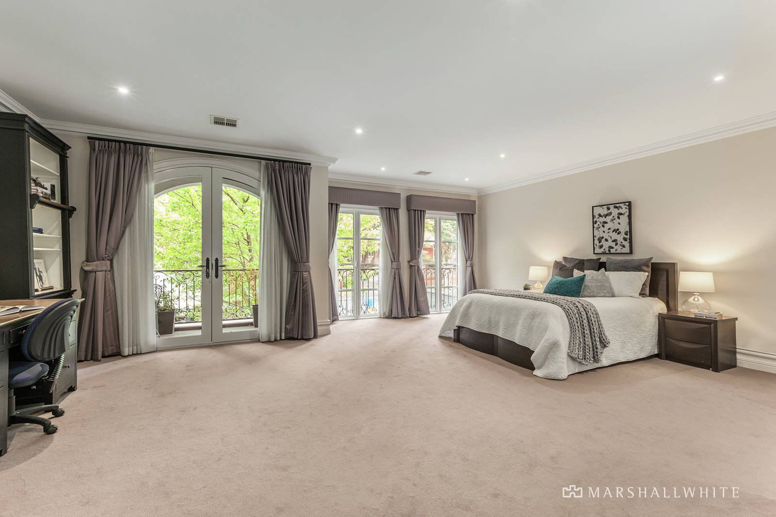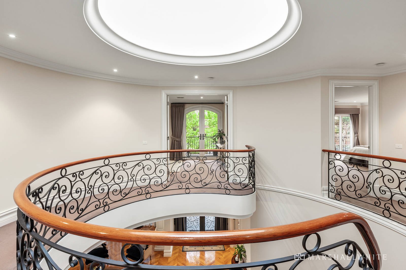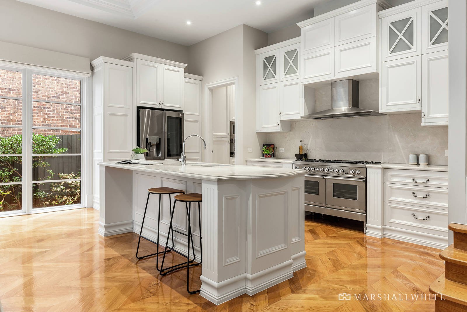 The double door entry reveals a home office and palatial formal room featuring high ceilings, oak parquetry floors, built in bar and gas log fire. Beneath soaring coffered ceilings, the exceptionally spacious open plan living and dining room served by a premium marble kitchen boasting a 120cm Ilve oven and butler's pantry opens through French doors to a large covered terrace and deck surrounded by landscaped leafy gardens. A generous media room also overlooks the garden. A sweeping curved staircase leads up to the opulent main bedroom with deluxe en suite and dressing room, three additional bedrooms with stylish en suites and walk in robes, a spacious retreat and north-facing balcony. A guest or 5th bedroom with en suite and built in robe is conveniently located on the ground level.