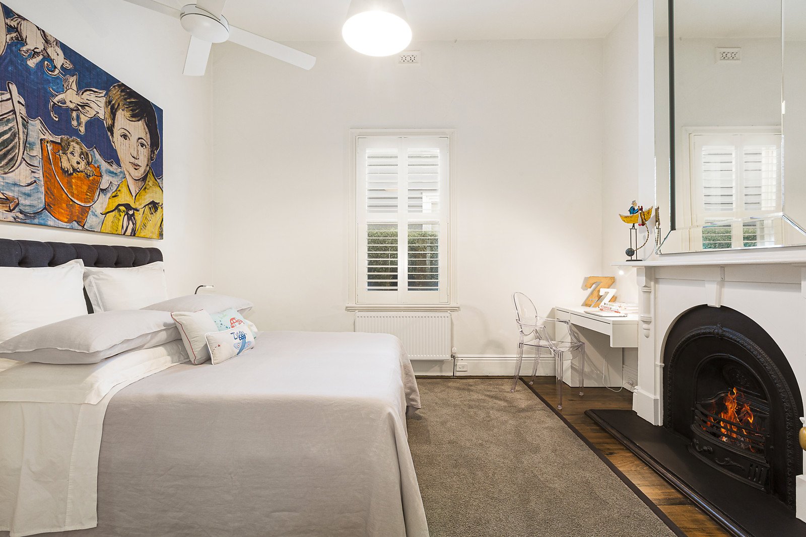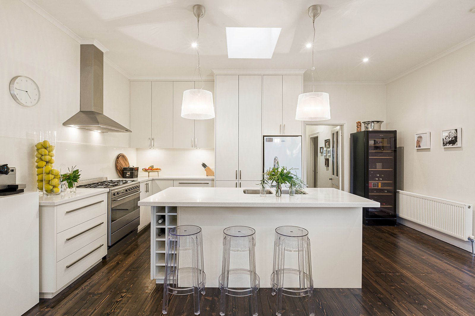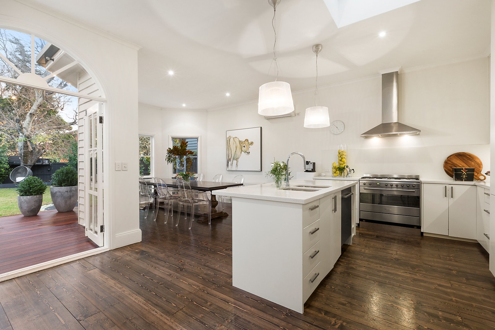 A grand formal living area benefits from a north facing outlook to the secluded front courtyard, coupled with a sunny open plan area at the rear with timber floors and French doors opening out to the sizeable deck and lush landscaped rear garden offering idyllic summertime alfresco entertaining. The gourmet kitchen is illuminated by a skylight and is appointed with a stone island benchtop and a suite of quality stainless steel European appliances including Smeg gas cooktop, oven and Bosch dishwasher.
