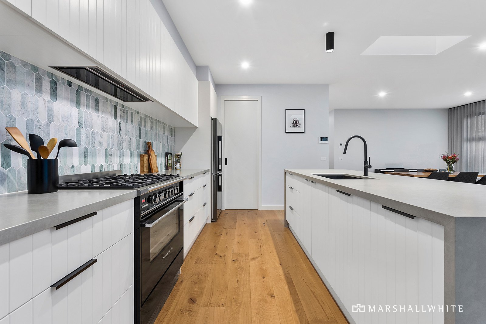 Culminating in the rear, the sun-drenched entertaining hub encompasses a functional open-plan living, dining and state-of-the-art kitchen, including butlers pantry, 900mm Fisher and Paykel freestanding oven, and textural stone benchtop. Large glass panels and sliders open to maximise liveability and enhance entertaining space and low maintenance surrounds ensures nature is never too far.