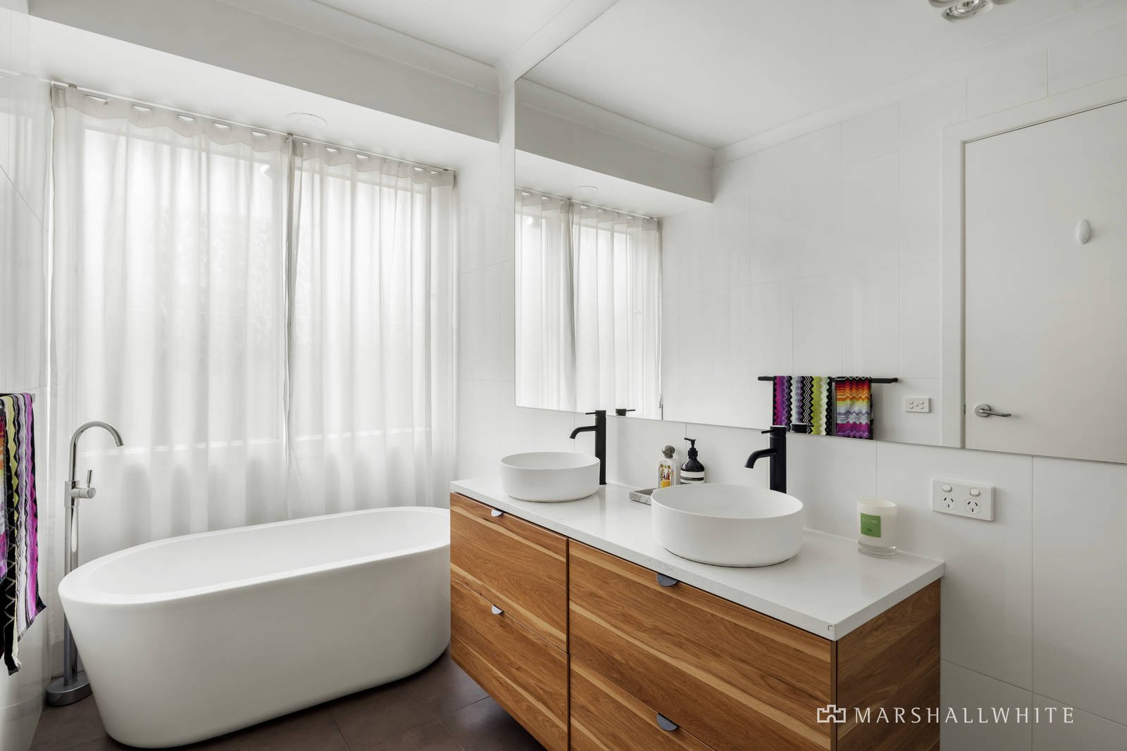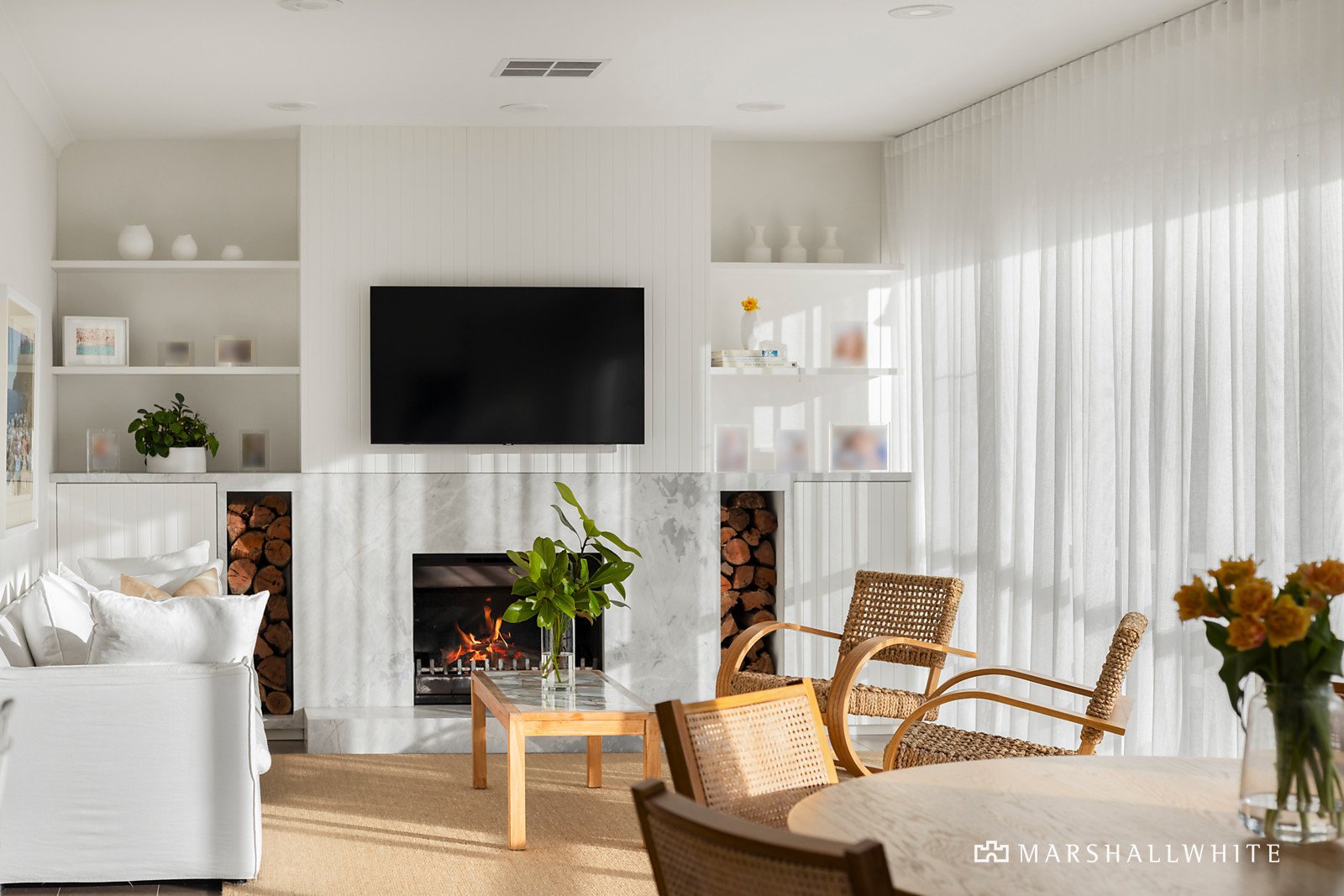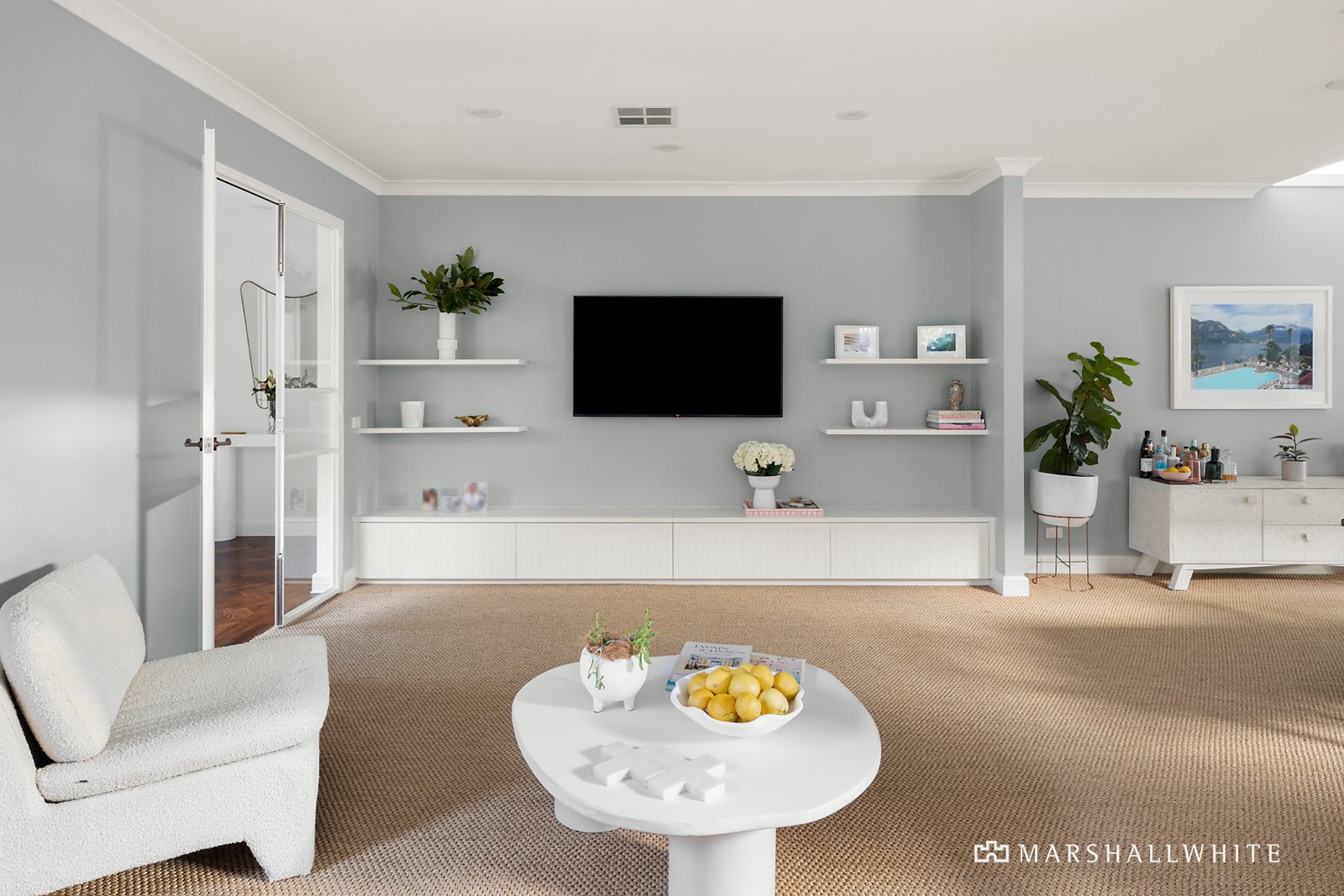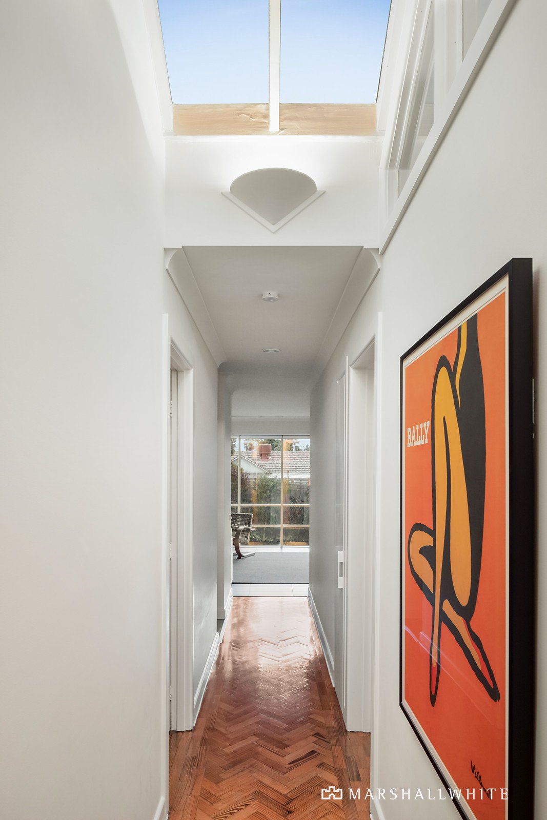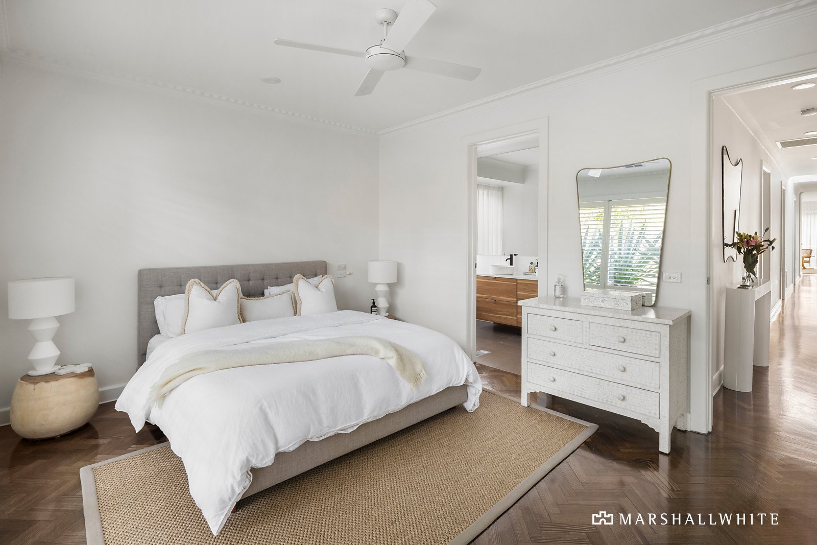 A sublime interior makeover reflecting signature-style elements by Full of Grace Interiors has propelled this already beautifully renovated Bayside family entertainer to next level brilliance. Within steps of the golf course and Dendy Park, and featuring four zoned bedrooms, two bathrooms, formal and informal living and dining spaces, plus a north-facing alfresco area, there are plenty of options to enjoy rest, work, and play. Generously proportioned and beautifully appointed, walls of glass frame lush garden outlooks on three sides. The recently reconfigured formal entrance introduces herringbone parquetry flooring and high vaulted ceilings with skylights and original feature lighting from the circa 1960 single-level residence. At the front of the home, the main bedroom suite has a tropical-retreat vibe with plantation shutters revealing the lush gardens, a wall of mirrored BIRs and luxe ensuite bathroom with standalone bath and walk-in shower. Three further bedrooms, one with built-in desk and shelving currently used as a home office, another with dual access to the family bathroom, plus a powder room and laundry with drying cupboard and external access, run off the main hallway. The light-filled rear open plan casual living/dining and kitchen zone has been re-imagined to showcase the spectacular full-width picture-bay window that overlooks the rear garden, and an original wood fireplace has been given the Full of Grace Interiors treatment with polished marble-surrounds and bespoke joinery. The sleek and stylish central stone kitchen looks out to the rear and side gardens, and has integrated Miele appliances including an induction cooktop and double wall oven plus a servery window that opens to the elevated alfresco area, perfectly positioned for optimum sunlight. The adjoining living/family zone, again beautifully fitted-out to compliment the tranquil colour palette has bespoke fluted glass and steel doors at both ends, creating a calming sanctuary space when closed.