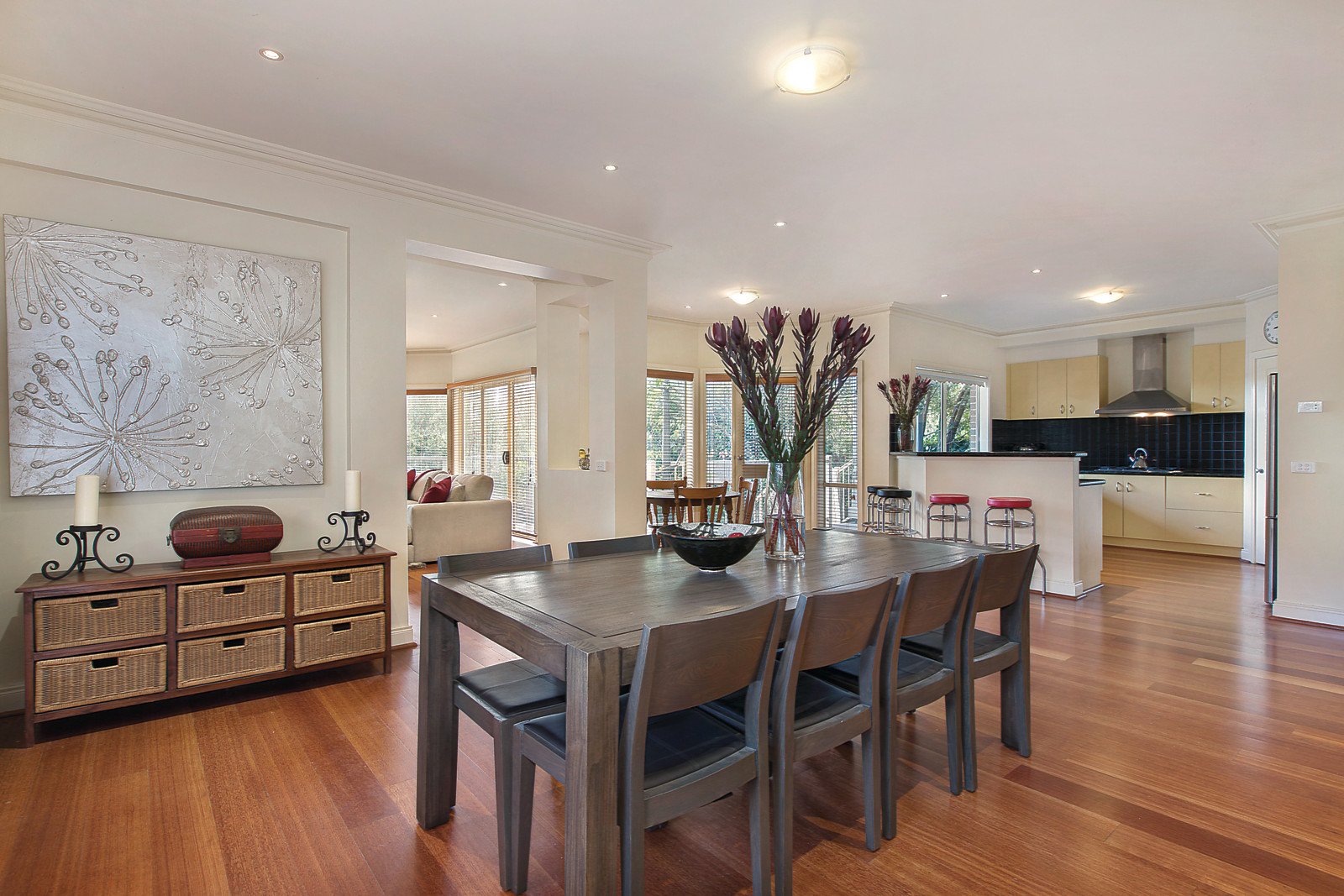 The wide timber entrance hall flows through an inviting sitting room with gas fireplace, formal dining room, superbly appointed European kitchen with stone benches, expansive family dining and a generous living room. The living areas open to an elevated covered deck overlooking the private northwest landscaped garden with solar heated pool. A bright downstairs bedroom with en-suite/bathroom is complemented upstairs by the lavishly proportioned main bedroom with en-suite, walk in robe and west-facing balcony, three additional bedrooms with BIRs, third bathroom and a large retreat with balcony.