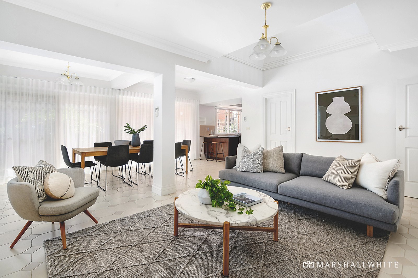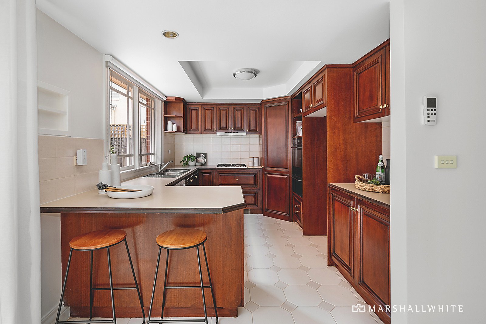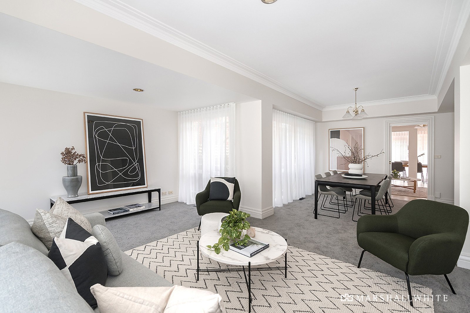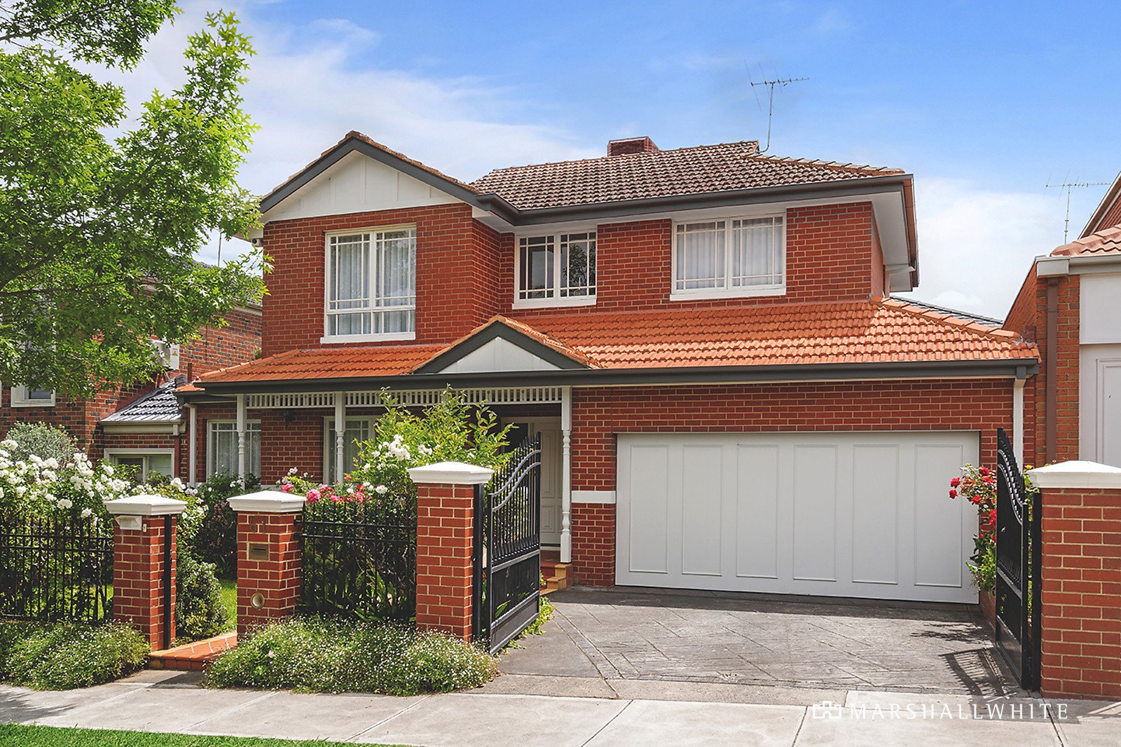 Accessed via a traditional garden of glorious roses, the home opens to an impressive double-height entrance void and creates an immediate sense of impact as it flows past a lounge and semi-attached dining to its open-plan rear. Overlooking a paved and sundrenched courtyard, the kitchen/dining/living is suited to alfresco living and relaxed family entertaining.
