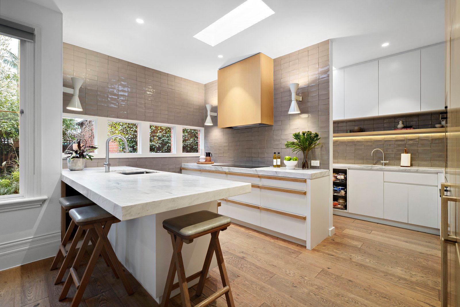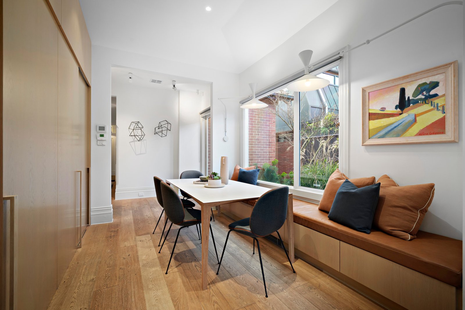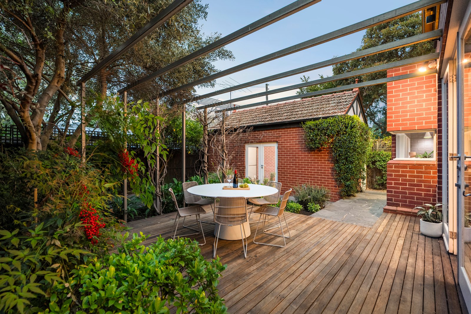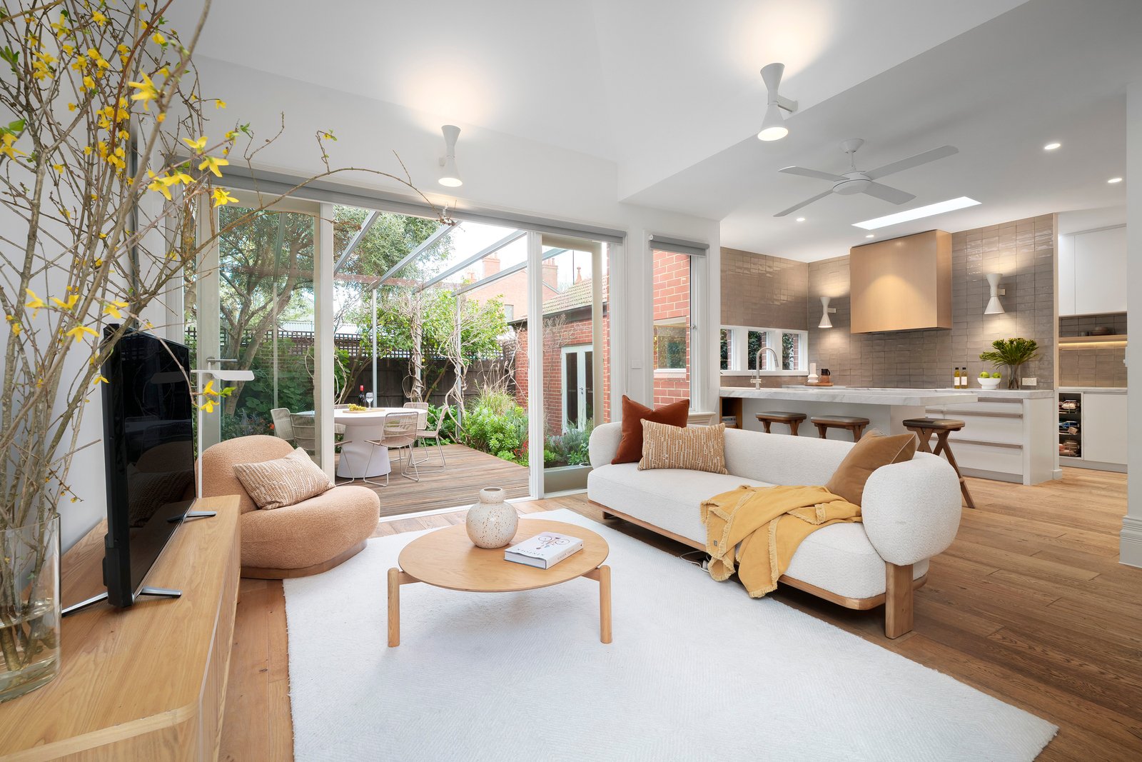 At the heart of the home overlooking established gardens is a light filled state-of-the-art V-Zug kitchen with induction cooktop, dual ovens and a warming drawer, complemented by a spacious butler’s pantry. Every detail exudes quality - from the wide oak engineered floorboards, integrated appliances, to the comfort of hydronic heating and ducted aircon. The expansive rear living and dining area includes a leather banquette dining setting and flows through French doors to landscaped gardens (created by Defreist-Sapontsis and replanted by Amanda Oliver), where a large deck and bluestone patio set the scene for idyllic alfresco entertaining amid lush greenery. A totally separate large lounge room with designer oak and rattan joinery and fireplace complete the living spaces. An FTTP internet upgrade, wired internet, large, lined attic and garage mezzanine storage add further practicality. The remote-controlled garage (via rear lane frontage to Pumpkin Lane), plumbed BBQ facilities, automated irrigation and tank complete the outside amenities.