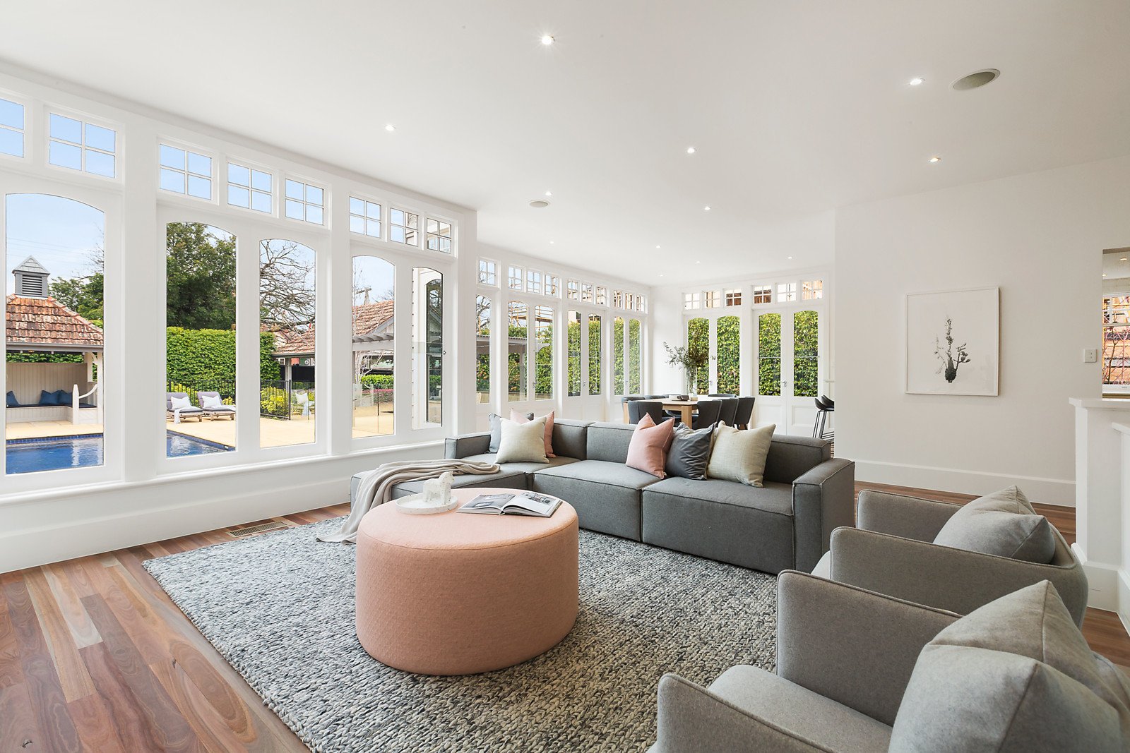 Step inside and soak up the ambience of the recently updated and refurbished interior with its seamless transition from period attributes to contemporary elegance. Introduced by lovely parquetry and polished timber flooring flowing through the entrance hall; leading to a study/5th bedroom with box bay window, formal sitting room with cosy OFP alcove, laundry and powder room. Plus four upstairs bedrooms, main with a Juliet balcony, WIR, fully-tiled ensuite, a family bathroom and retreat. A superb family domain provides exceptional facilities for family relaxation and entertaining with a generous full-width living and dining room and stylish kitchen equipped with Stone Italia benchtops and a range of premium Miele appliances. All opening through French doors to a sandstone paved alfresco area surrounding an azure blue gas-heated pool complete with a gazebo and vine-clad pergola for outdoor dining in a private hedge-lined garden.