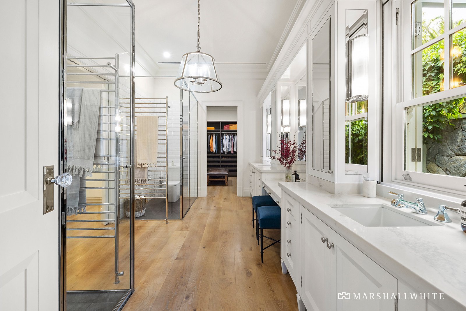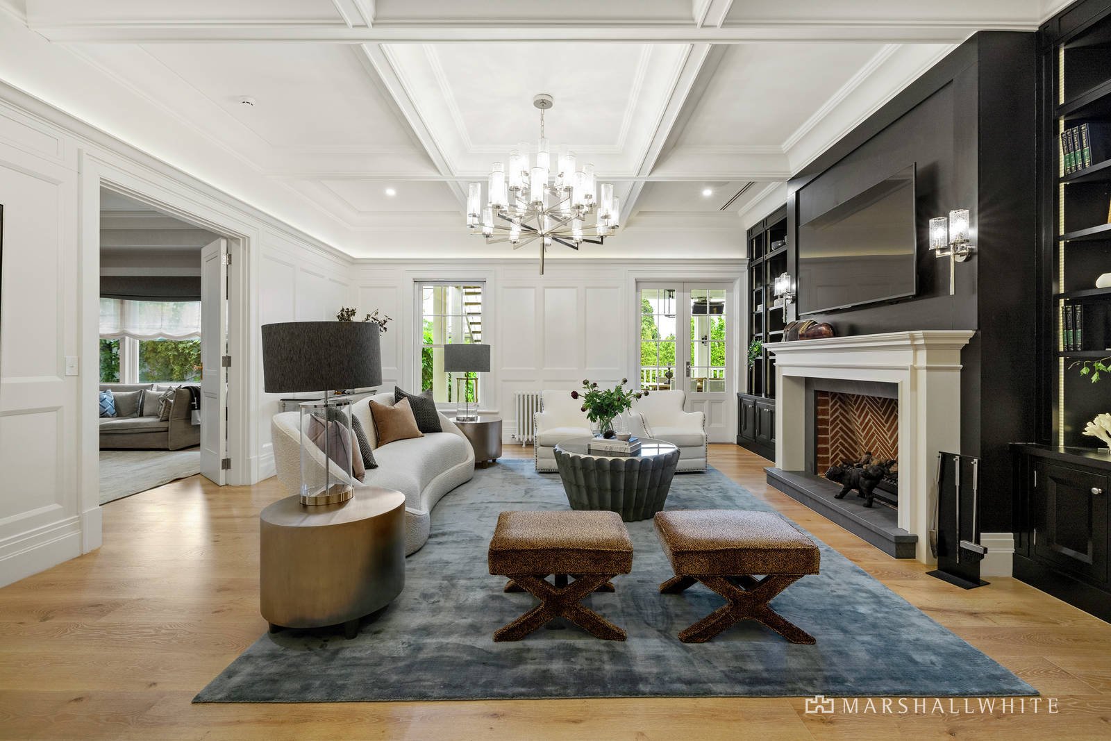 Beautiful wide oak floors, elaborate high ceilings and custom joinery define the rich level of detail in the welcoming reception hall and refined sitting room or library with an open fire. Boasting a majestic stone fireplace and vaulted ceiling, the palatial open plan living and dining room opens to an expansive undercover alfresco terrace or loggia with BBQ kitchen, open fire and drop-down TV. It's the perfect venue for all-weather entertaining overlooking the picturesque northwest garden, gas/solar heated pool and spa, and the fabulous pool house with open fire. Catering to every culinary challenge with ease, the state-of-the-art kitchen is appointed with stone benches, three ovens including a Lacanche, 2 dishwashers, integrated Miele fridge/freezer and full butler's pantry.