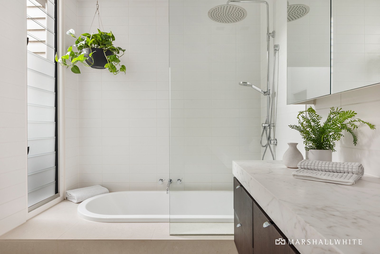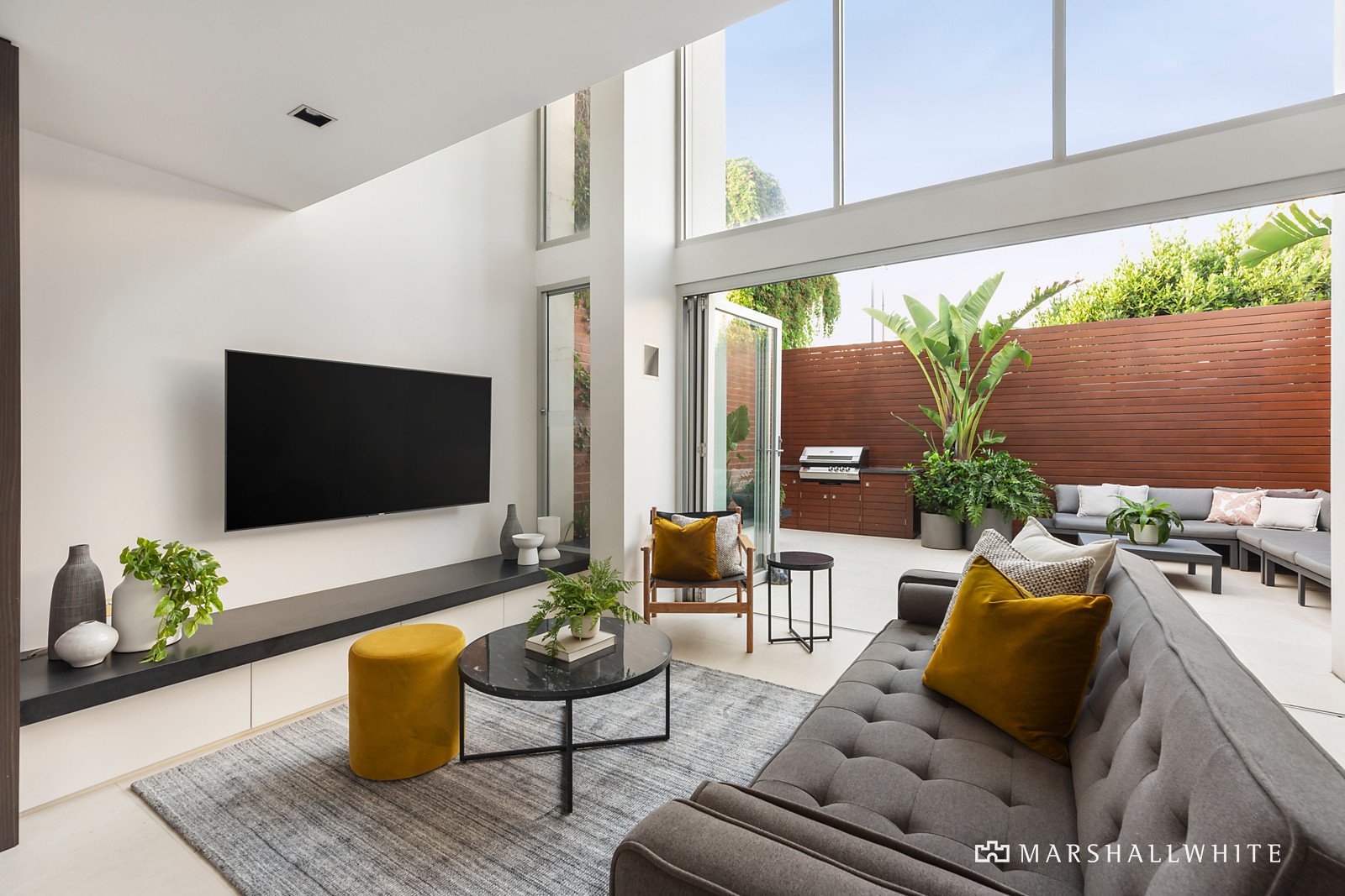 A soaring void accentuates the sense of space and light in the generous open plan living and dining room and sleek gourmet kitchen appointed with marble benches, integrated fridge/freezer and Smeg appliances. Fully opening bi-fold doors and travertine tiles that extend from the living create a seamless connection between the indoors and the glorious north-facing private courtyard with Lisa Ellis designed garden and built in BBQ and fridge. It's a relaxed oasis for year-round entertaining beneath a remote sun-awning.