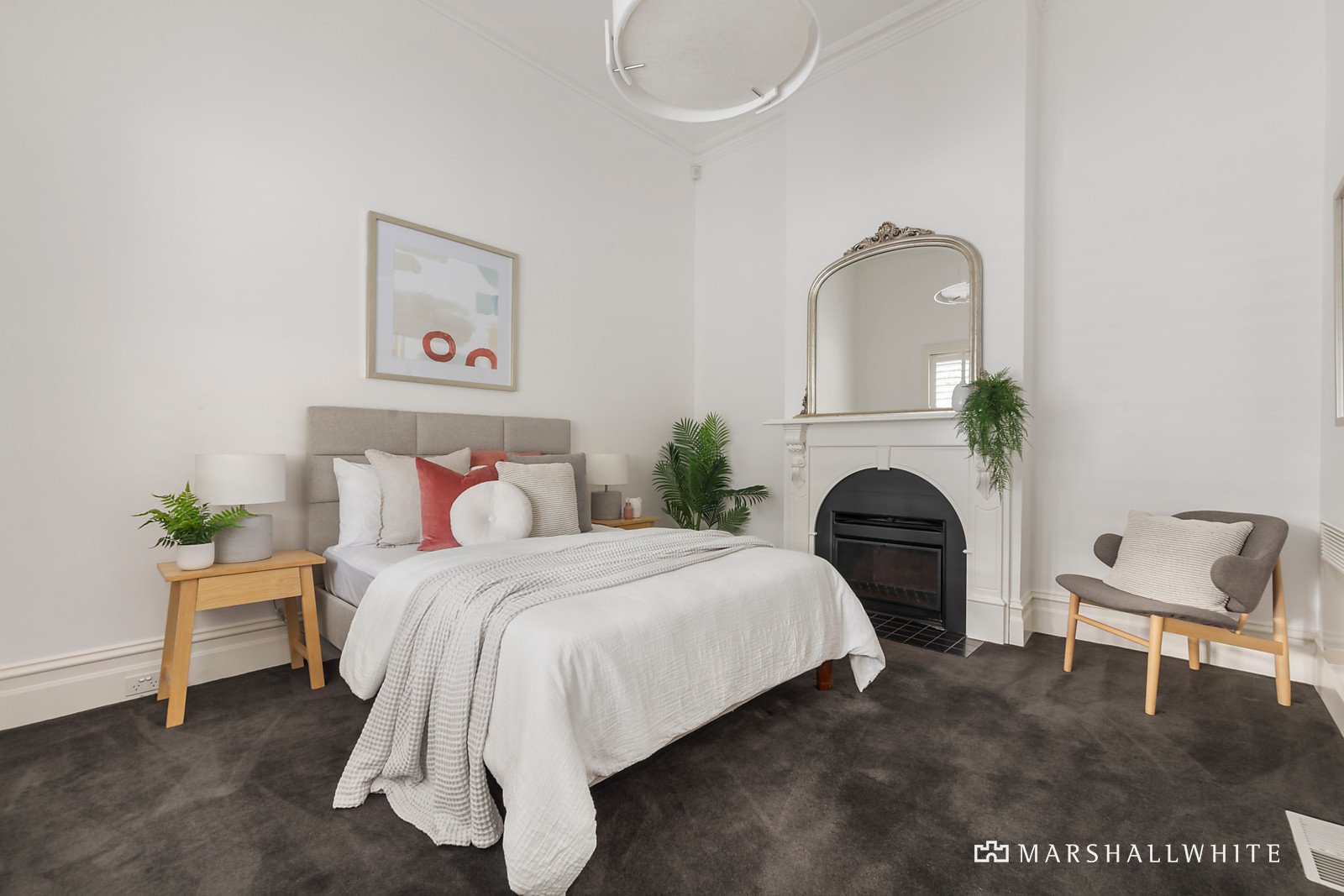Dark timber floors, high ceilings and bespoke lighting create an instant impact in the wide entrance hall leading to two gorgeous double bedrooms with fireplaces and a designer bathroom boasting marble benches. Skylit stairs lead up to the beautiful main bedroom with built in robe, stylish en suite, sunny private roof-deck and a full height sliding wall that creates a mezzanine to enjoy the district views.