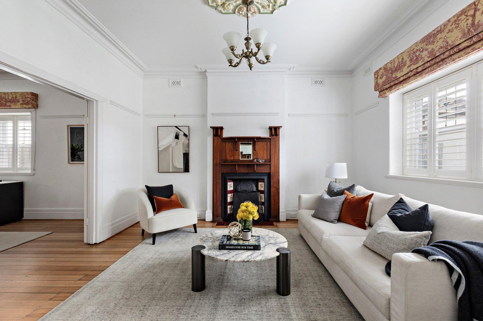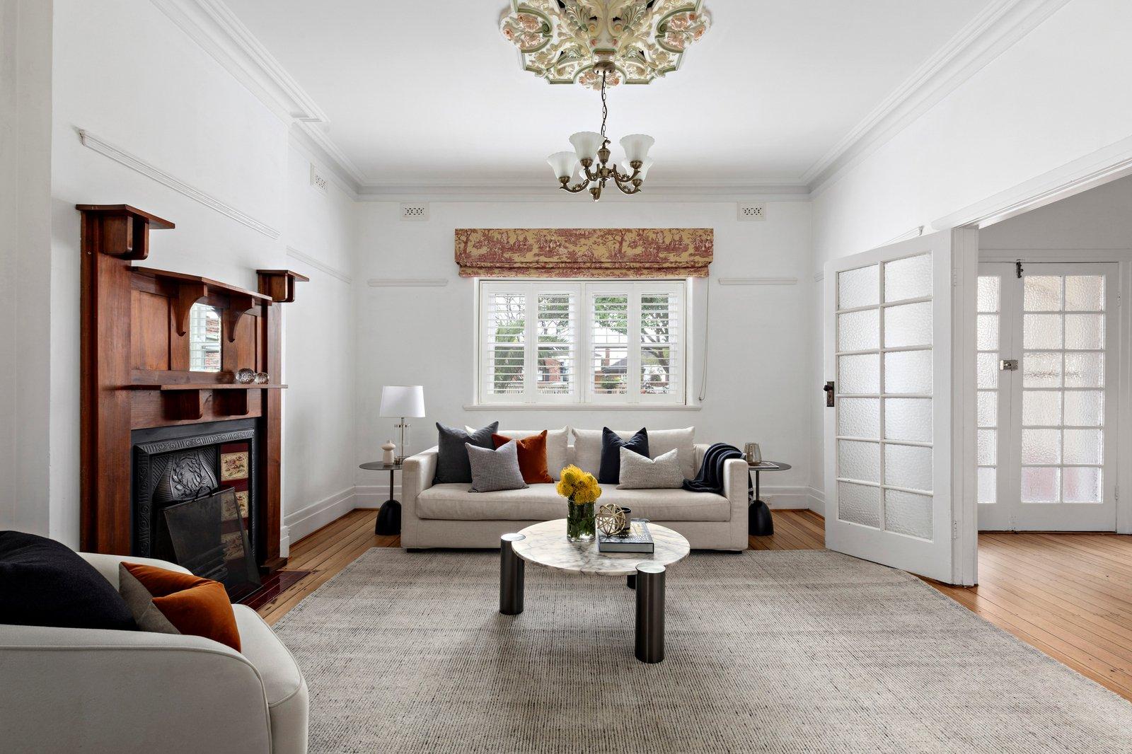 Privately set behind a high picket fence and elegantly landscaped front gardens, the home’s circa-1920s charm is endorsed with a broad entry veranda, stucco rendered walls, and ornate timber-framed windows. Inside, the enchantment continues in the wide, light-filled entry hall with white-painted timber fretwork, polished Tasmanian oak flooring, and soaring, intricately plastered ceilings. In the front formal living room, a glorious botanical-themed ceiling rose adds a sense of bespoke grandeur and is complemented by a matching traditional timber and tiled fireplace, while plantation-shuttered clad windows overlook the gardens. The adjoining grandly proportioned dining space is equally charming and has a servery window from the central stone/Smeg kitchen, along with flow-through access to the open-plan rear section with sliding glass doors connectivity to the alfresco deck. There are three good-sized bedrooms, all with built-in robes, two bathrooms, and the fourth bedroom offers the option to be used as a study providing zoned adaptability to suit contemporary family living. There is also a Euro laundry, central heating and split systems, and the lushly lawned backyard features a custom kids’ cubby house, and a garden shed.