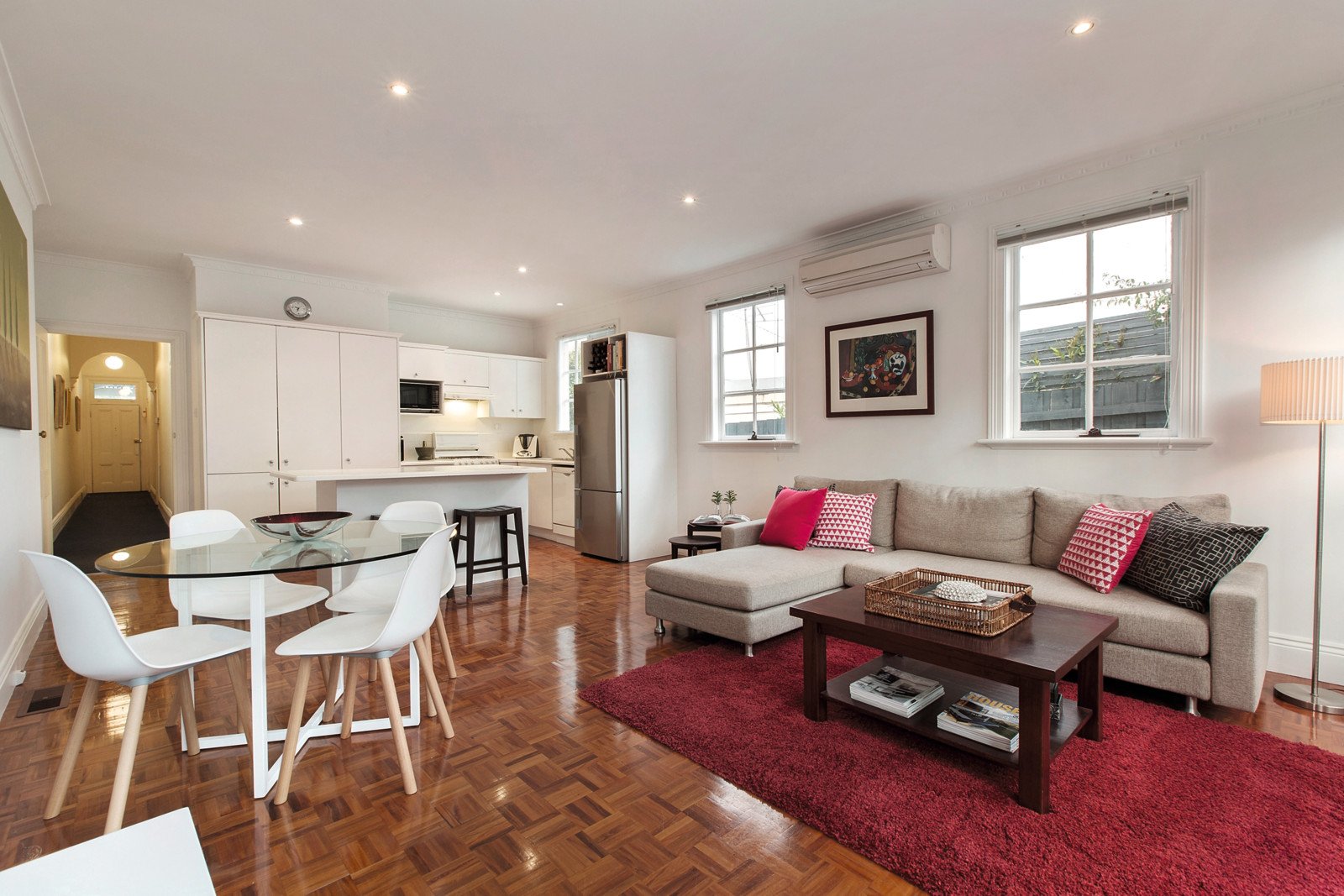 With its classic block-fronted Victorian facade and elevated street position, this immaculately presented free-standing home combines period elegance and detail with a contemporary open plan extension in the heart of Kew just moments from popular Kew Junction shops and transport (48 & 109 tram), Kew Recreation Centre and many excellent schools the area is known for. The home comprises a generously proportioned living room with kitchen overlooking the meals area that opens onto the spacious rear courtyard garden, 3 bedrooms (main: BIRs & OFP) and a renovated central bathroom incorporating Euro laundry and storage. The home also features ROW for potential OSP, ducted heating and air-conditioning.