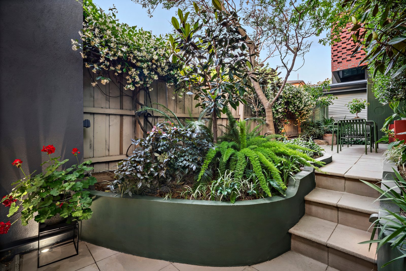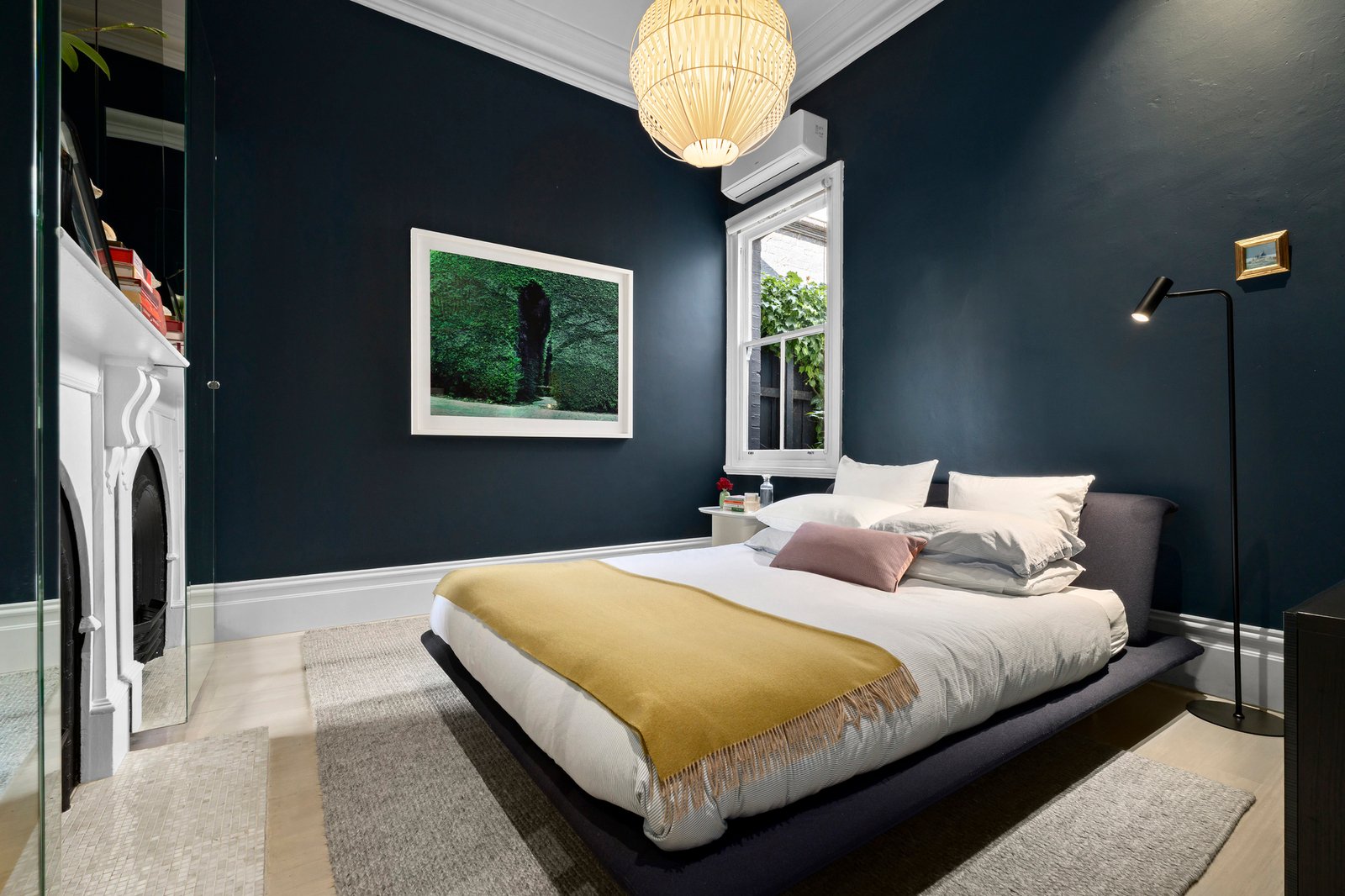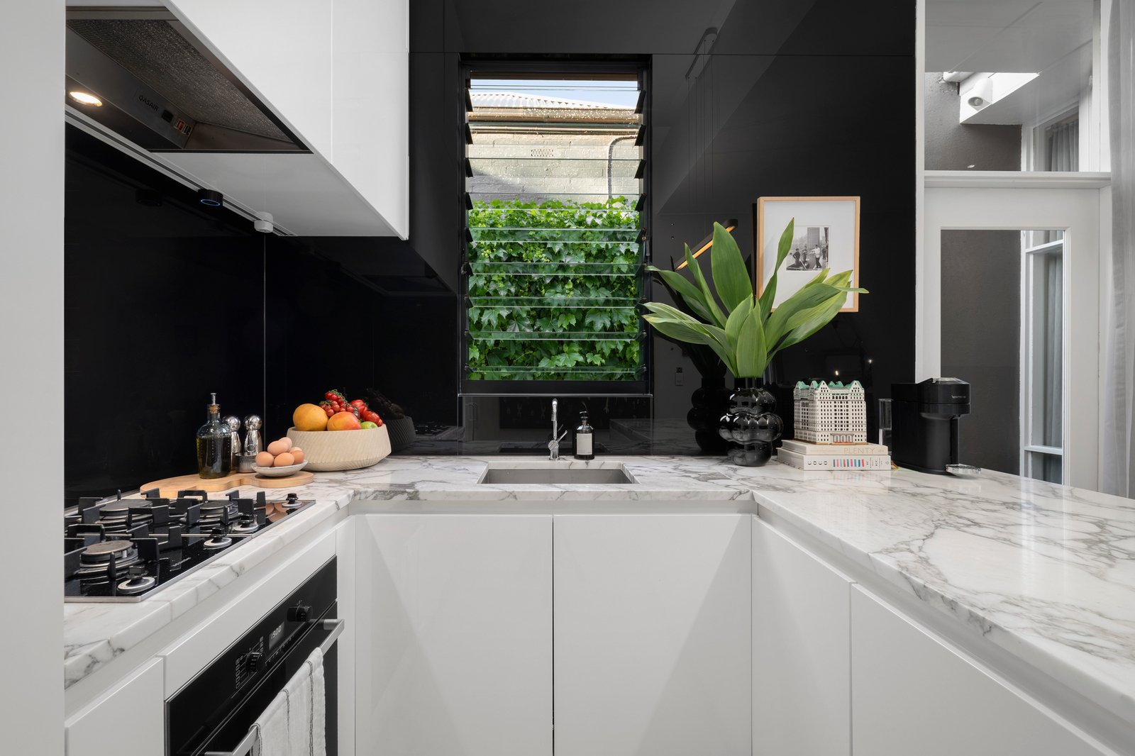 Designer colours, soaring 3.5m ceilings, industrial style hung doors and limed timber floors are introduced in the wide arched entrance hall, complete with skylight and two gorgeous double bedrooms with robes, original heritage roses, fireplaces and a stunning bathroom featuring a freestanding bath and heated floors. A sensational living and dining domain with a gas log fire and gourmet kitchen appointed with Calacatta marble waterfall benches, Miele oven and integrated Liebherr fridge/freezer is bathed in year-round light from a northern courtyard. Full width black steel framed glass doors open the living to a beautiful leafy, landscaped northeast garden oasis with built in seating and roller door access to a rear lane allowing possible off-street parking.