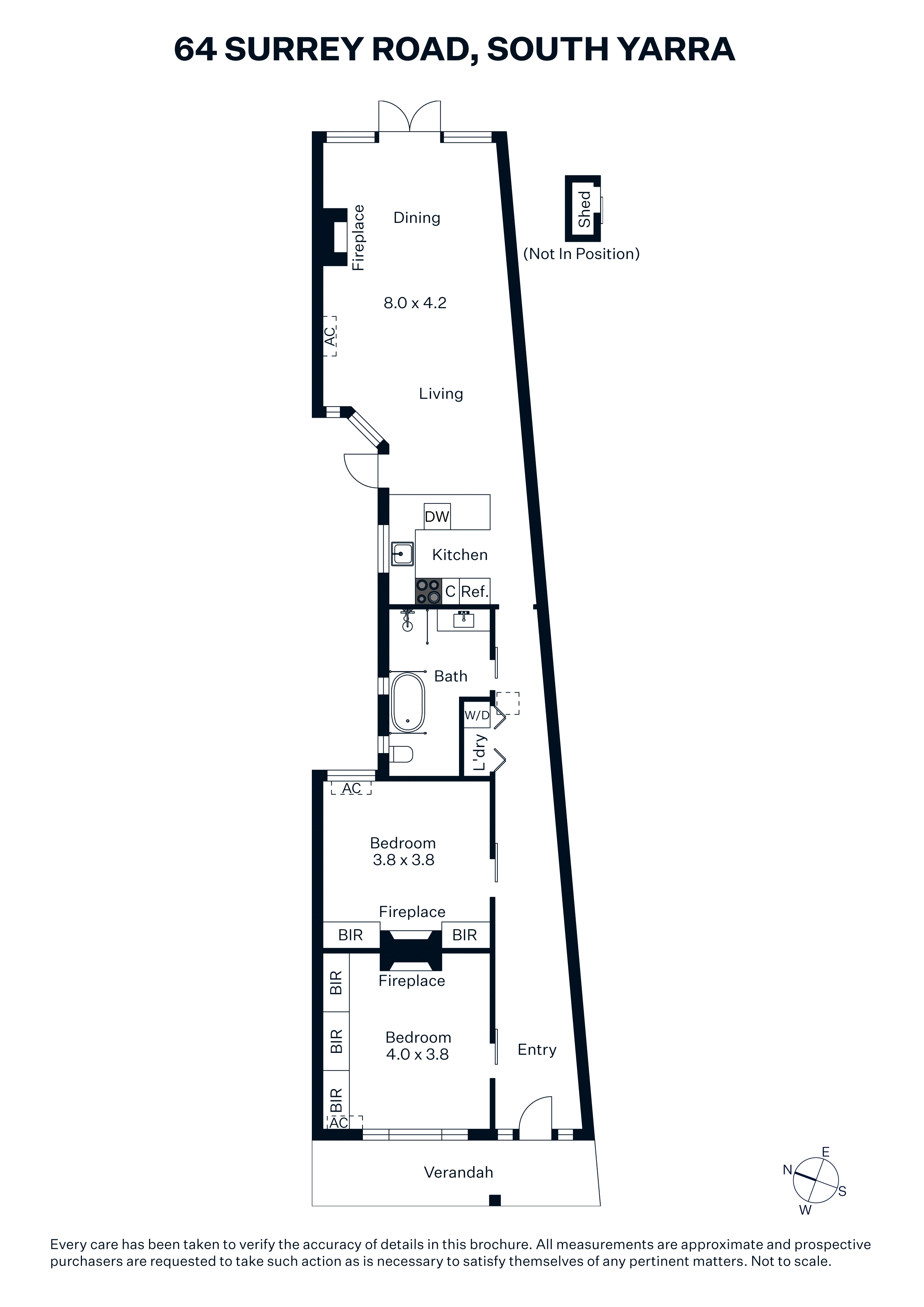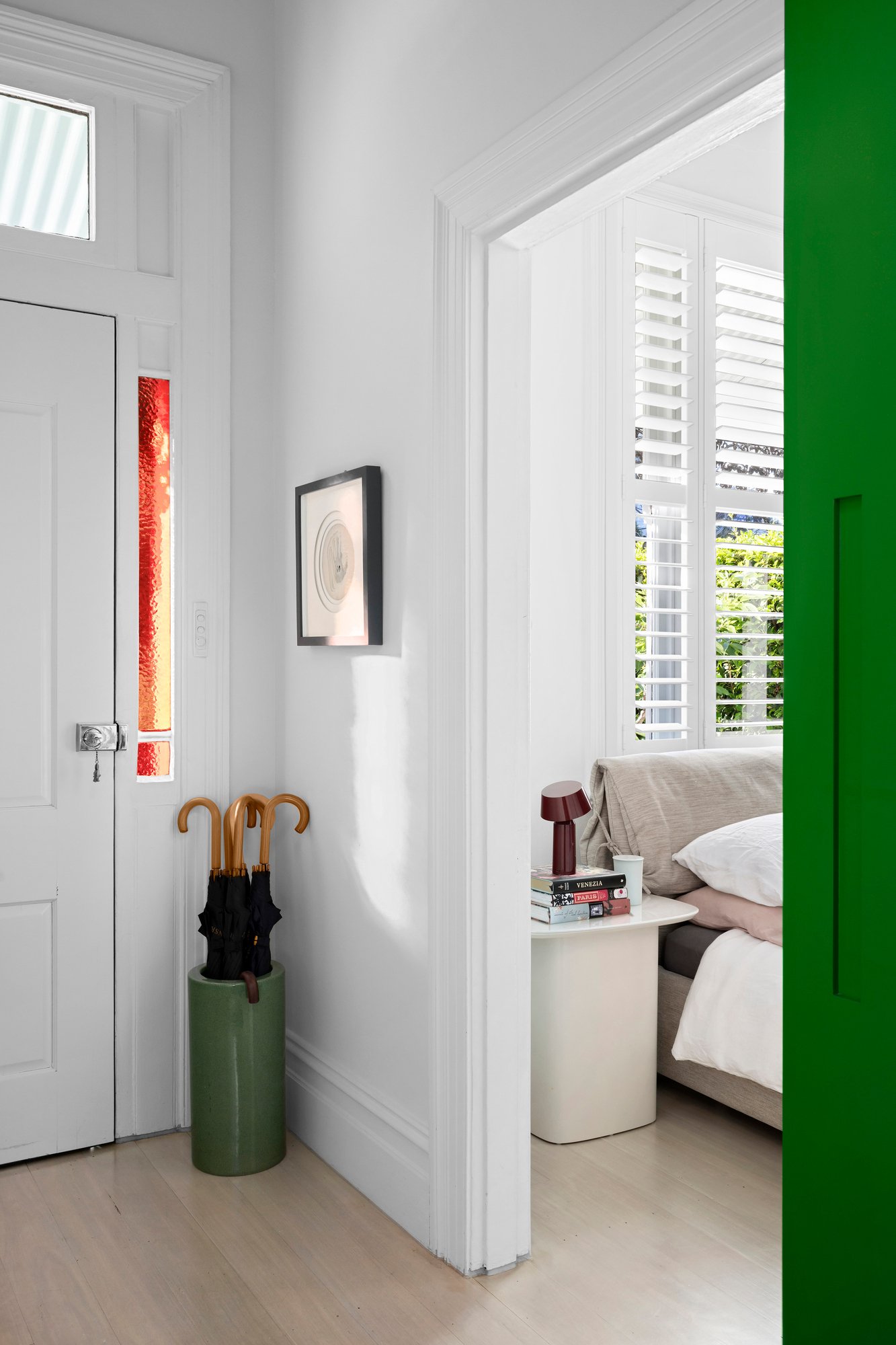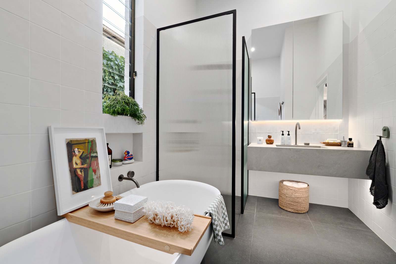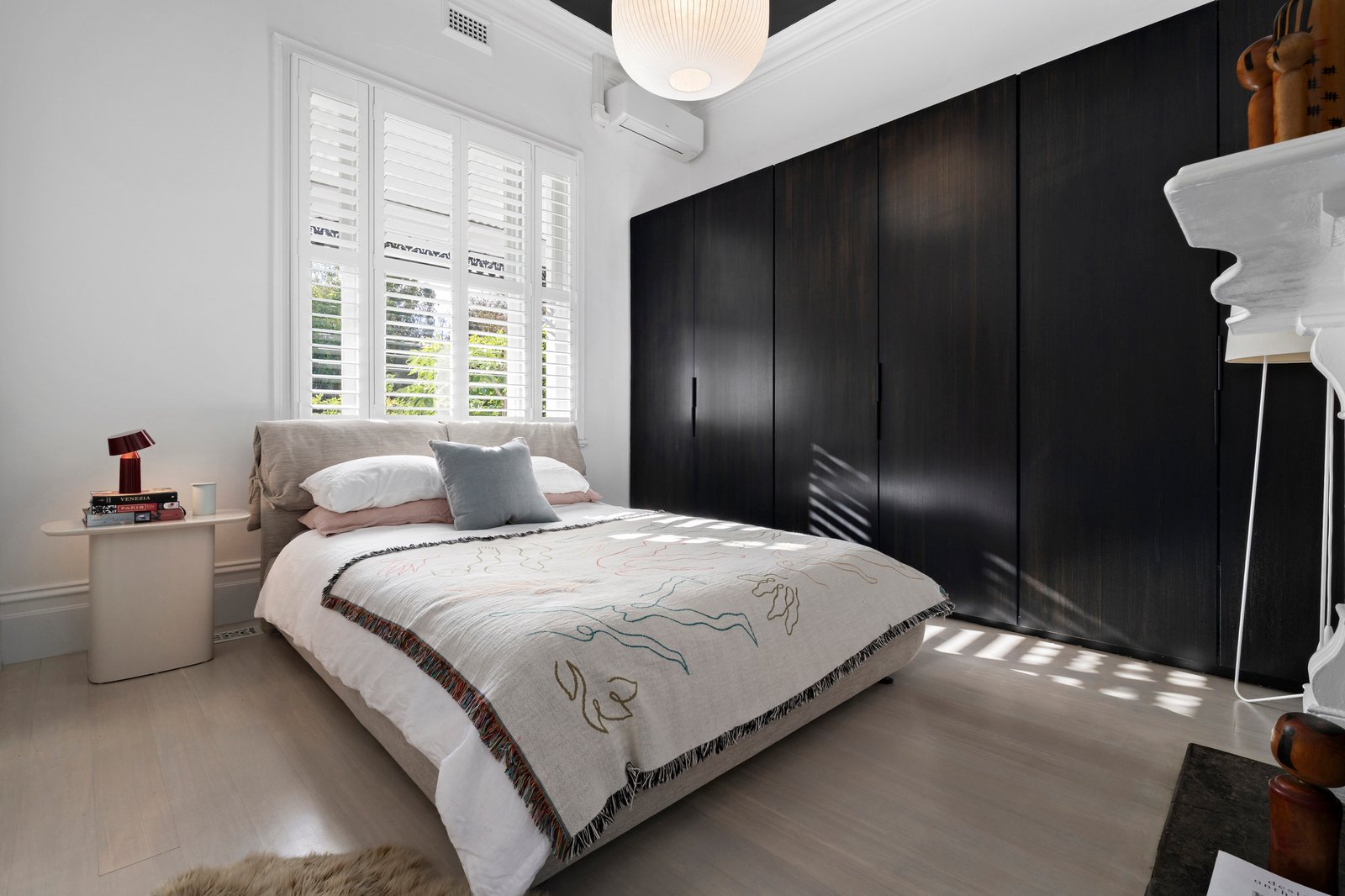 Designer colours, soaring 3.5m ceilings, industrial style hung doors and limed timber floors are introduced in the wide arched entrance hall, complete with skylight and two gorgeous double bedrooms with robes, original heritage roses, fireplaces and a stunning bathroom featuring a freestanding bath and heated floors. A sensational living and dining domain with a gas log fire and gourmet kitchen appointed with Calacatta marble waterfall benches, Miele oven and integrated Liebherr fridge/freezer is bathed in year-round light from a northern courtyard. Full width black steel framed glass doors open the living to a beautiful leafy, landscaped northeast garden oasis with built in seating and roller door access to a rear lane allowing possible off-street parking.
