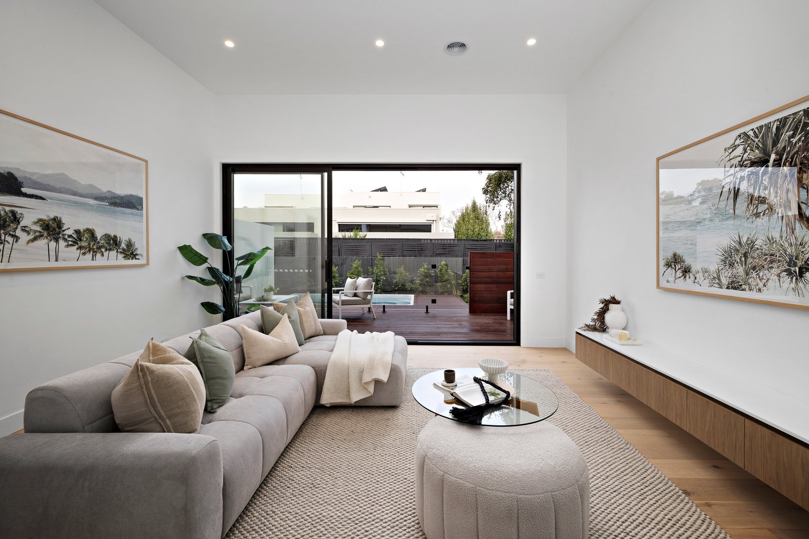 There is a second living area on the ground level, with sliding glass doors that open out to incorporate the alfresco deck and fully tiled, heated mineral plunge pool. A large stone-topped laundry, also with access door to the deck, offers kitchenette or bar functionality when poolside entertaining. Also on this level are three beautifully appointed, fitted robed bedrooms, a powder room, and luxe double-shower bathroom.