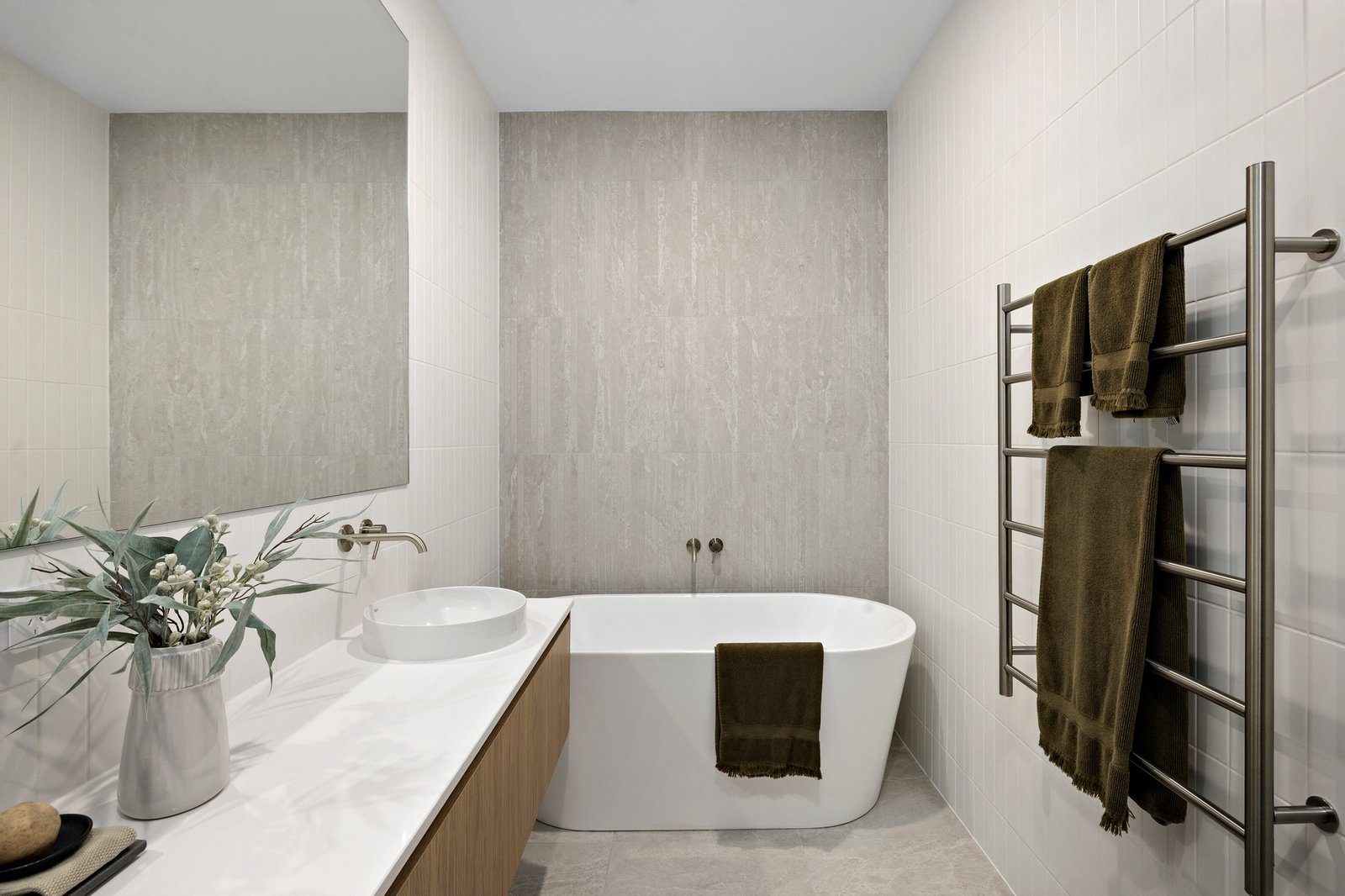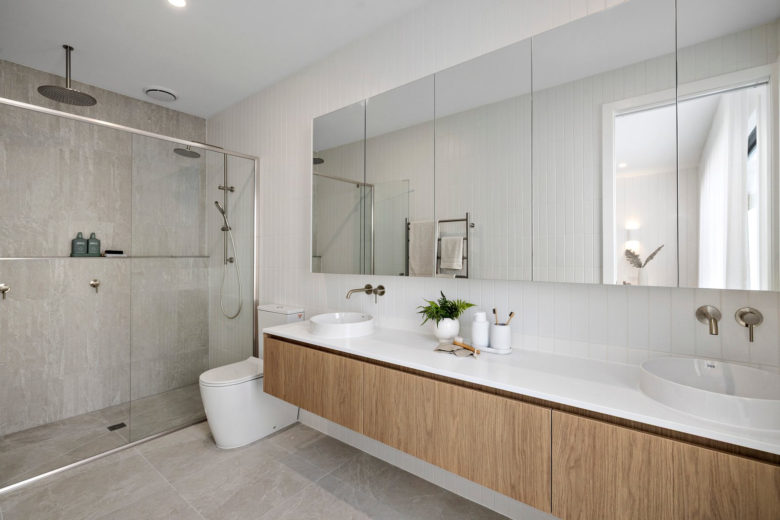 The soaring dimensions and high-end fit out are introduced in the impressive entry foyer with European oak flooring, a sculptural oak open staircase, and glass doored elevator. The uncompromised materials palette incorporates stone benchtops, exquisite porcelain floor-to-ceiling tiling, custom oak joinery, and pure wool loop pile carpeting, while panelled walls in the bedrooms enhance the modern coastal aesthetic.
