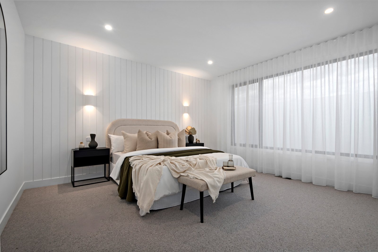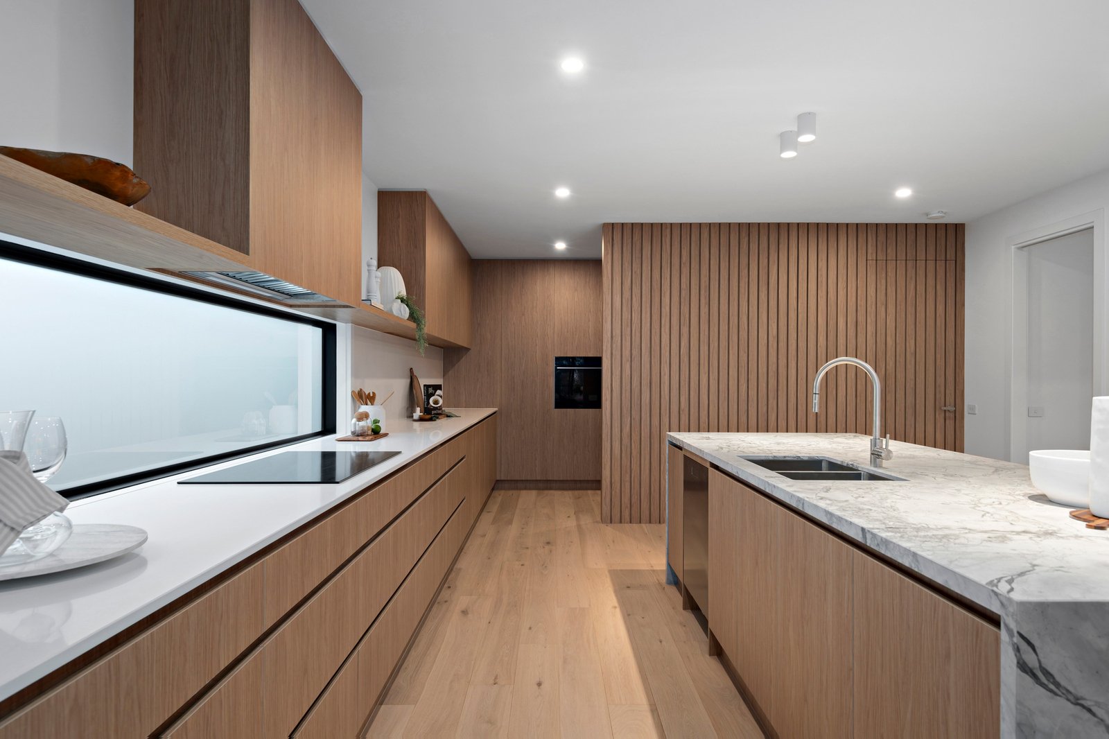 The soaring dimensions and high-end fit out are introduced in the impressive entry foyer with European oak flooring, a sculptural oak open staircase, and glass doored elevator. The uncompromised materials palette incorporates stone benchtops, exquisite porcelain floor-to-ceiling tiling, custom oak joinery, and pure wool loop pile carpeting, while panelled walls in the bedrooms enhance the modern coastal aesthetic.