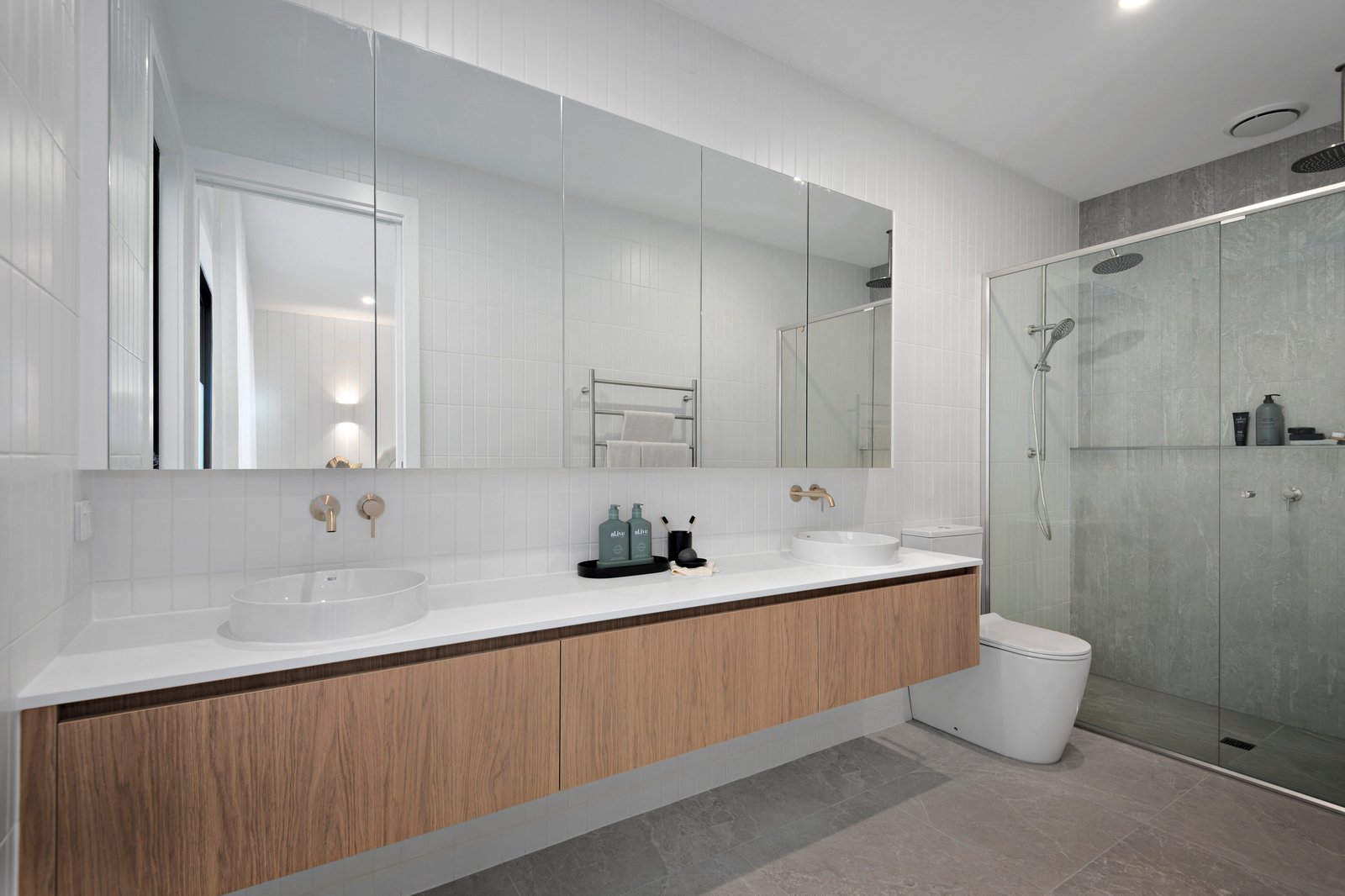 There is a second living area on the ground level, with sliding glass doors that open out to incorporate the alfresco deck and fully tiled, heated mineral plunge pool. A large stone-topped laundry, also with access door to the deck, offers kitchenette or bar functionality when poolside entertaining. Also on this level are three beautifully appointed, fitted robed bedrooms, a powder room, and luxe double-shower bathroom.