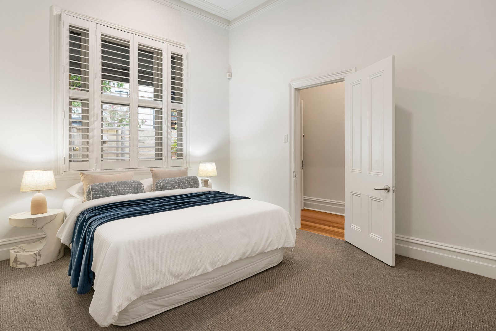 Upstairs, a beautifully proportioned third bedroom with a lofty pitched ceiling and walk-in robe provides an ideal retreat for teens, a dedicated home office or a private studio, quietly zoned from the living spaces below. A separate laundry and WC with external access, plantation shutters throughout and solid brick construction underscore the enduring quality of this home.