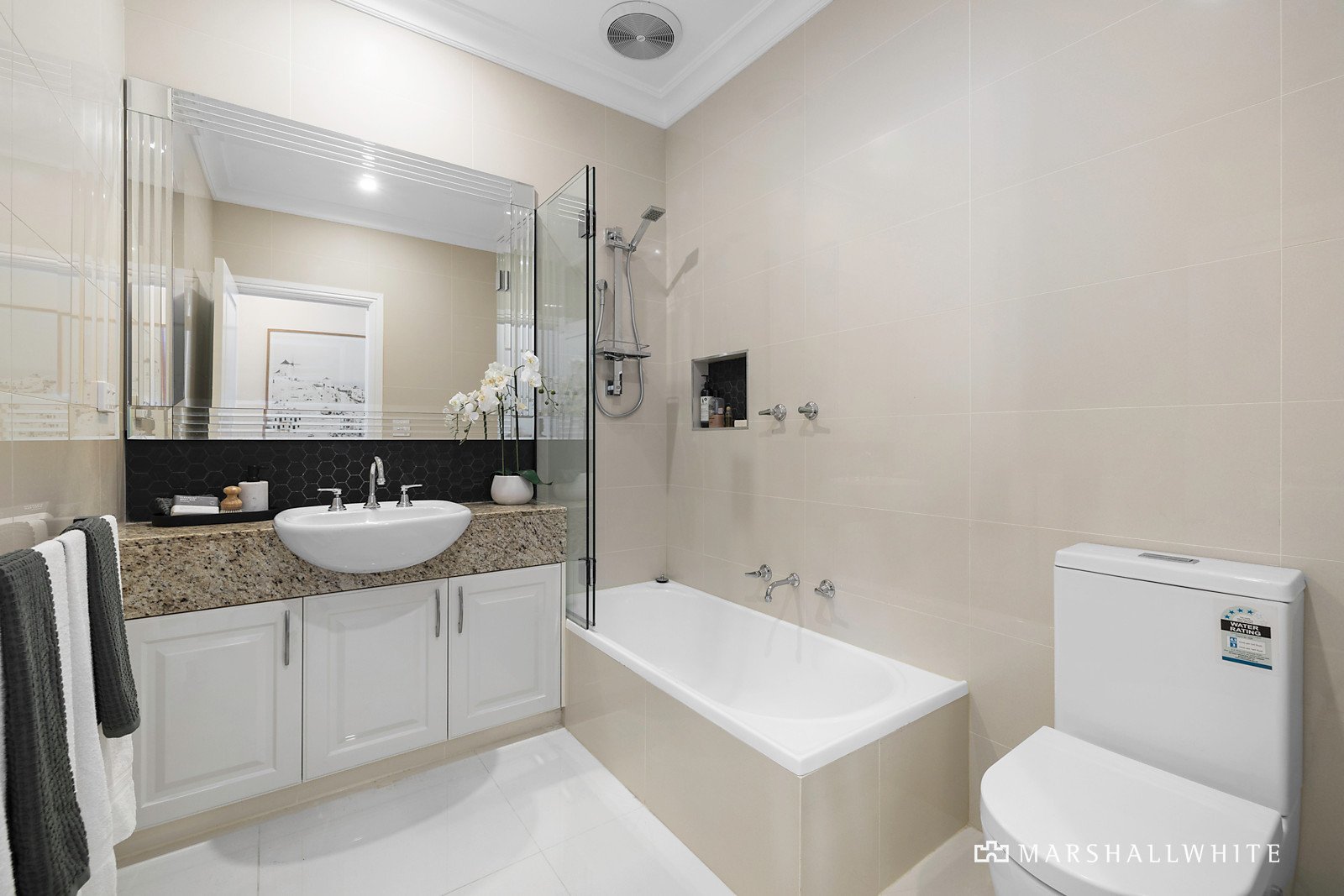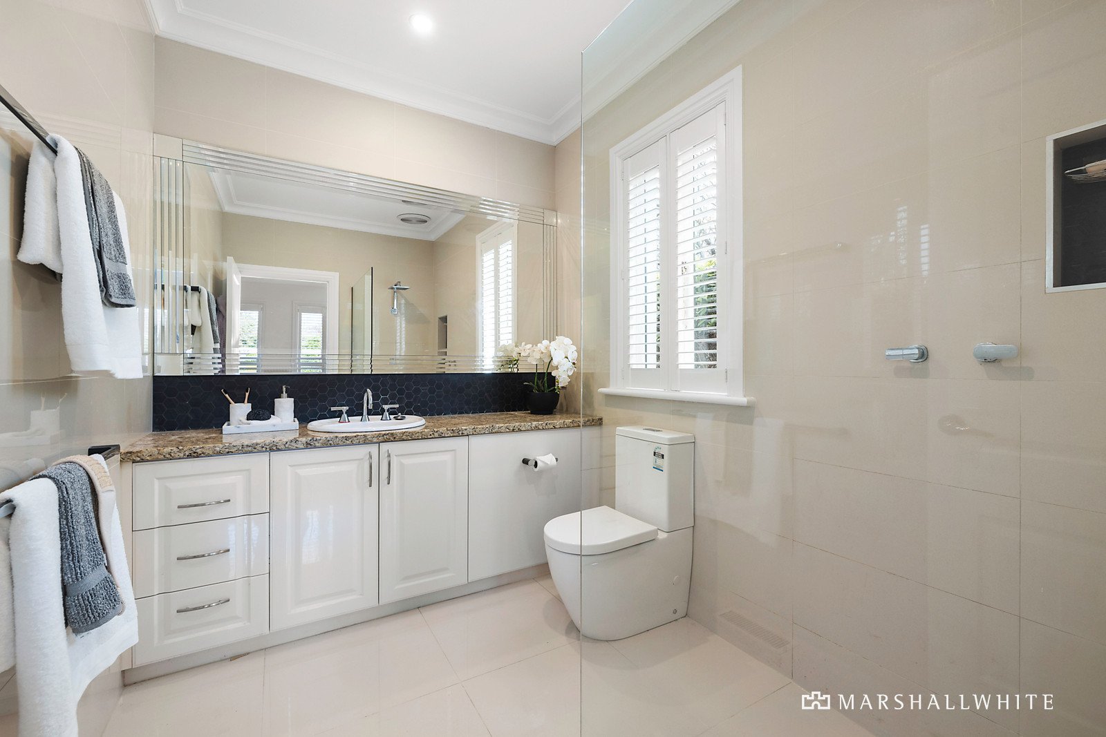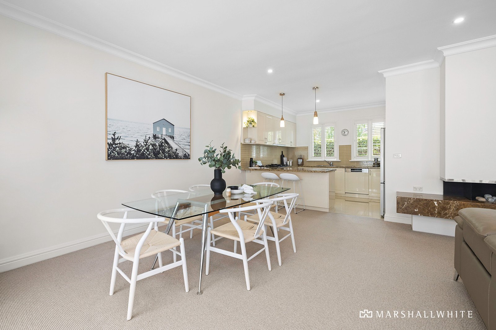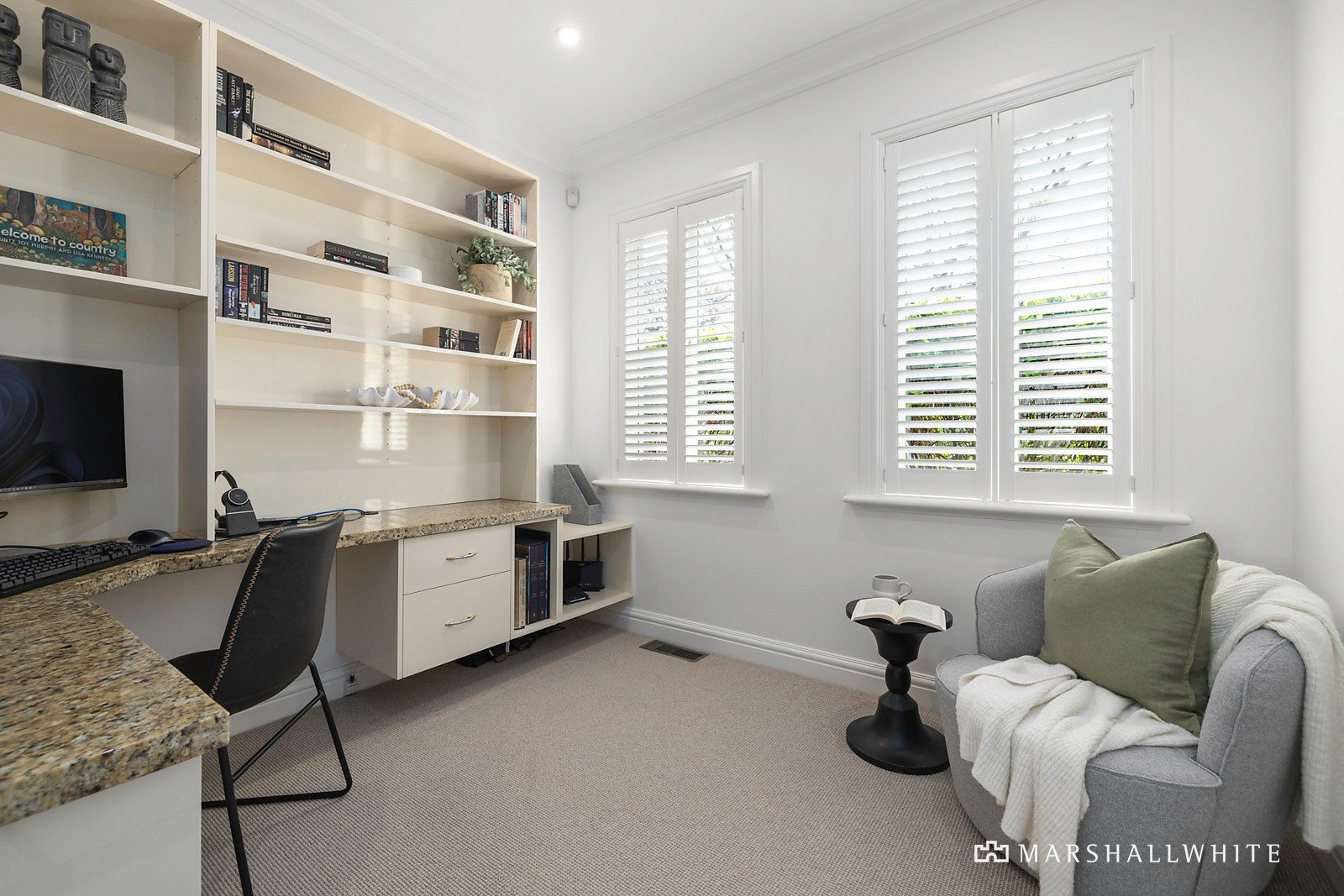 Attracting plenty of street appeal, the home's newly painted monochromatic exterior is resplendently contrasted by the greenery of its manicured front garden. The entry hall reveals natural stone and timber design elements that are cohesively continued in benchtops and custom joinery throughout. Recent enhancements include plantation shutters and pure wool loop pile carpets, which add to the sanctuary-like ambience. The master bedroom, at the front of the home, has garden outlooks, and the recently renovated luxe ensuite has floor-to-ceiling tiling and a stone vanity. There are another two bedrooms, one currently fitted-out as a stylish home-office, plus an elegant, fully-tiled main bathroom, and a good-sized laundry/mud room. The light-filled open-plan living and dining area is defined by a feature remote-operated Jetmaster gas log fireplace, set within marble surrounds and the gleaming central stone kitchen is well appointed with a Blanco gas cooktop, Bosch pyrolytic/steamer self-cleaning oven, and Bosch integrated dishwasher.