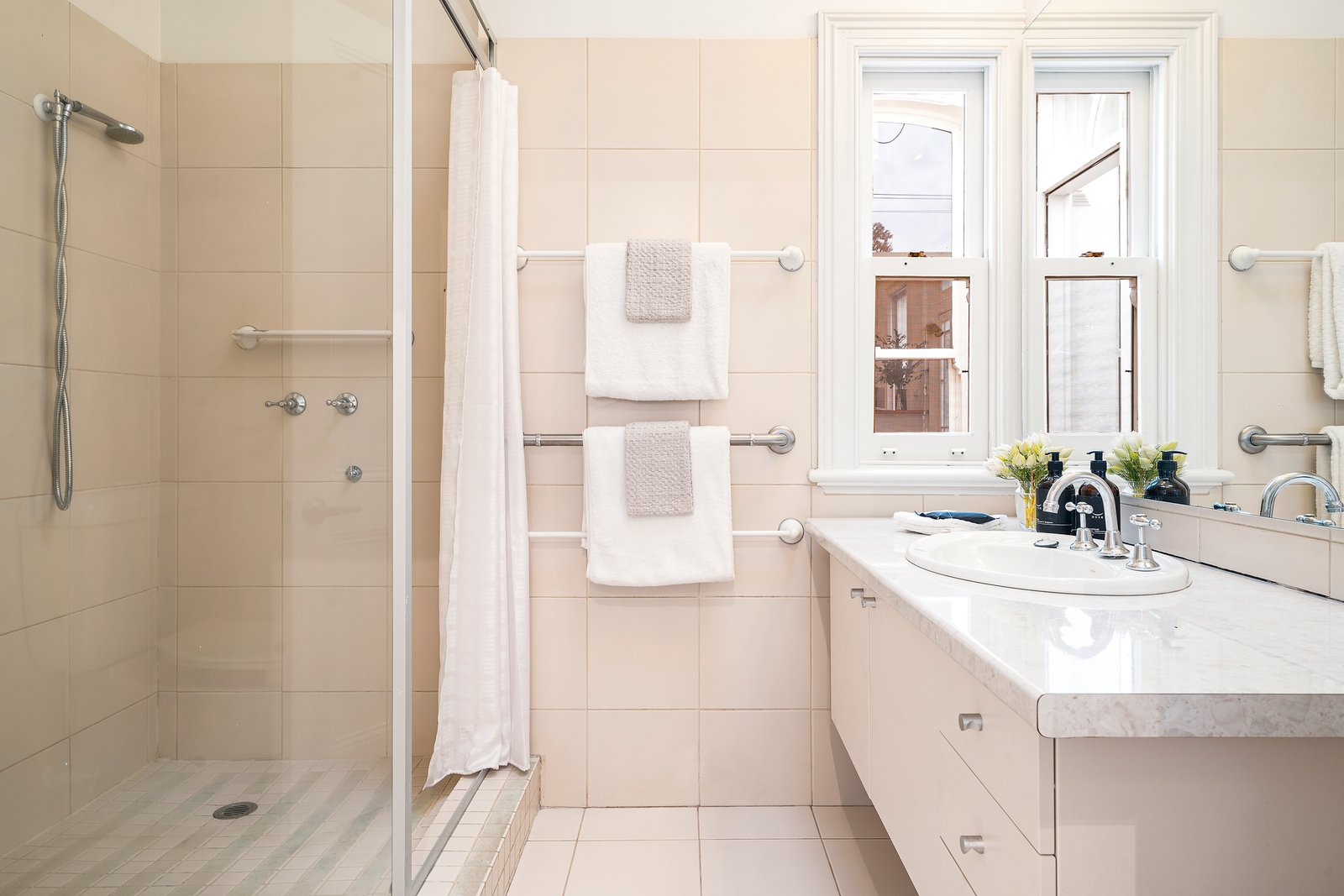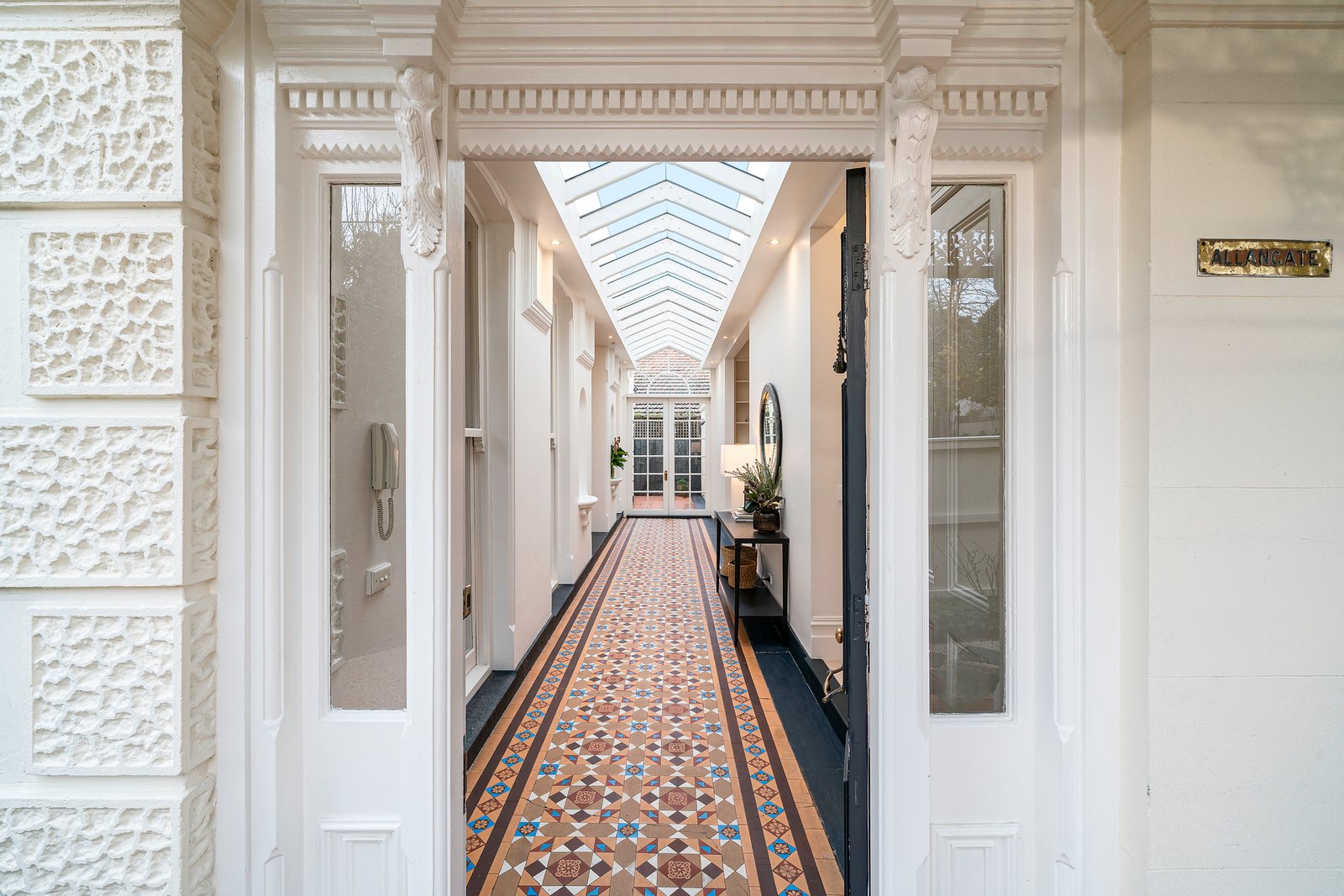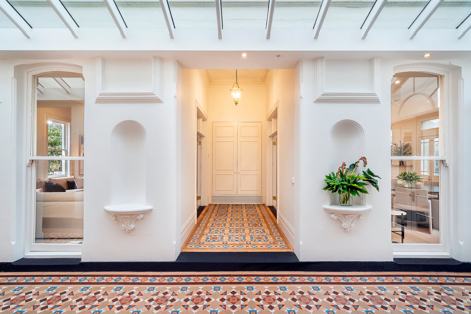 Serenely set behind a high walled landscaped private garden, a glass roofed atrium with the original tessellated tiles underfoot is an inspired separation between the living and accommodation zones. Beneath soaring ceilings, the expansive living room with a glorious marble fireplace is bathed in western light while the generous dining area and well-appointed Miele kitchen open to an undercover terrace ideal for outdoor dining. Overlooking the lush gardens, the main bedroom with built in robe and en suite is accompanied by two additional robed bedrooms, a study nook/library and bathroom.