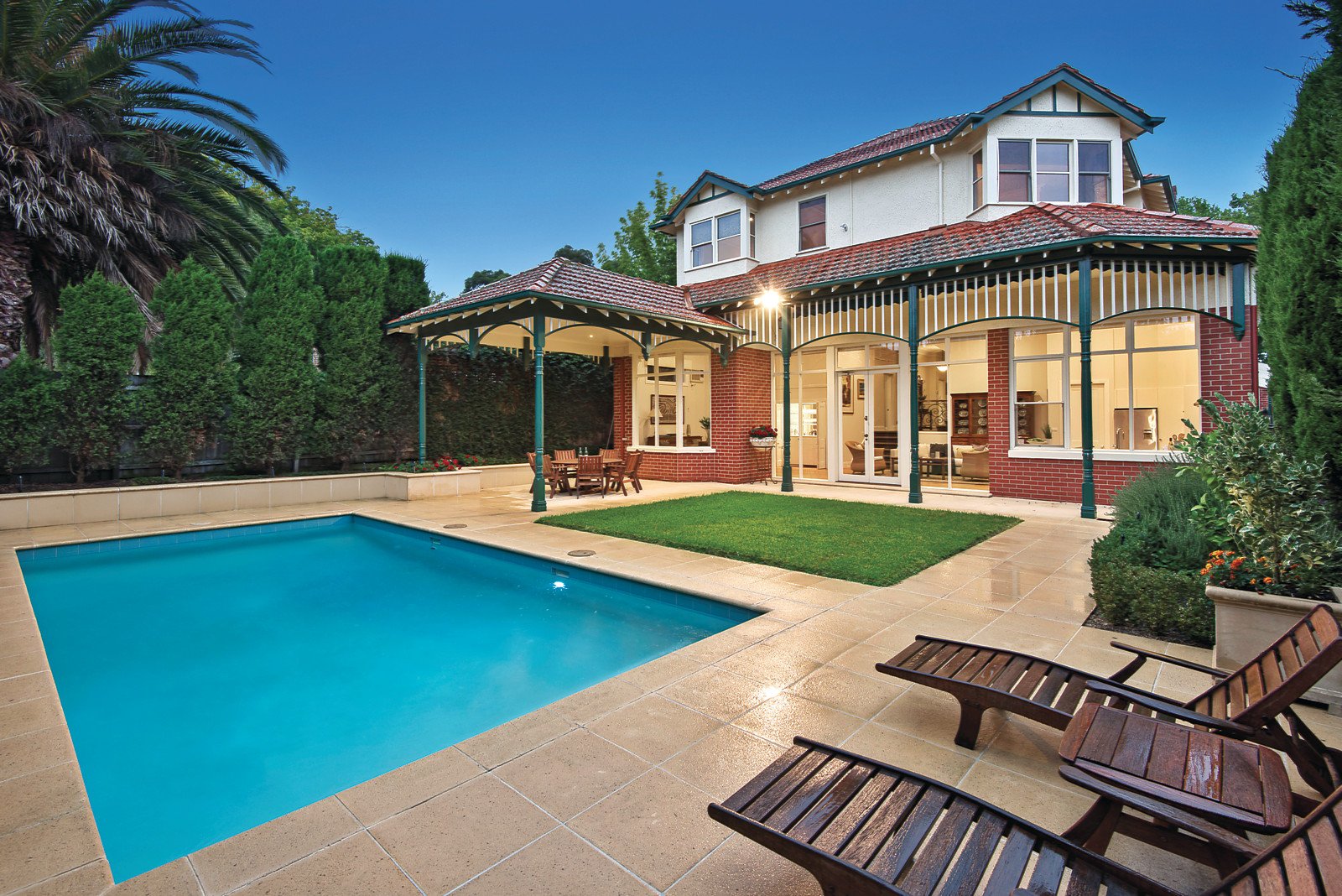 The interior features a wide entrance hall leading to a study with bay window, formal sitting and dining rooms, TV room, second study or fifth bedroom plus four upstairs bedrooms with WIRs, box bay windows, main with an ensuite and a fully-tiled family bathroom. The generous, light-filled informal living and dining areas with concealed bar and wide oak floors incorporates a superbly appointed Miele and Zug kitchen plus adjoining powder room and laundry with drying cupboard and chute. All flowing to a covered outdoor dining area overlooking a private garden and solar heated pool - perfect for family relaxation and enjoyment. Other features include alarm, ducted heating & vacuum, cooling, cellar, remote blinds, abundant storage internal & garage, auto gates and double garage.