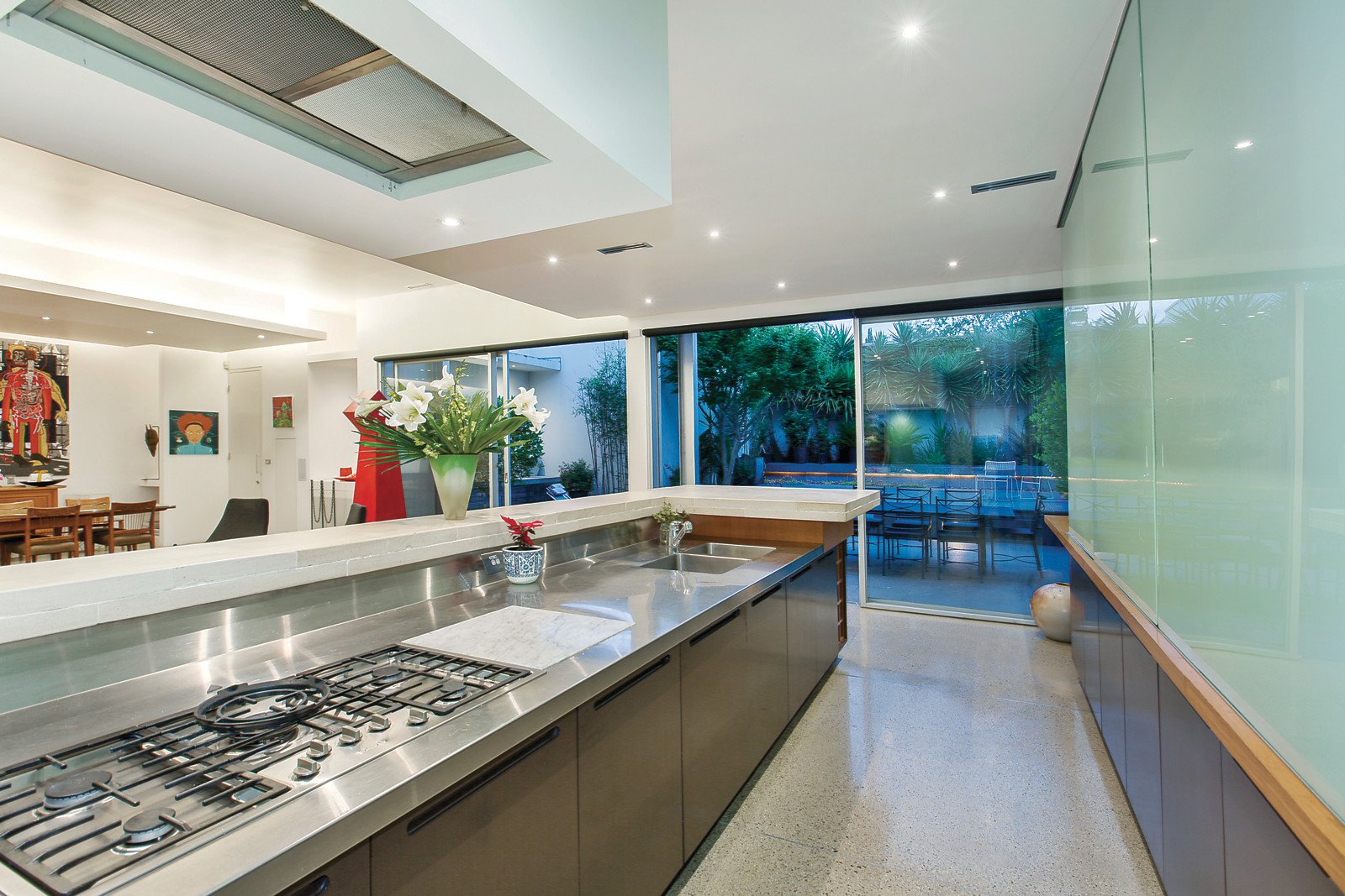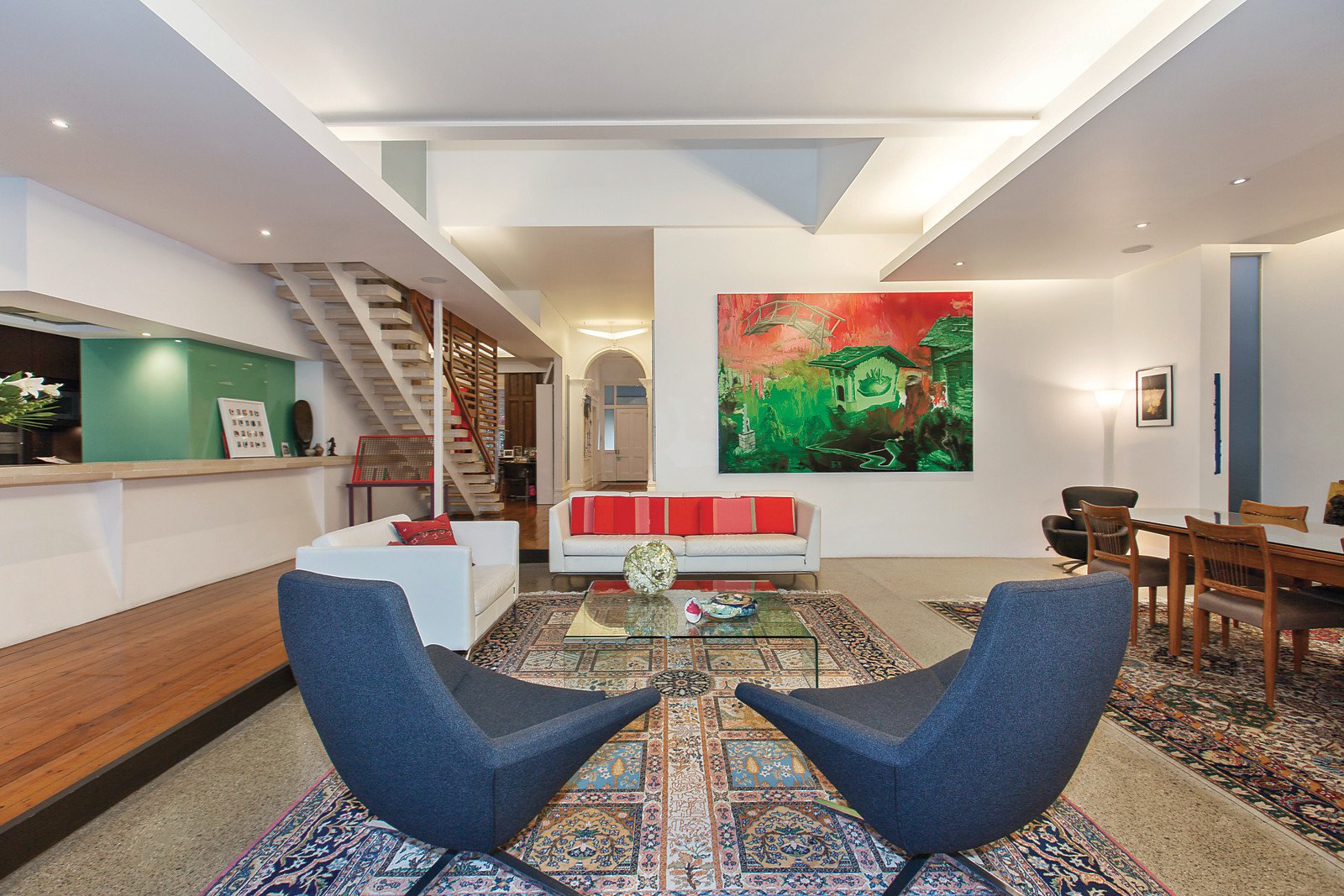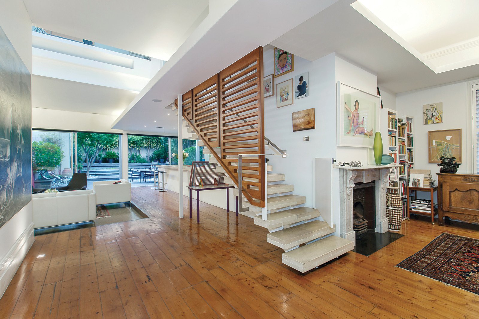 The wide bougainvillea covered tessellated verandah reveals a majestic arched entrance hall boasting Baltic pine floors which flow through to an impressive sitting room and refined library, both with marble gas fireplaces. A dramatic double height sky-lit void accentuates the expansive scale of the sensational living and dining room featuring recessed mood lighting and polished concrete floors. Both the impeccably appointed gourmet kitchen and the picturesque northeast private landscaped garden with built in BBQ reflect Japanese design themes. The beautiful main bedroom with marble gas fireplace, walk-in-robe and ensuite and a fitted home office are on the ground level while three light-filled double bedrooms with sunny balconies, built-in-robes and desks and a stylish bathroom are upstairs.