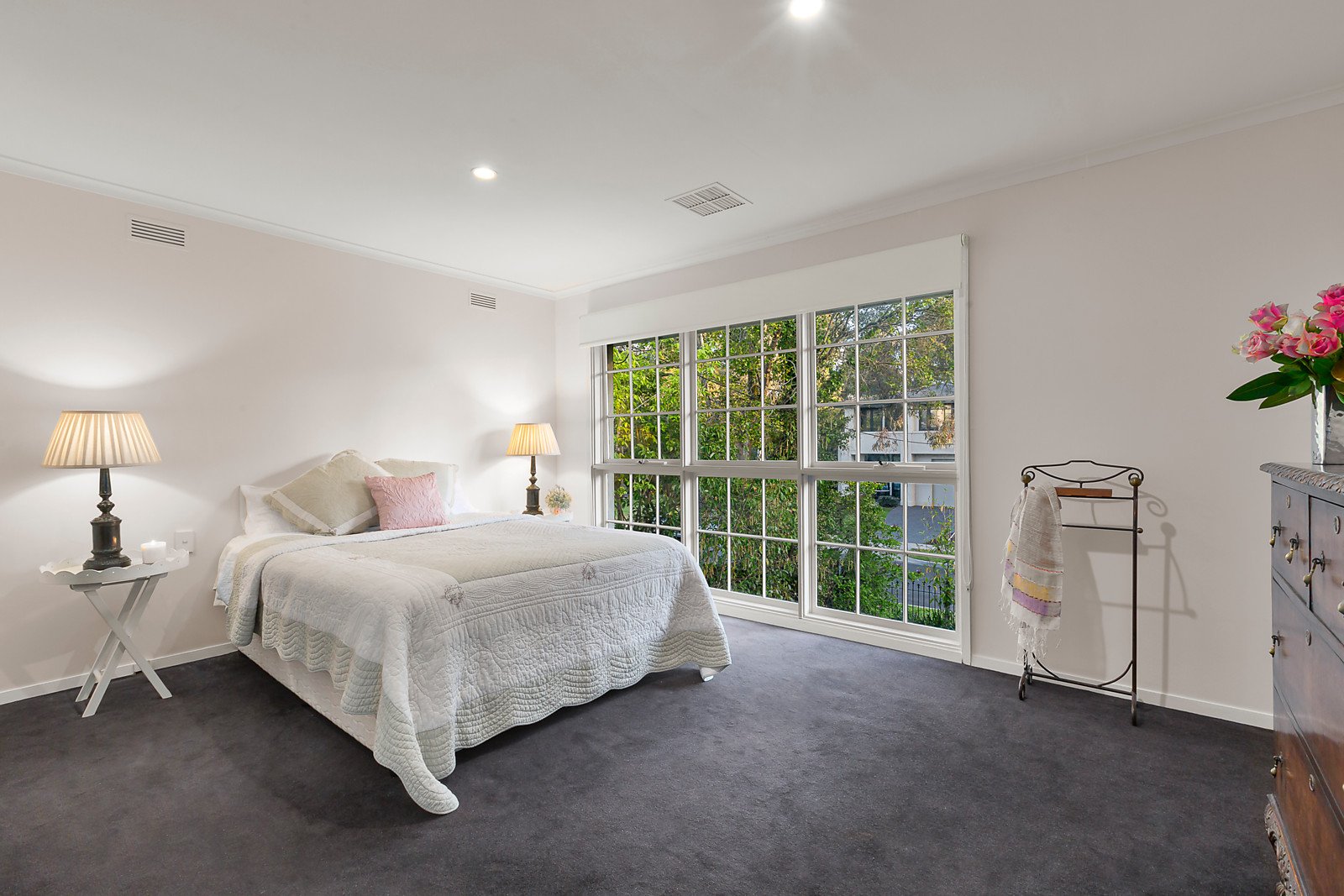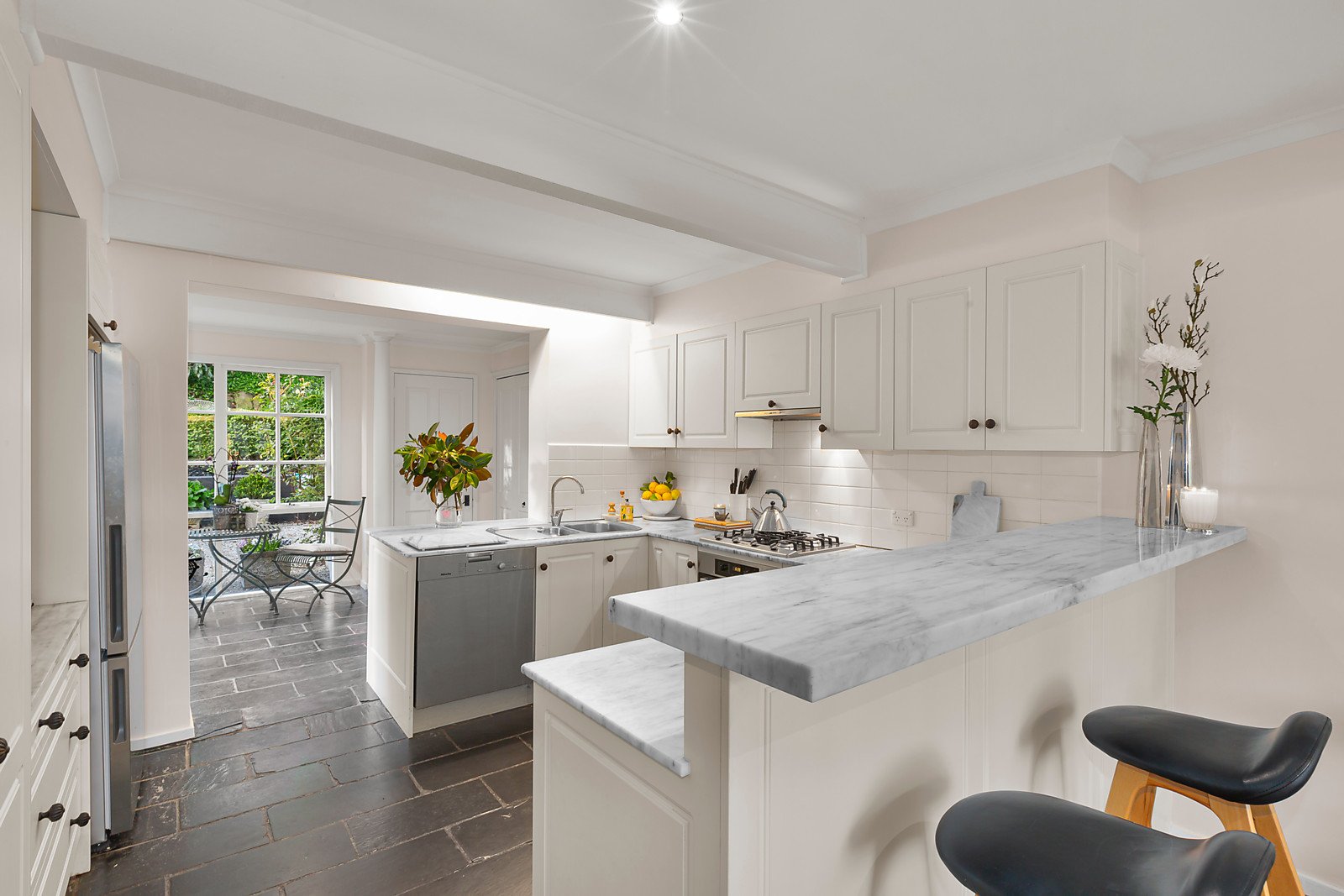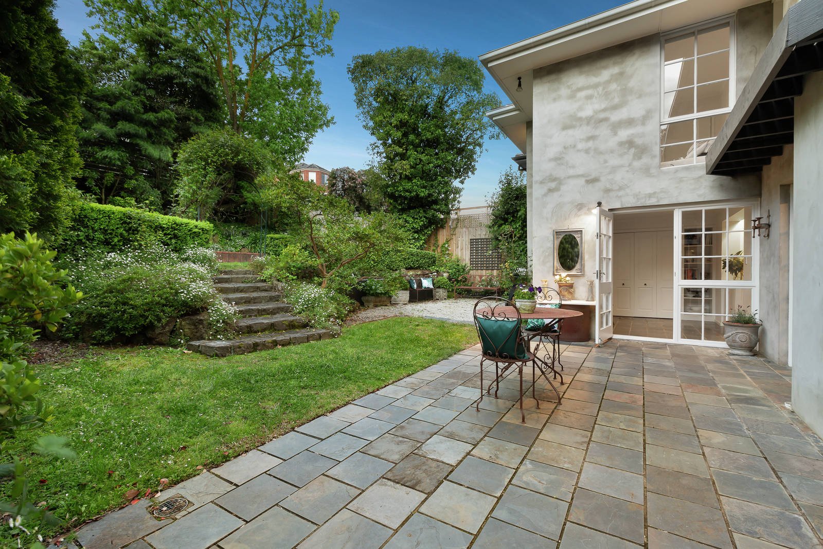 A picturesque setting amongst captivating gardens affords every room a glorious leafy outlook. The central hall introduces a refined sitting room with gas fire and a beautifully spacious dining room opening through French doors to the deep private north garden with a solar heated pool surrounded by greenery. The living room and casual dining room are either side of a gourmet Miele kitchen boasting marble benches. Light-filled family accommodation upstairs comprises the impressive main bedroom with en suite and walk in robe, three additional bedrooms with built in robes and a second bright bathroom and study area. Includes powder-room, Euro-laundry and off street parking.