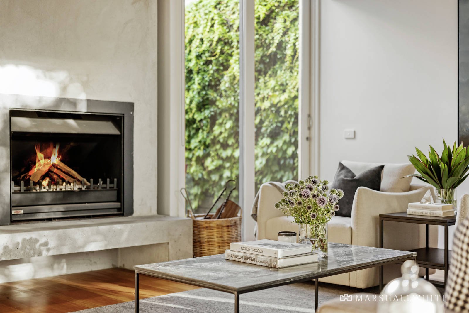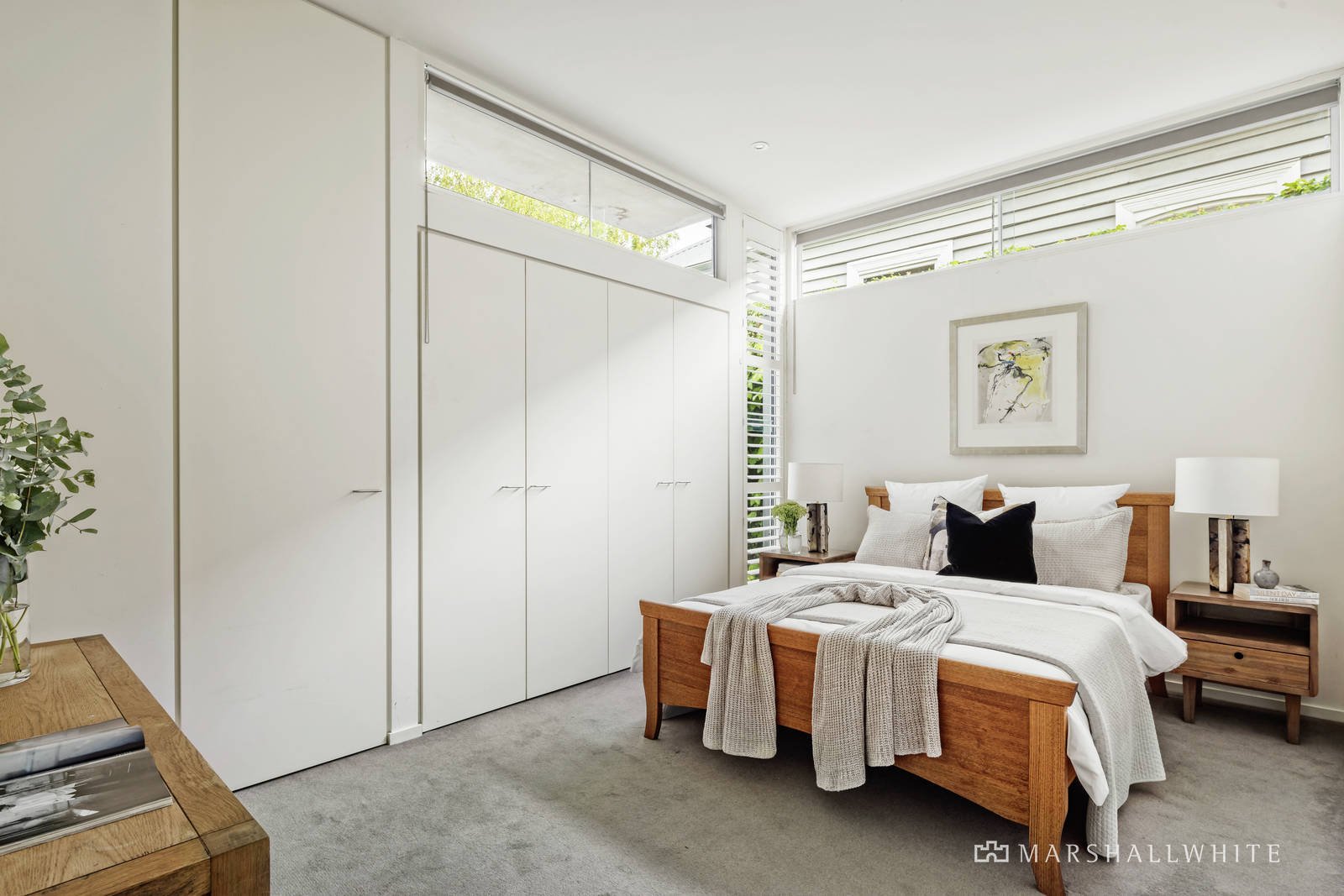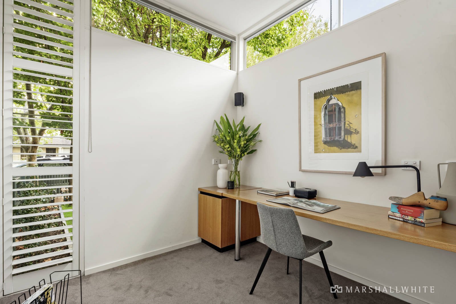 High ceilings and full height doors accentuate the wonderful feeling of space while unified finishes including Silky Oak joinery highlights the contemporary refinement throughout. The wide entrance hall introduces a tranquil fitted home office, a double bedroom with built in robe and stylish bathroom while a second spacious bedroom upstairs includes a designer en suite, built in robe and fitted study nook. Timber floors flow through the gourmet kitchen appointed with stainless steel benches and Bosch appliances and an inviting dining room. The expansive and light-filled living room with an open fire set on a concrete plinth opens to both a central courtyard and the peaceful private northwest garden with a large stone paved terrace surrounded by greenery.