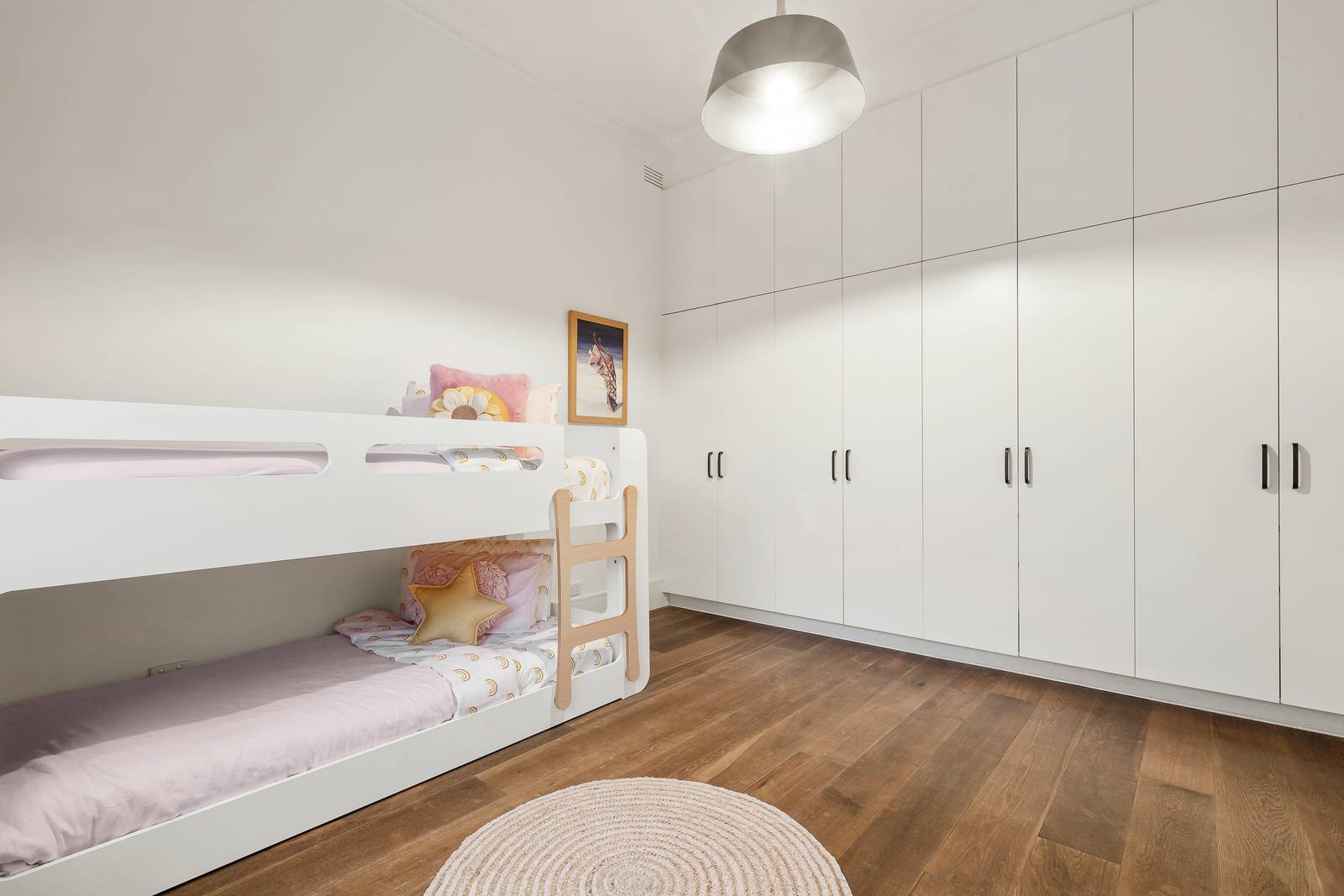 Dark-stained oak floors and high ceilings define the wide central hall, two generous bedrooms with floor to ceiling robes, a third bedroom and stylish bathroom with separate powder-room. The expansive living room and light-filled dining room are served by a superbly appointed modern kitchen with timber benches. The living spaces open to a large, covered terrace overlooking the deep private north-facing garden offering plenty of room for a possible extension (STCA).