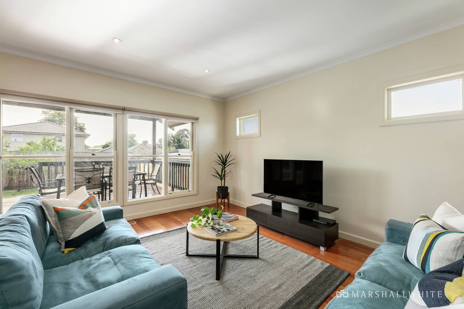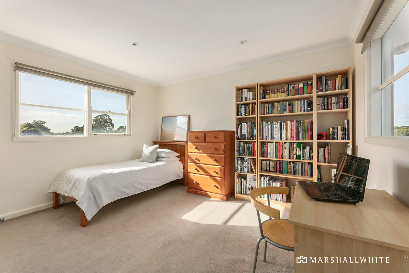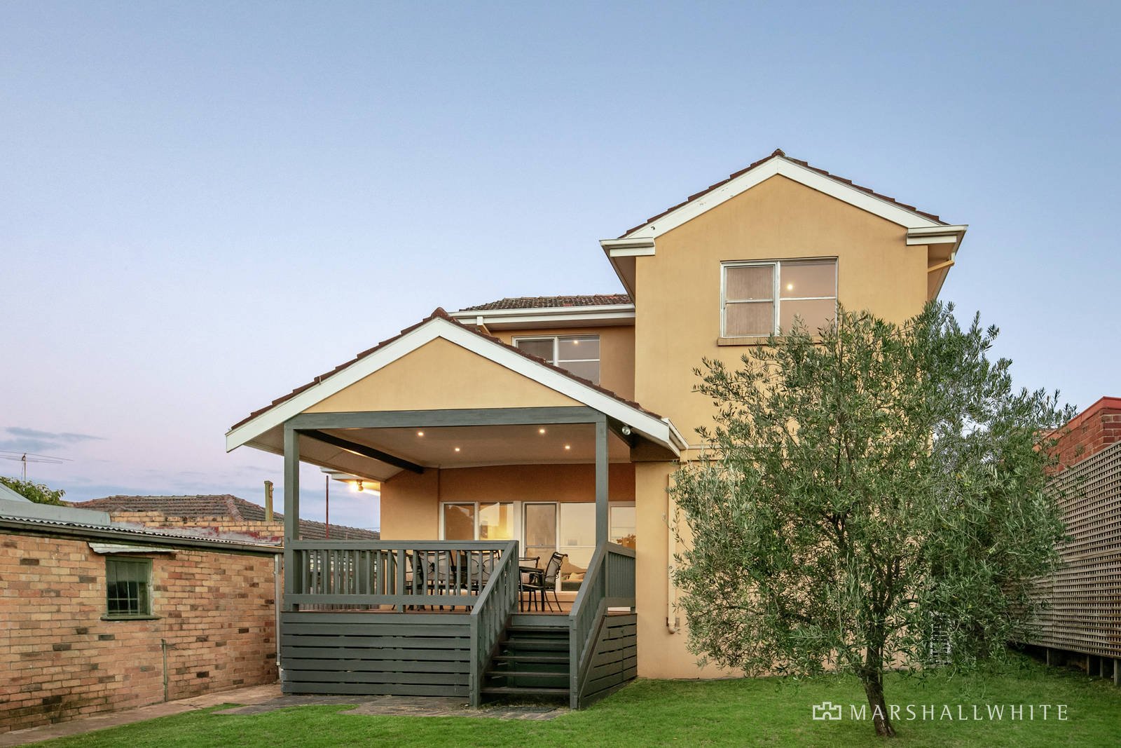 The welcoming entrance hall introduces a living/dining room with open fire and a well-equipped kitchen. Timber floors flow through a home office and family room opening to a large undercover deck overlooking the private north/west-facing rear garden. Two downstairs bedrooms with built-in robes and a modern bathroom are matched upstairs by two additional double bedrooms with robes, second bathroom and teenage retreat offering city glimpses.