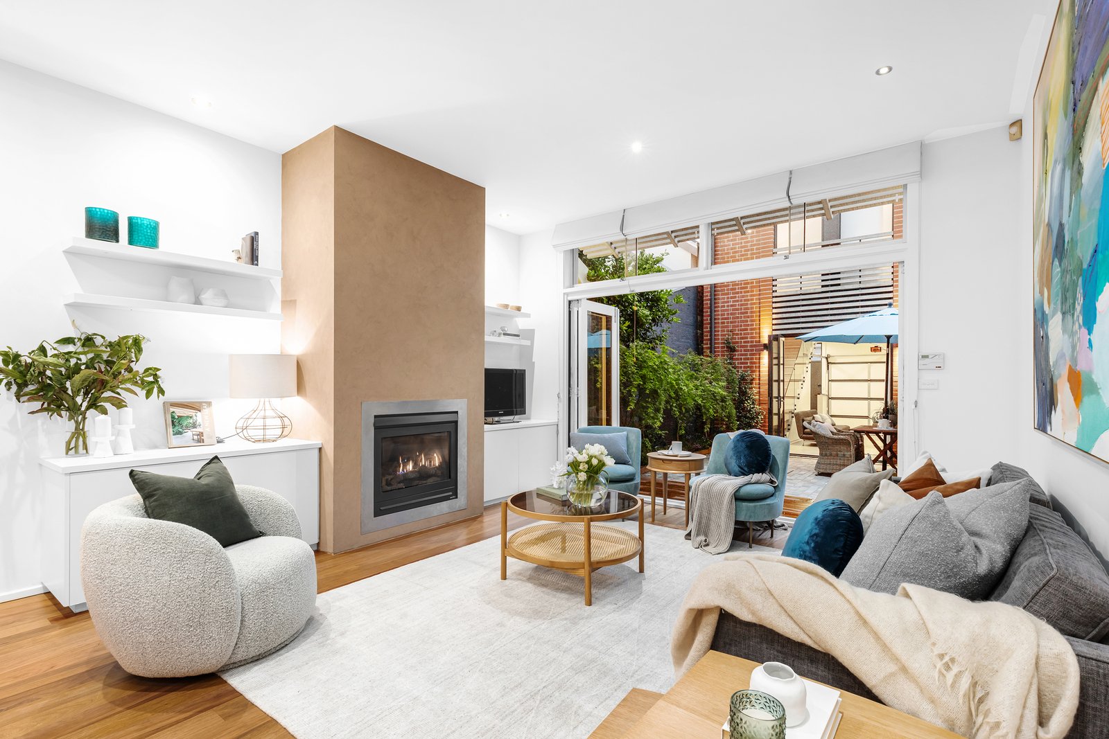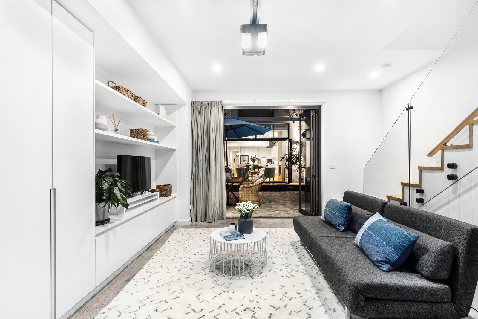 Richly toned timber floors and high square-set ceilings flow through the long hallway, leading directly to the open-plan living and dining areas at the rear. Crafted to embrace natural light at every turn, it features a double-height void above the dining zone and bi-fold doors that extend to a landscaped garden terrace paved with cobblestones. The seamless transition from the living room, complete with an ambient gas fireplace, enhances the overall sense of openness and warmth, enriched by the kitchen with stone benchtops, Smeg appliances and an island bench, perfect for hosting.