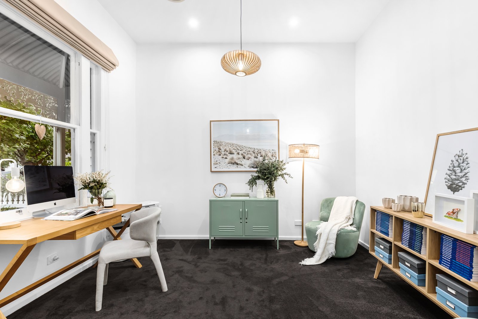 The well-designed layout encompasses four spacious bedrooms with robes and two bathrooms spread across both levels. Adding to the allure, a remarkable, self-contained rear studio introduces an entirely private and double-glazed sanctuary for guests or those working from home, with an upper-level fifth bedroom or office complete with robes, a convenient kitchenette, a striking ensuite bathroom, and heating/cooling. There's even separate pedestrian access from Carter Street for guest purposes, with the single garage doubling as a living room with polished concrete flooring and in-built media storage.