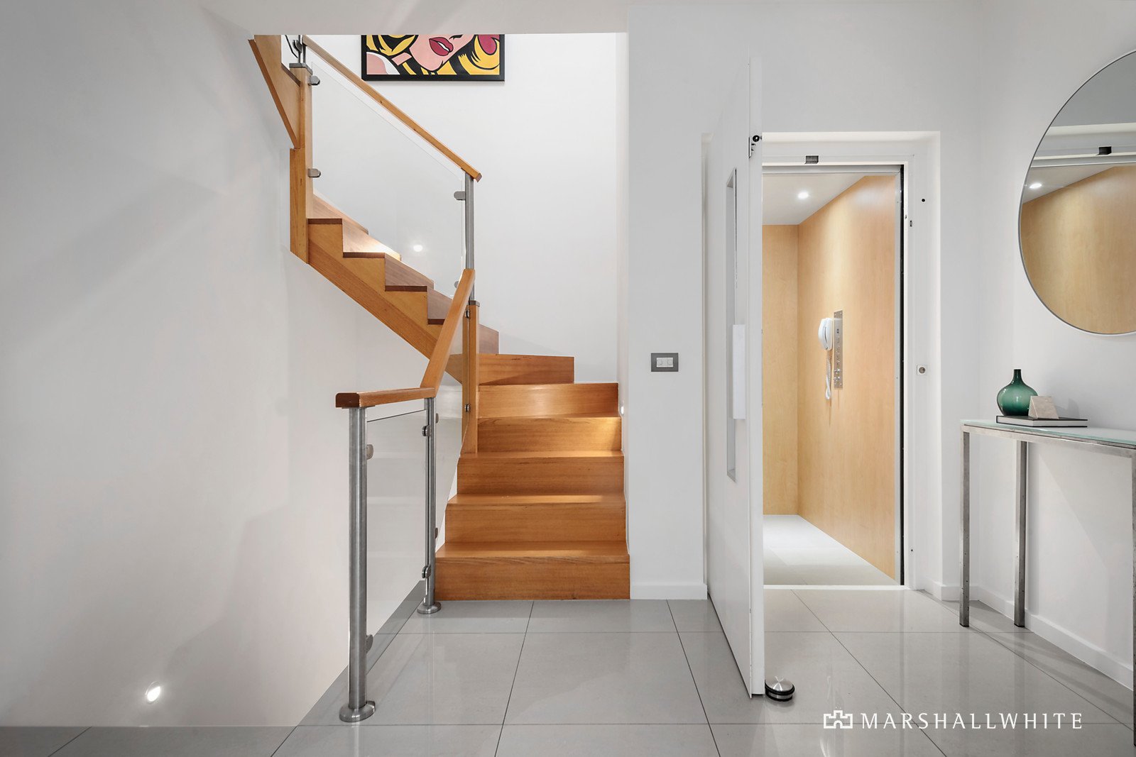 The mid-level comprises four bedrooms (or three plus study) including the spacious master with automated blinds, walk-through robe and ensuite with a luxe double spa bath, walk-in rain head shower and twin stone vanities. The living area on this level has a handy kitchenette, and there is a gas log fire heater. With plenty of additional space for a workshop/gym or boat/trailer parking, the extra-large remote-operated basement-level double garage provides seamless access to the lift or stairs.